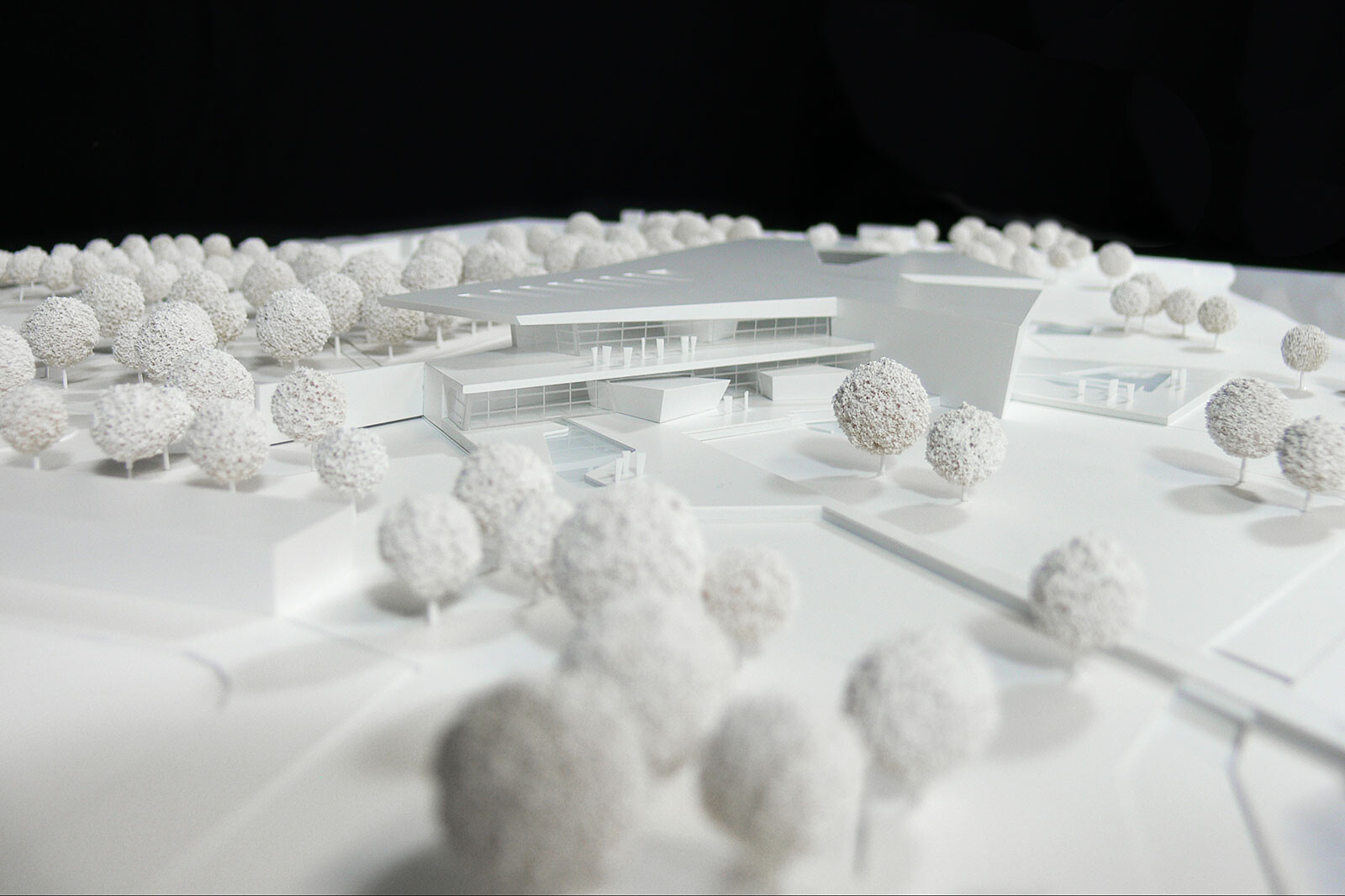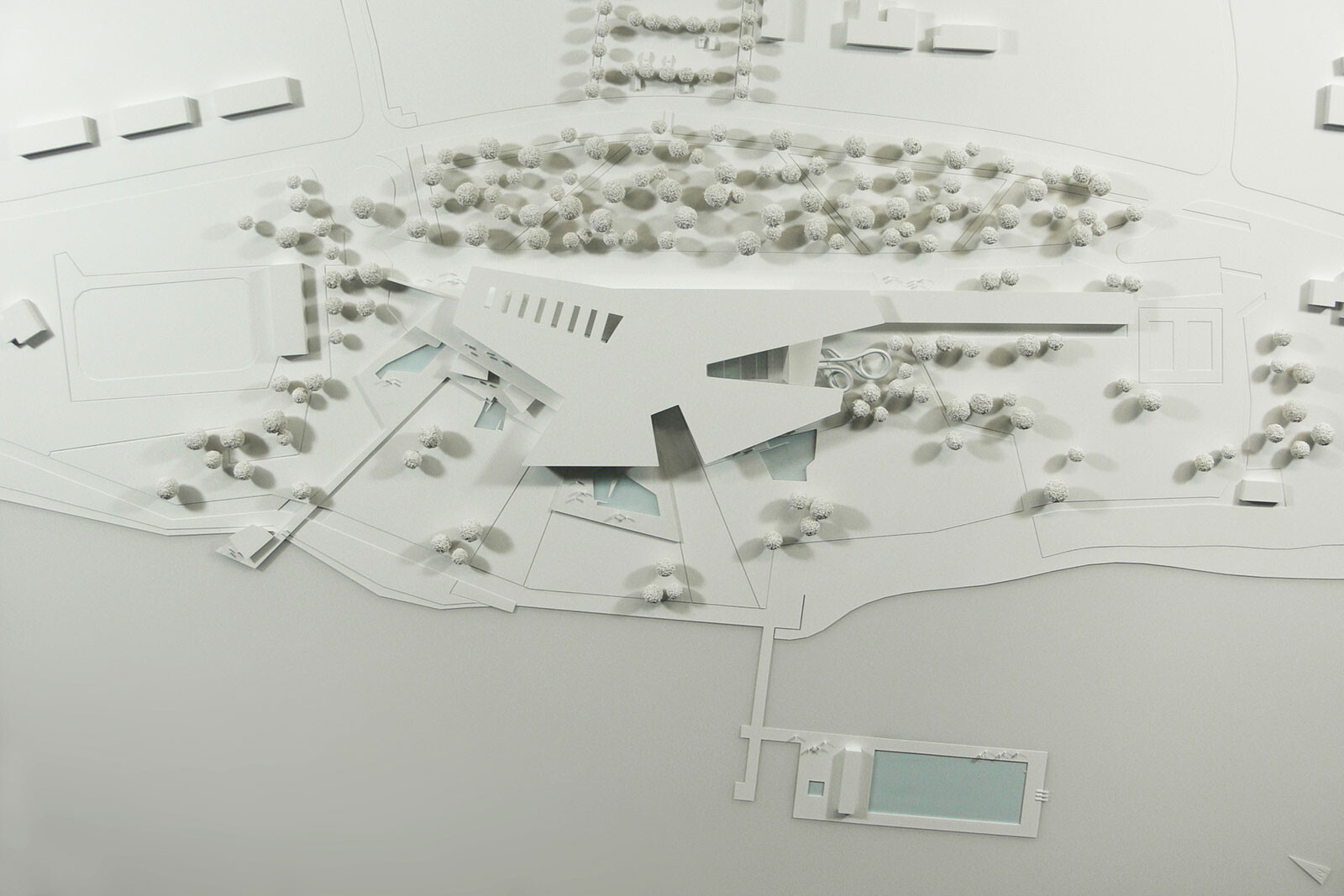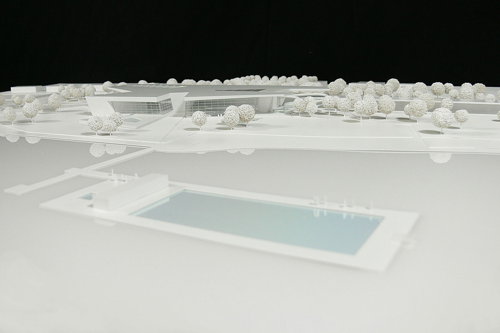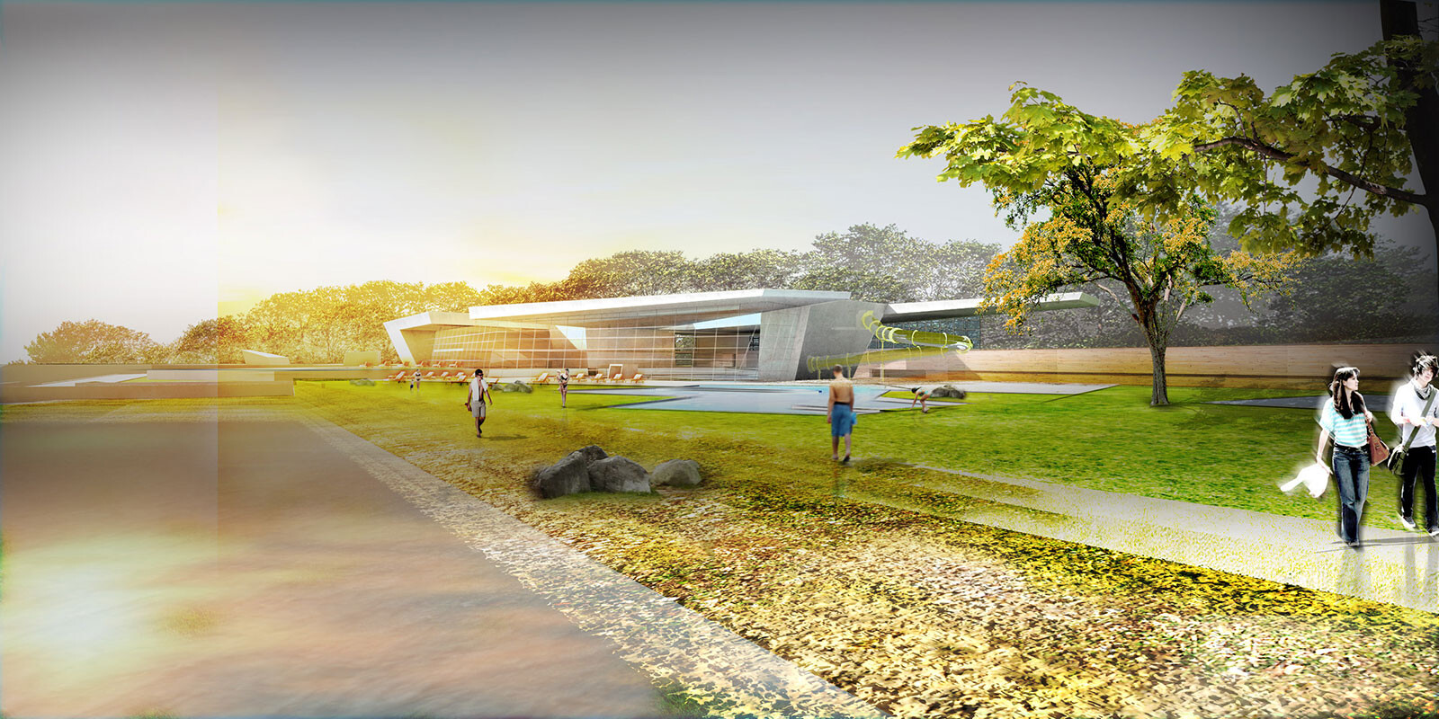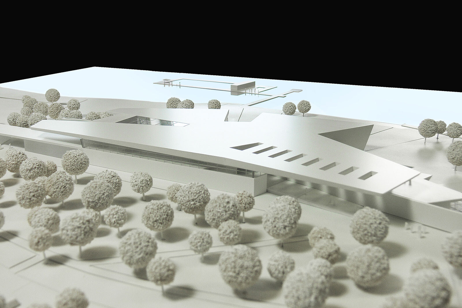 Das in drei Teile gegliederte Gebäude beinhaltet die Bereiche Familien- und Freizeitbad, Thermal- und Vitalbad, Sauna und Wellness. Der Eingangsbereich und der Umkleidetrakt bilden das Rückgrat nach Norden. Der Familien-, Sport-und Freizeitbereich orientiert sich zur Liegewiese und zum Strandbad. Der Badebereich ist auf der vorhandenen Geländehöhe angeordnet und ist vom Freibad zu begehen. Die übrigen Bereiche sind aus Gründen der Grundwassersituation gegenüber dem bestehenden Grundstück angehoben. Es besteht die Möglichkeit, die Fassade zur Liegewiese hin großflächig zu öffnen. Darüber hinaus kann das Glasdach über dem Sportbecken im Sommer und in sternklaren Nächten aufgefahren werden. Den mittleren Bereich bildet das Thermalbad mit großem Innen- und Außenbecken sowie Salzgrotte, Textilsauna, Solebecken und Whirlpool. Um den Pool herum sind großzügige Liegeflächen mit Bezug nach außen vorgesehen. Der Saunabereich ist leicht nach Westen orientiert und ist über den Thermalbereich zugänglich. Um die verschiedenen Saunakabinen und Dampfbäder herum sind Liegebereiche mit unterschiedlichen Qualitäten angeordnet. Im Obergeschoss der Sauna befinden sich weitere Ruhebereiche mit einem Kaminzimmer und dem vorgelagerten Dachgarten. Das nach Süden ausgerichtete Ufergrundstück mit altem Baumbestand stellt einen landschaftlich besonders sensiblen Bereich dar. Das neue Gebäude wird an der Stelle des bestehenden Freibades positioniert. Der östliche Bereich des Grundstücks soll weiterhin als Strand- und Freibad genutzt werden. Das Gebäude ist in die Landschaft eingebettet – wie eine Steinscholle liegt das Bad im Grünen. Die tiefen Einschnitte in der Dachscholle gliedern den Baukörper und schaffen wichtige Außenbezüge. Die gesamte Anlage öffnet sich nach Süden zum Seeufer und bietet eine fantastische Aussicht auf die Bergwelt und den Bodensee.
