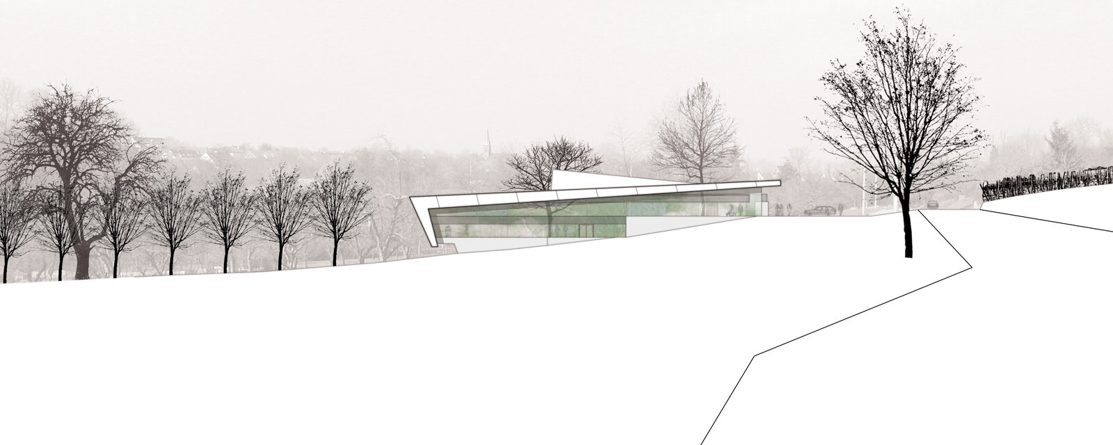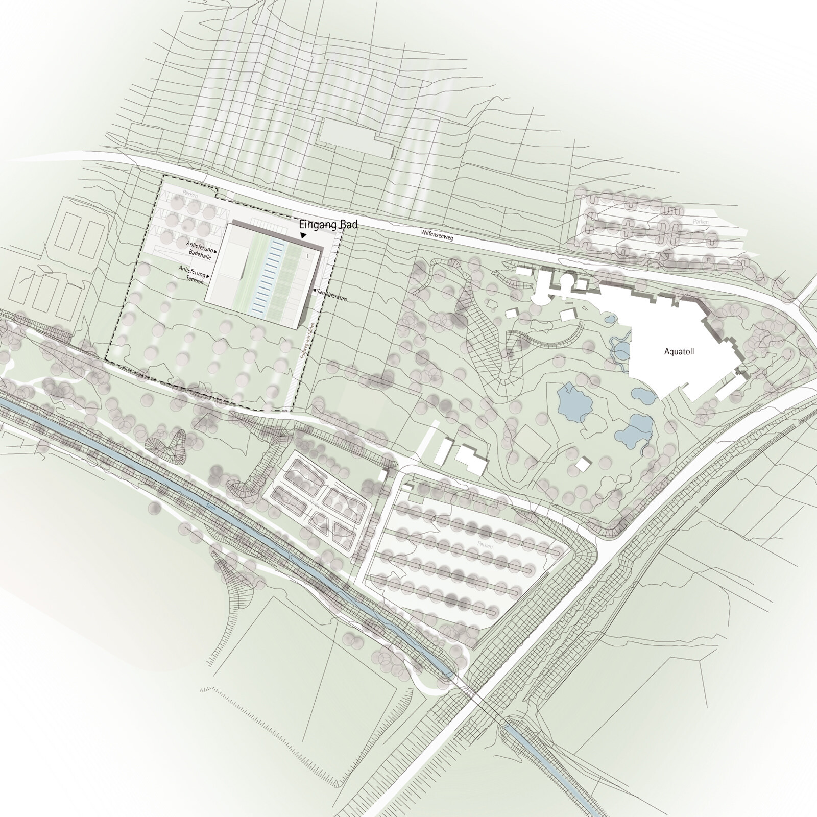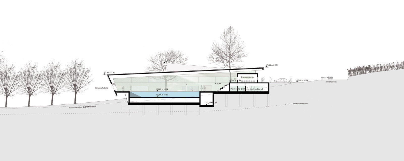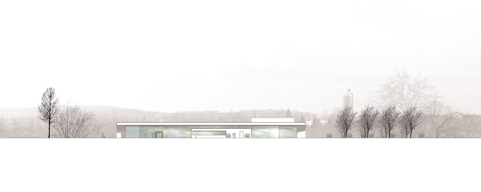 Die Idee unseres Entwurfs ist die Einbindung des Gebäudes in die Landschaft, die Verbindung der Elemente des Badens mit den Elementen der umgebenden Kulturlandschaft. Das Bild eines Badetuchs, das auf die Landschaft des Sulmtals gelegt wird und in dem sich die linearen Landschaftsstrukturen der Weinberge und Obstwiesen durchzeichnen, ist das Thema. Das neue Hallensportbad nimmt dieses Thema auf und modelliert sich in die Landschaft ein. Die Ausrichtung des Gebäudes, der Verlauf der Dachkante und die Außenanlagen fügen sich den bestehenden Strukturen.