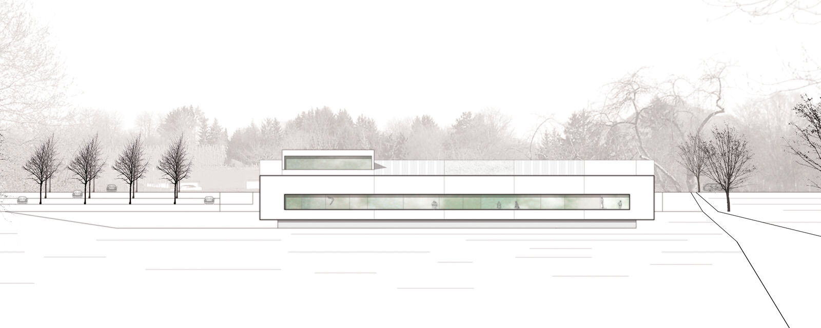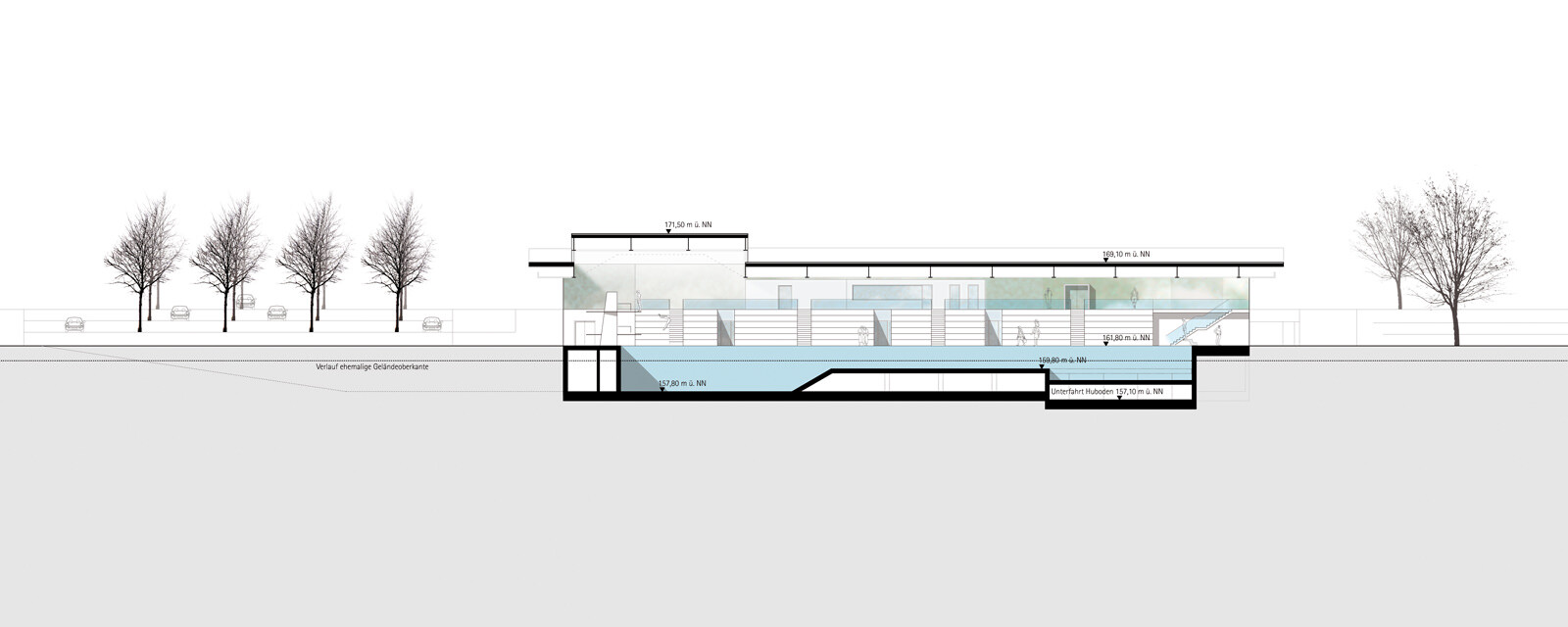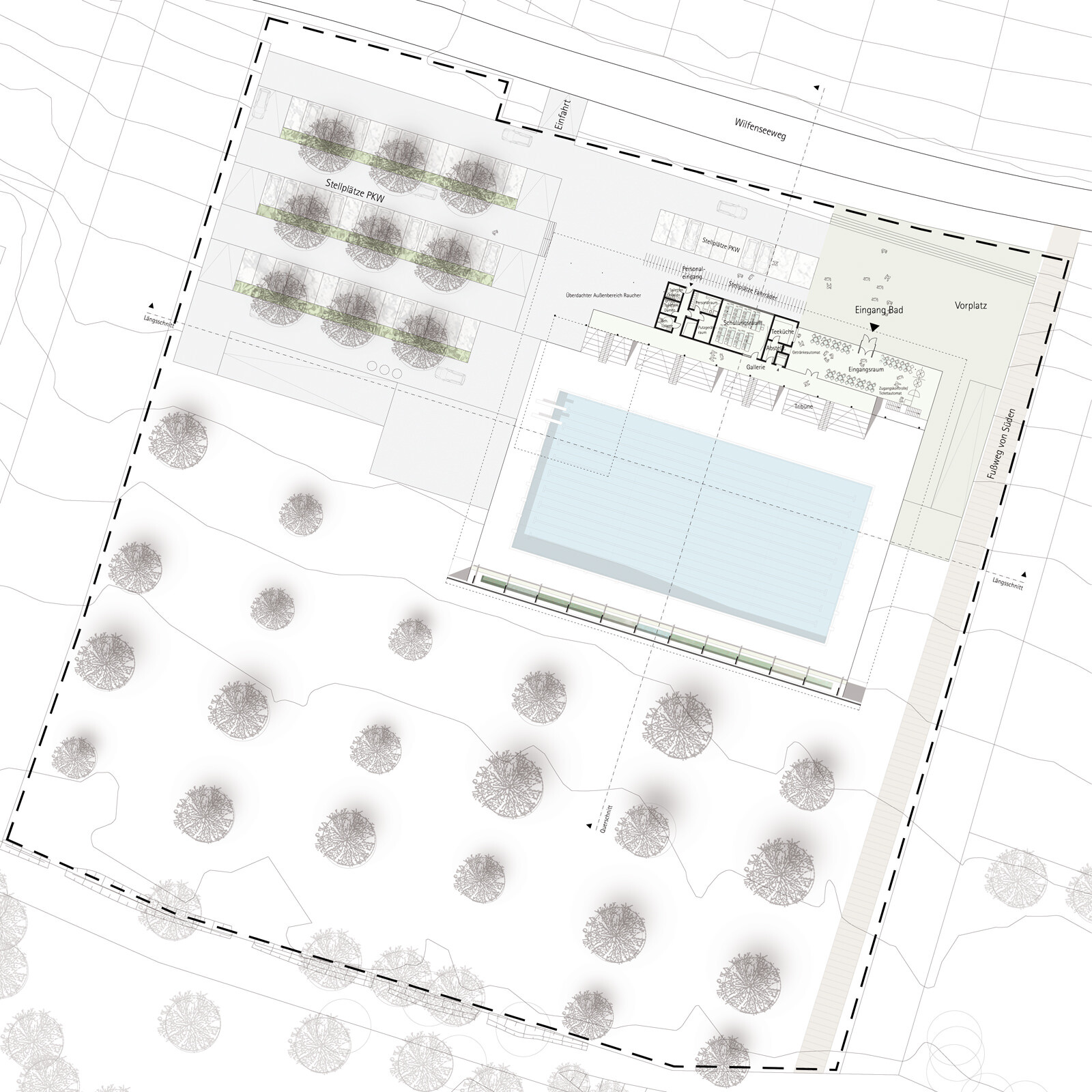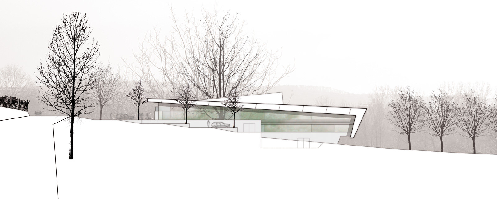 Die Idee unseres Entwurfs ist die Einbindung des Gebäudes in die Landschaft, die Verbindung der Elemente des Badens mit den Elementen der umgebenden Kulturlandschaft. Das Bild eines Badetuchs, das auf die Landschaft des Sulmtals gelegt wird und in dem sich die linearen Landschaftsstrukturen der Weinberge und Obstwiesen durchzeichnen, ist das Thema. Das neue Hallensportbad nimmt dieses Thema auf und modelliert sich in die Landschaft ein. Die Ausrichtung des Gebäudes, der Verlauf der Dachkante und die Außenanlagen fügen sich den bestehenden Strukturen.
