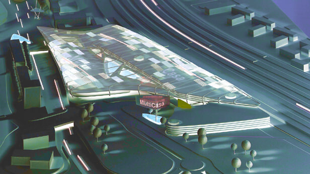 Das Grundstück für die Shopping-Mall liegt im Zentrum von Duisburg zwischen der BAB 59 und der Transrapidstrecke. Die am Standort vorherrschende Bewegung und Dynamik setzt sich im MultiCasa als langes, flaches und organisch geformtes Gebäude fort. Offen und lichtdurchflutetet verbindet das Gebäude Bahnhof und Innenstadt vermiteinander. Das MultiCasa erhält als Zeichen "Landmarke" ein eigenständiges und selbstbewusstes Erscheinungsbild. Durch seine expressive und moderne Formensprache wird das MultiCasa zum Wahrzeichen eines "Neuen Duisburg".