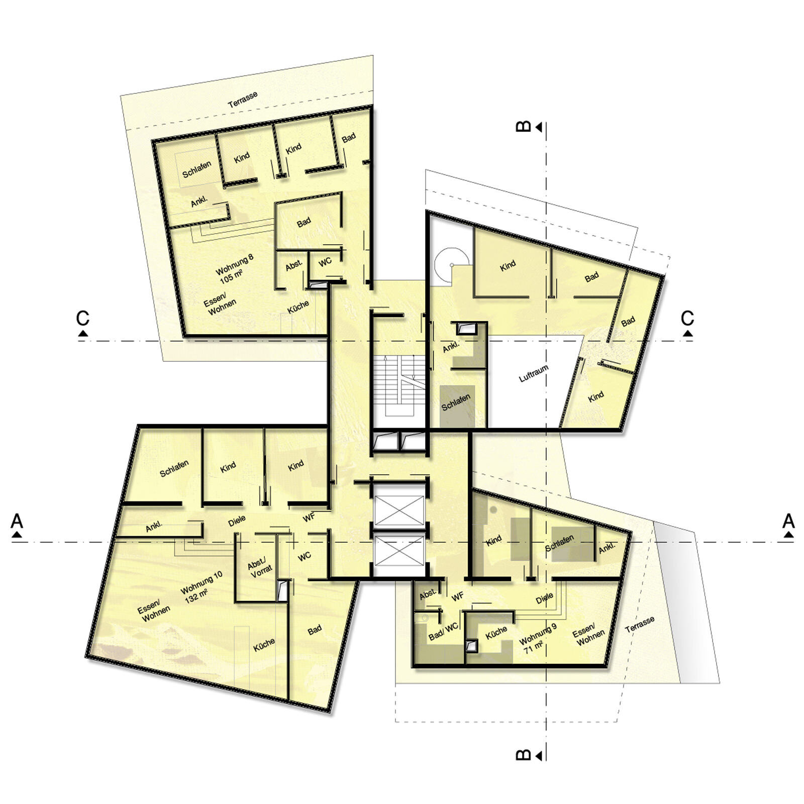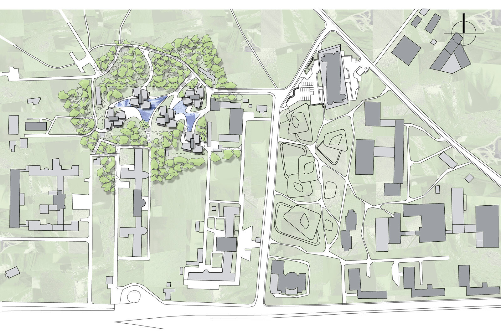 Das Baugebiet liegt am nord-westlichen Rand Moskaus. Die fünf Wohngebäude gruppieren sich um ein gemeinsames Zentrum - eine Parklandschaft im Stil eines englischen Landschaftsgartens. Jedes der 11-geschossigen Häuser beinhaltet 35 Wohnungen in der Größe von 70 bis 170 m².