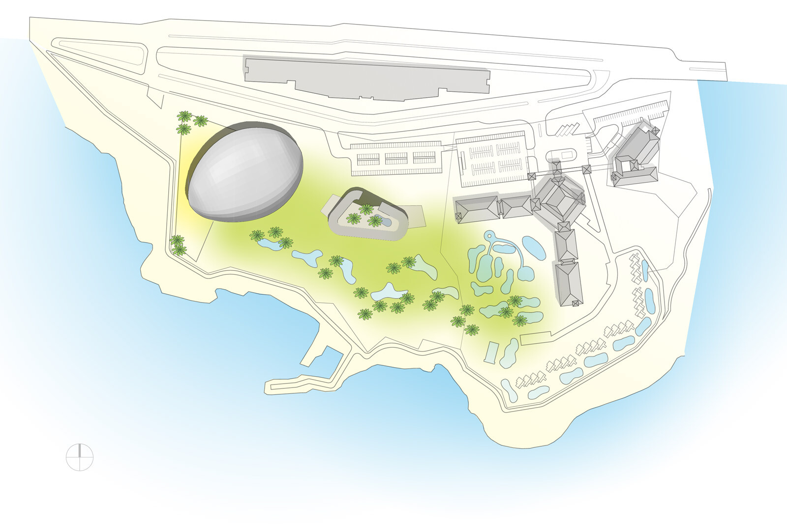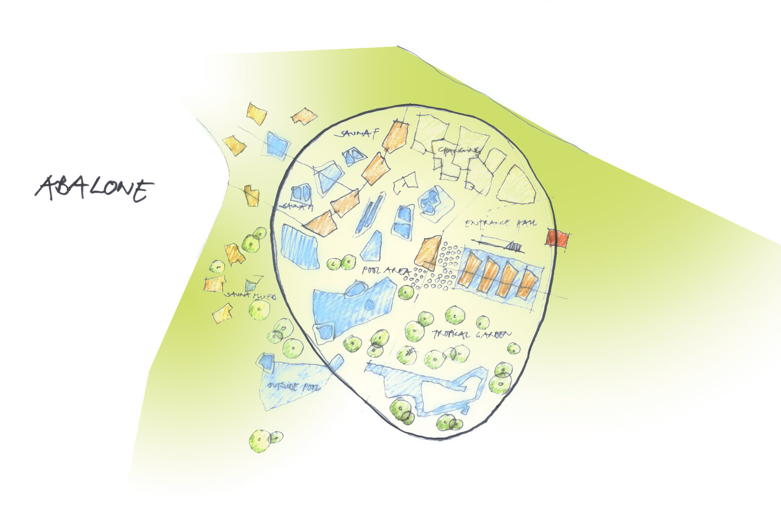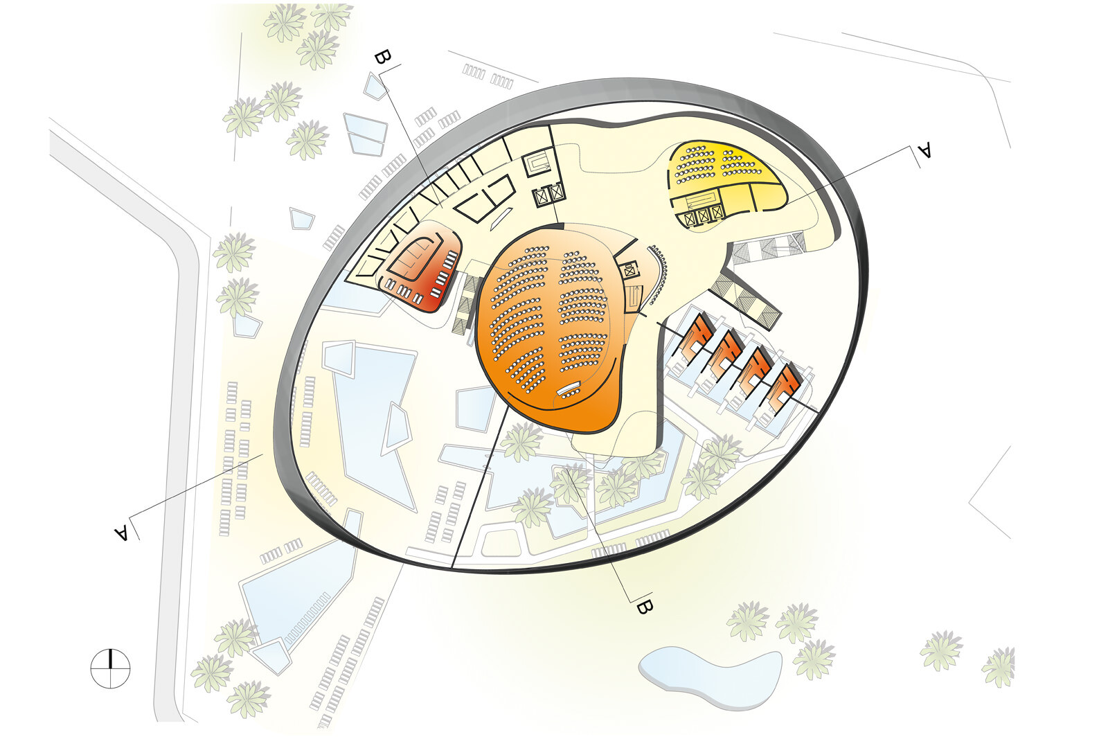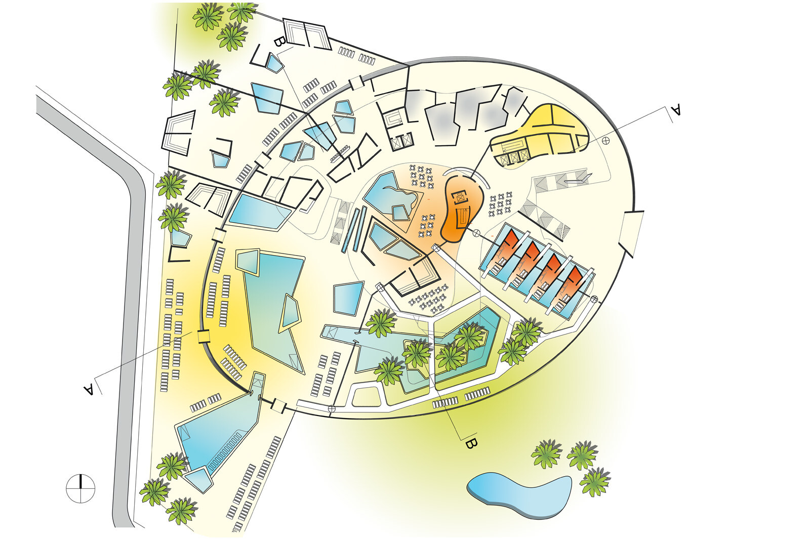Die große, muschelförmige Hülle beinhaltet die drei Hauptbereiche des Shineville Resorts: Badelandschaft, Kongresszentrum und Tropischer Garten. Die Badelandschaft bietet auf über 6000 m² Thermal- und Meerwasserbecken, Sauna- und SPA-Bereiche sowie Restaurant. Kongress- und Thermalbadbereiche sind zum tropischen Garten hin orientiert. Der Hotelbereich ist der Thermalbad-"Muschel" angegliedert.