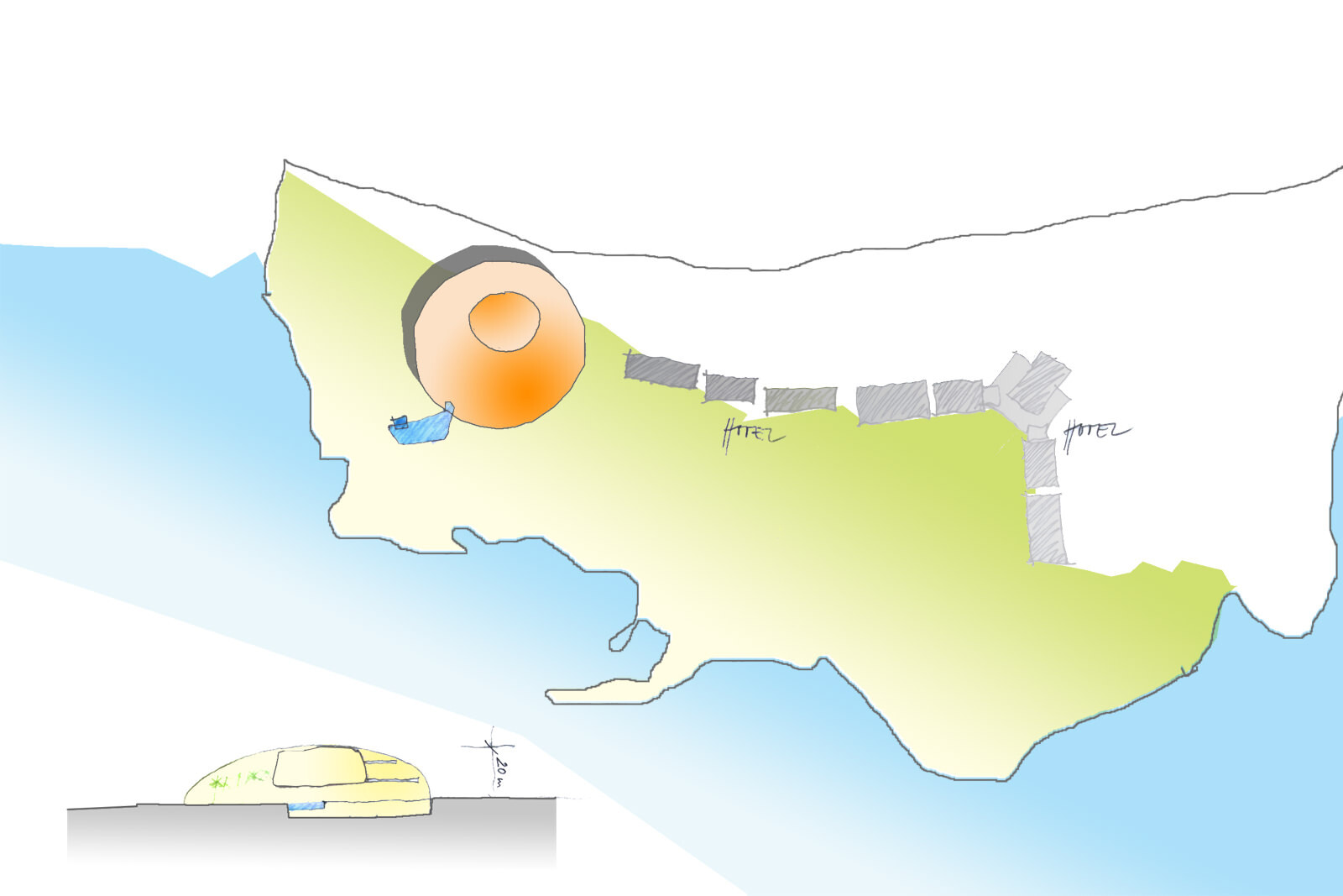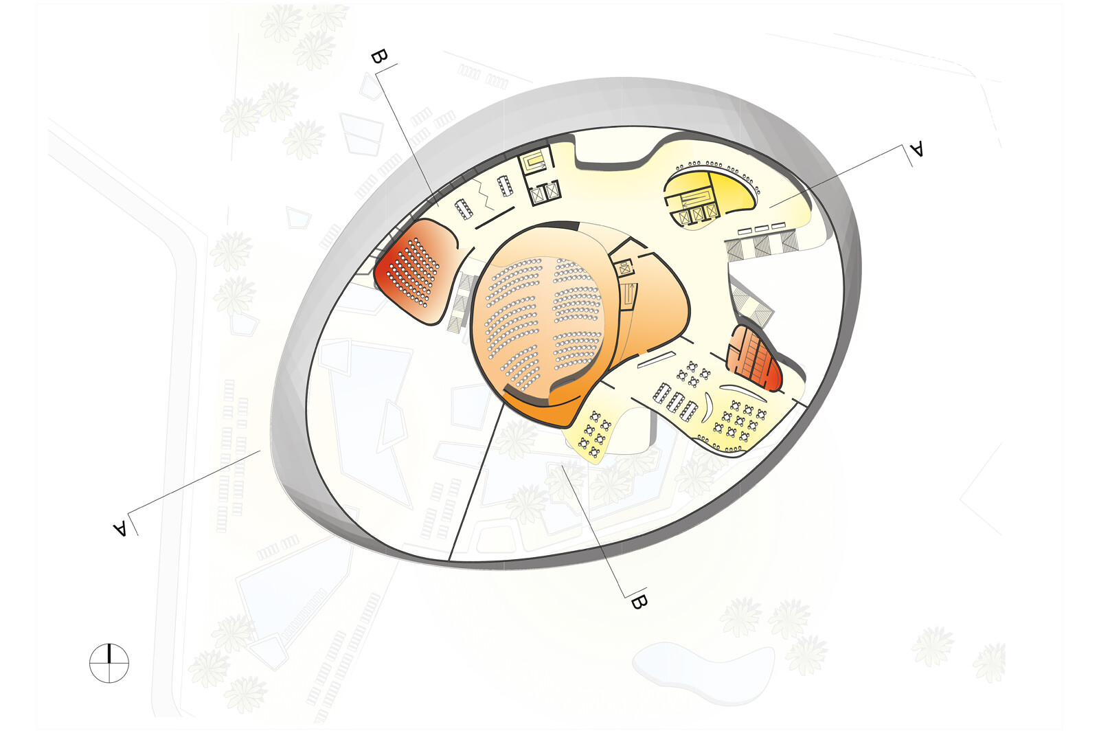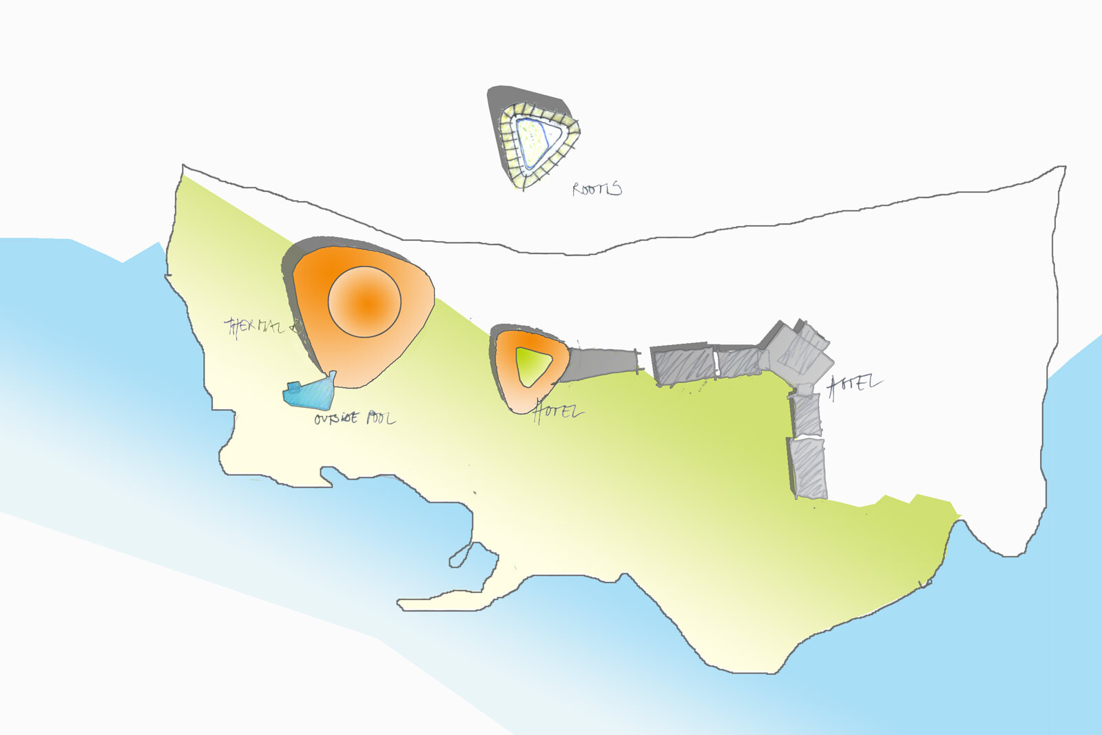 Die große, muschelförmige Hülle beinhaltet die drei Hauptbereiche des Shineville Resorts: Badelandschaft, Kongresszentrum und Tropischer Garten. Die Badelandschaft bietet auf über 6000 m² Thermal- und Meerwasserbecken, Sauna- und SPA-Bereiche sowie Restaurant. Kongress- und Thermalbadbereiche sind zum tropischen Garten hin orientiert. Der Hotelbereich ist der Thermalbad-"Muschel" angegliedert.