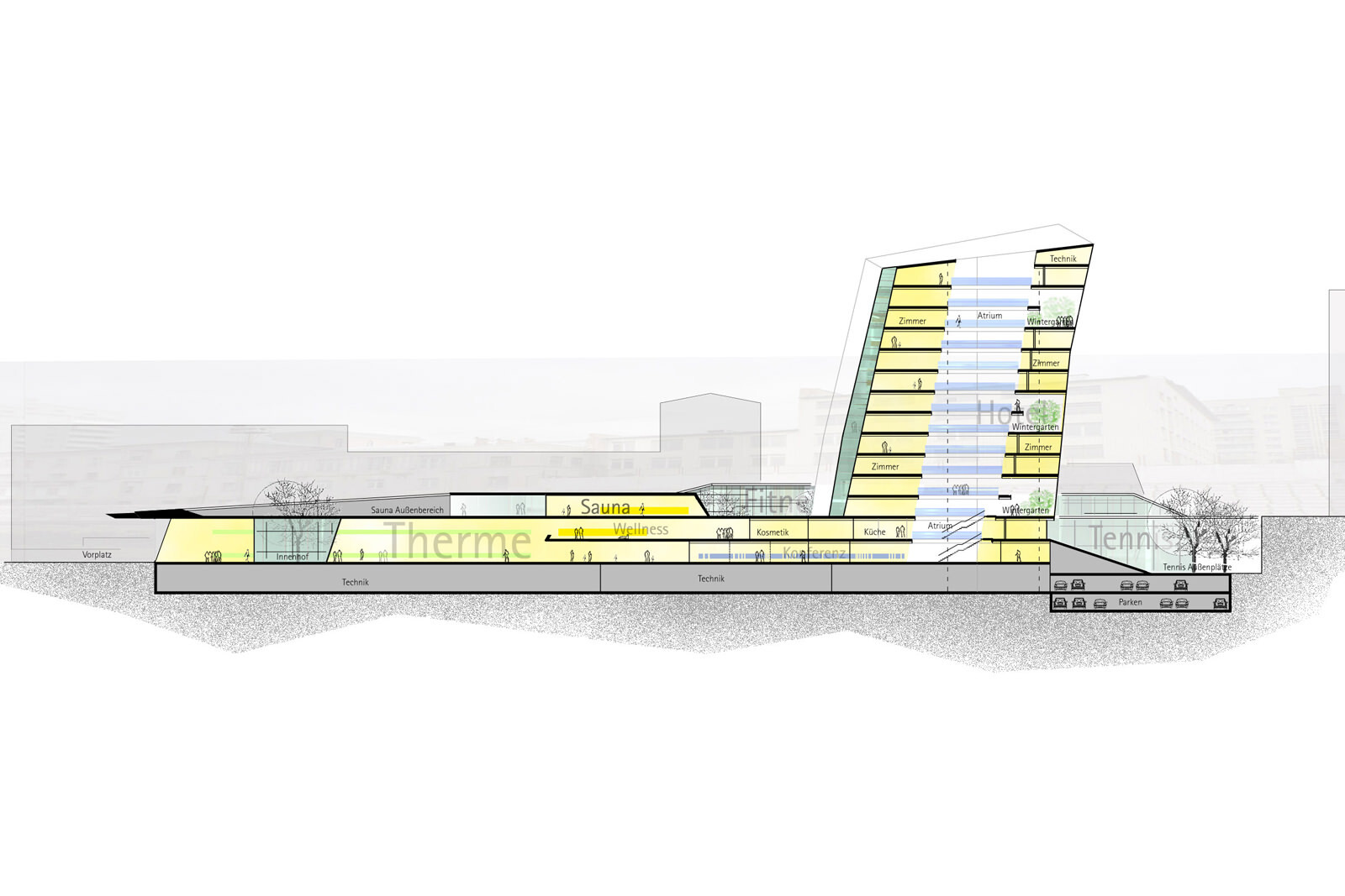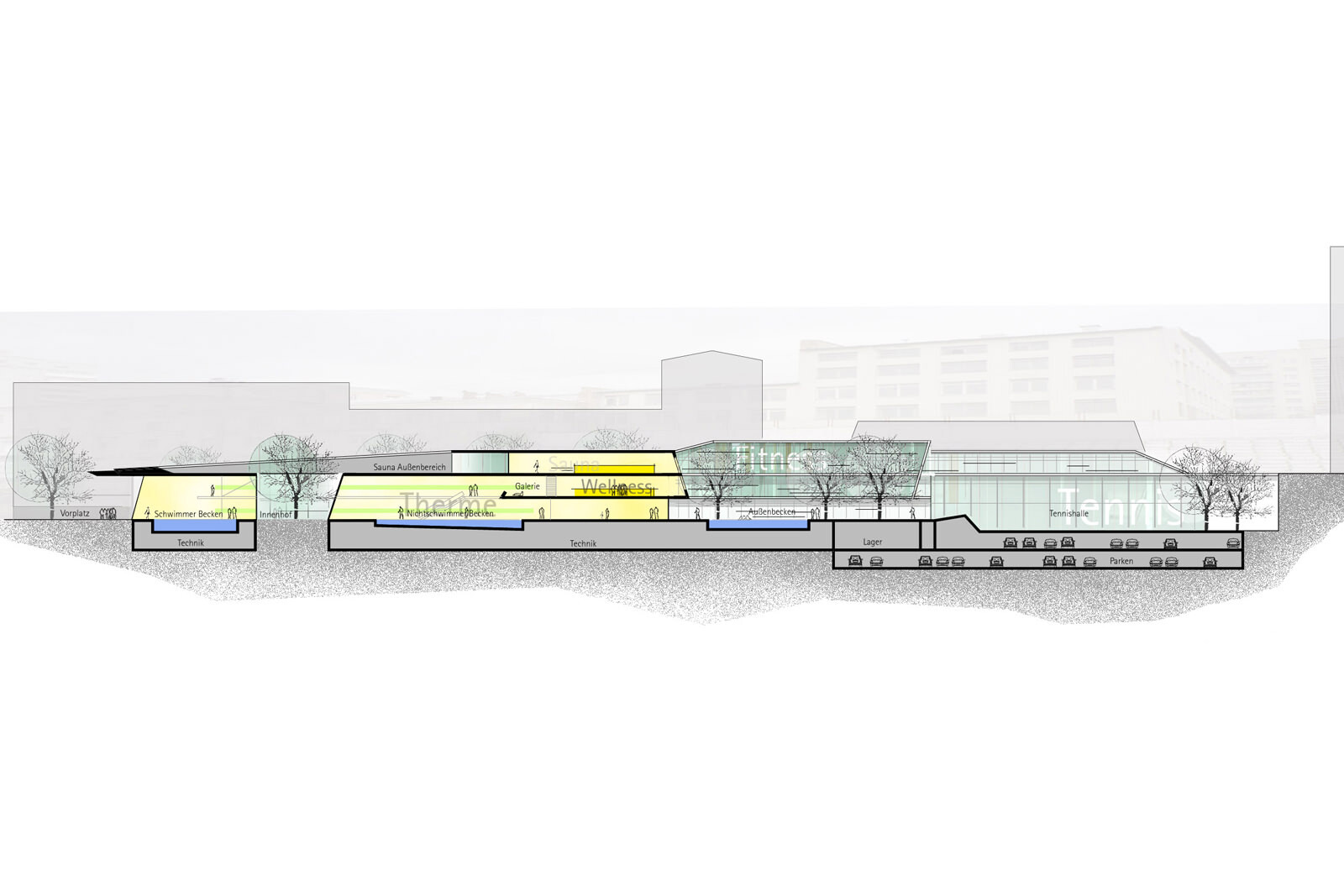 Neubau eines Thermalbades mit neun unterschiedlichen Becken (Wasserfläche 918 m²), großem Sauna-, Wellness- und Fitnessbereich, Tennisplätzen und einem 5-Sterne-Hotel (170 Zimmer) inklusive großem Konferenzbereich sowie 3-Sterne- und 5-Sterne-Restaurant.