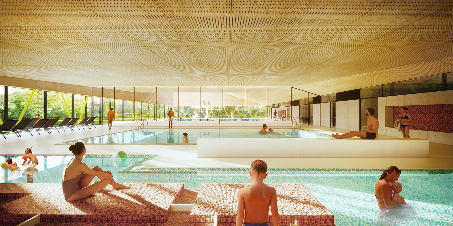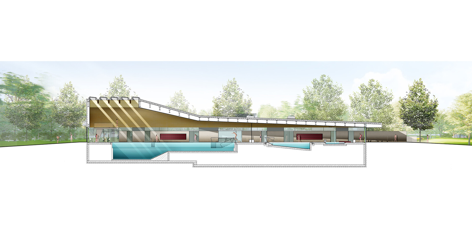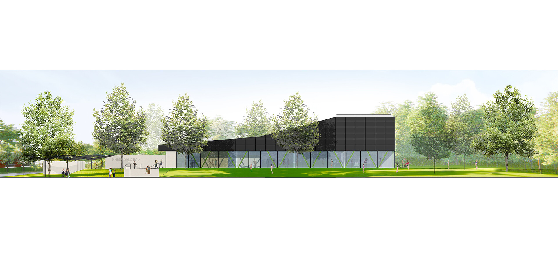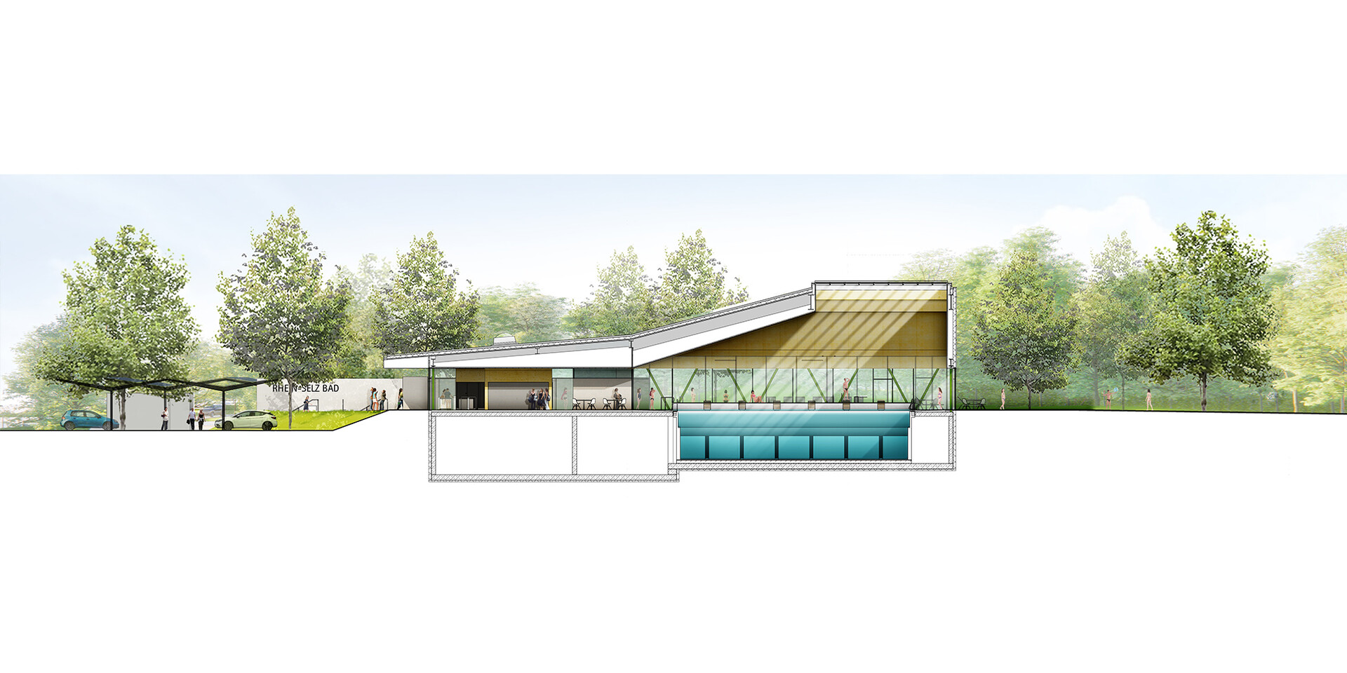 Mit der Realisierung des Schwimmbades übernimmt die Verbandsgemeinde Rhein-Selz in Rheinland-Pfalz eine Vorreiterfunktion. Hier entsteht das vermutlich erste Bad in Europa, dessen Energieerzeugung auf Wasserstoff basiert. Das von 4a Architekten gestaltete Bad wird nach der Eröffnung nahezu komplett energieautark sein. Der Strom wird über Photovoltaikanlagen am Gebäude gewonnen. In das Energie-Management-System sind Abwärmenutzung und Wärmepumpen integriert. So produziert das Bad regelmäßige Energieüberschüsse, die über Ladestationen auf dem Parkplatz an die Besucher weitergegeben werden. Zu Spitzenlast-Phasen kann auf Fernwärme zurückgegriffen werden. Doch das Hallenbad ist nicht nur in punkto Nachhaltigkeit vorbildhaft. Mit seinem auf die Besucher abgestimmten Raumprogramm und seiner hohen atmosphärischen Qualität steht es auch für einen zeitgemäßen Badebetrieb.