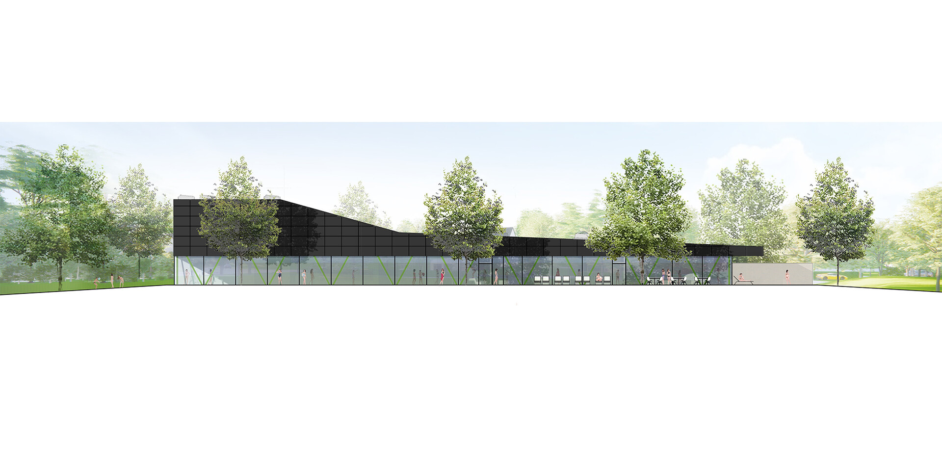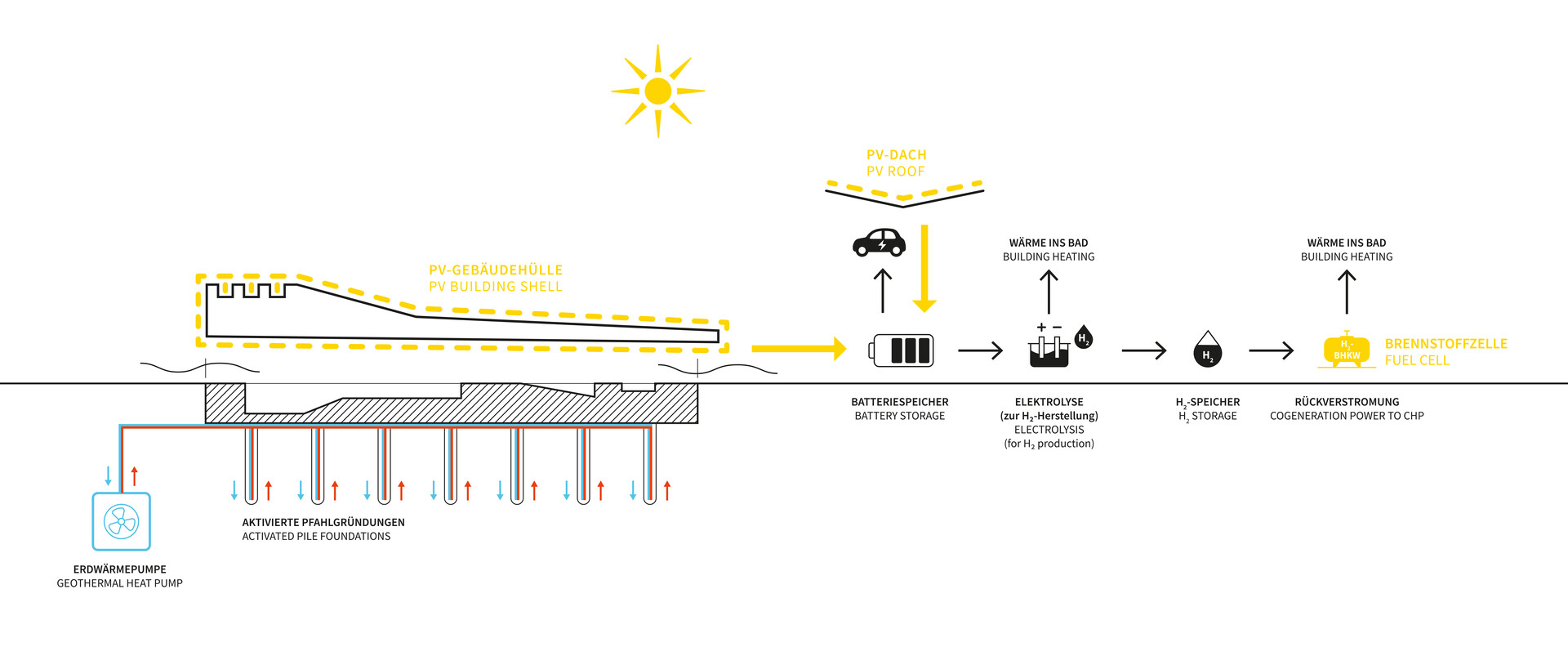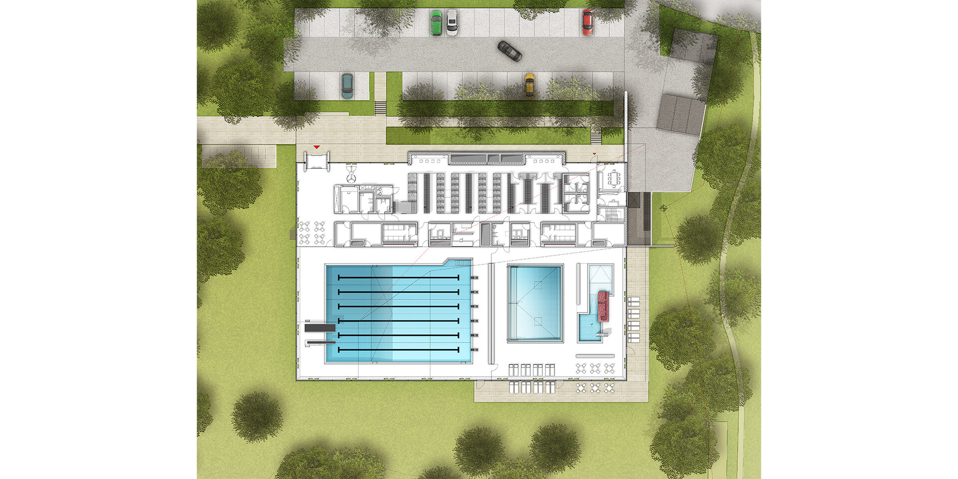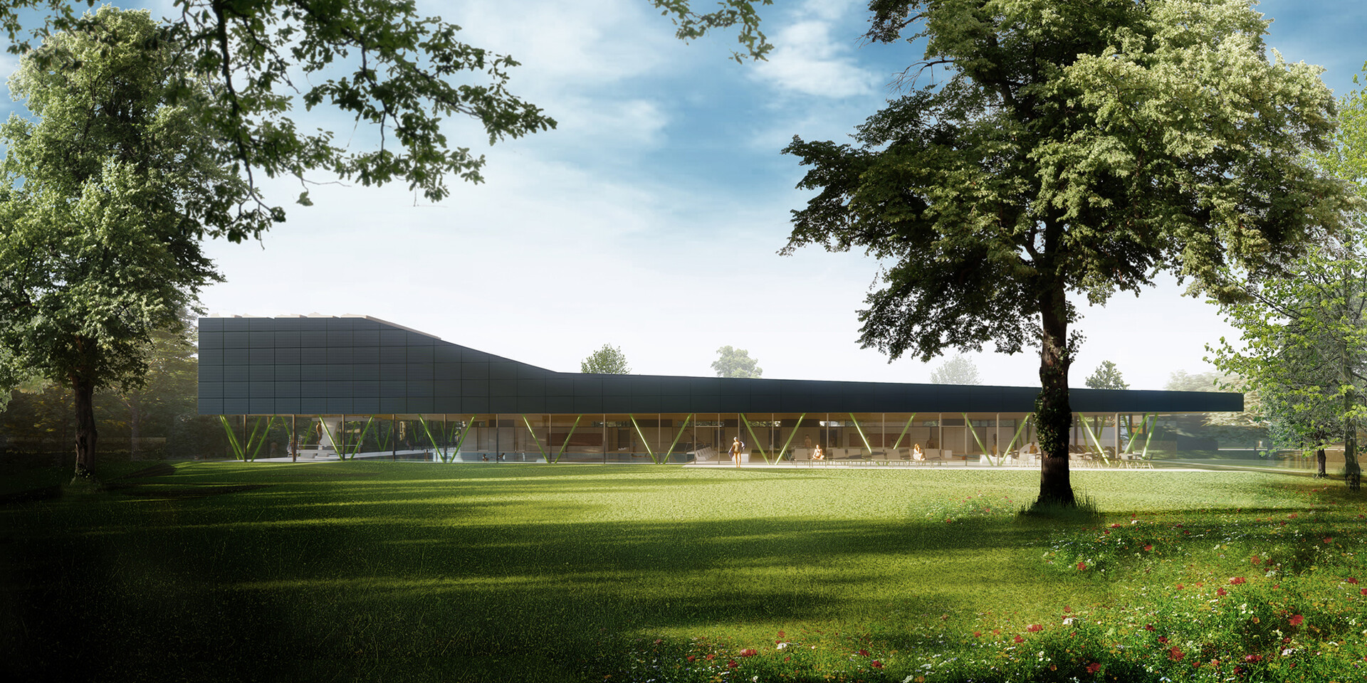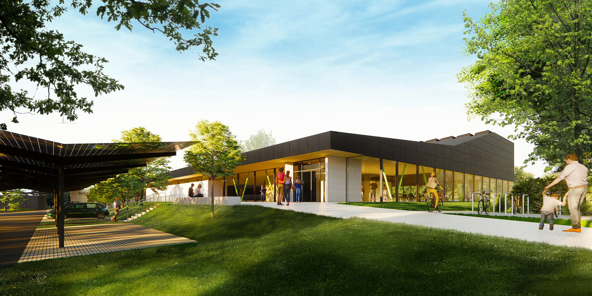 Mit der Realisierung des Schwimmbades übernimmt die Verbandsgemeinde Rhein-Selz in Rheinland-Pfalz eine Vorreiterfunktion. Hier entsteht das vermutlich erste Bad in Europa, dessen Energieerzeugung auf Wasserstoff basiert. Das von 4a Architekten gestaltete Bad wird nach der Eröffnung nahezu komplett energieautark sein. Der Strom wird über Photovoltaikanlagen am Gebäude gewonnen. In das Energie-Management-System sind Abwärmenutzung und Wärmepumpen integriert. So produziert das Bad regelmäßige Energieüberschüsse, die über Ladestationen auf dem Parkplatz an die Besucher weitergegeben werden. Zu Spitzenlast-Phasen kann auf Fernwärme zurückgegriffen werden. Doch das Hallenbad ist nicht nur in punkto Nachhaltigkeit vorbildhaft. Mit seinem auf die Besucher abgestimmten Raumprogramm und seiner hohen atmosphärischen Qualität steht es auch für einen zeitgemäßen Badebetrieb.