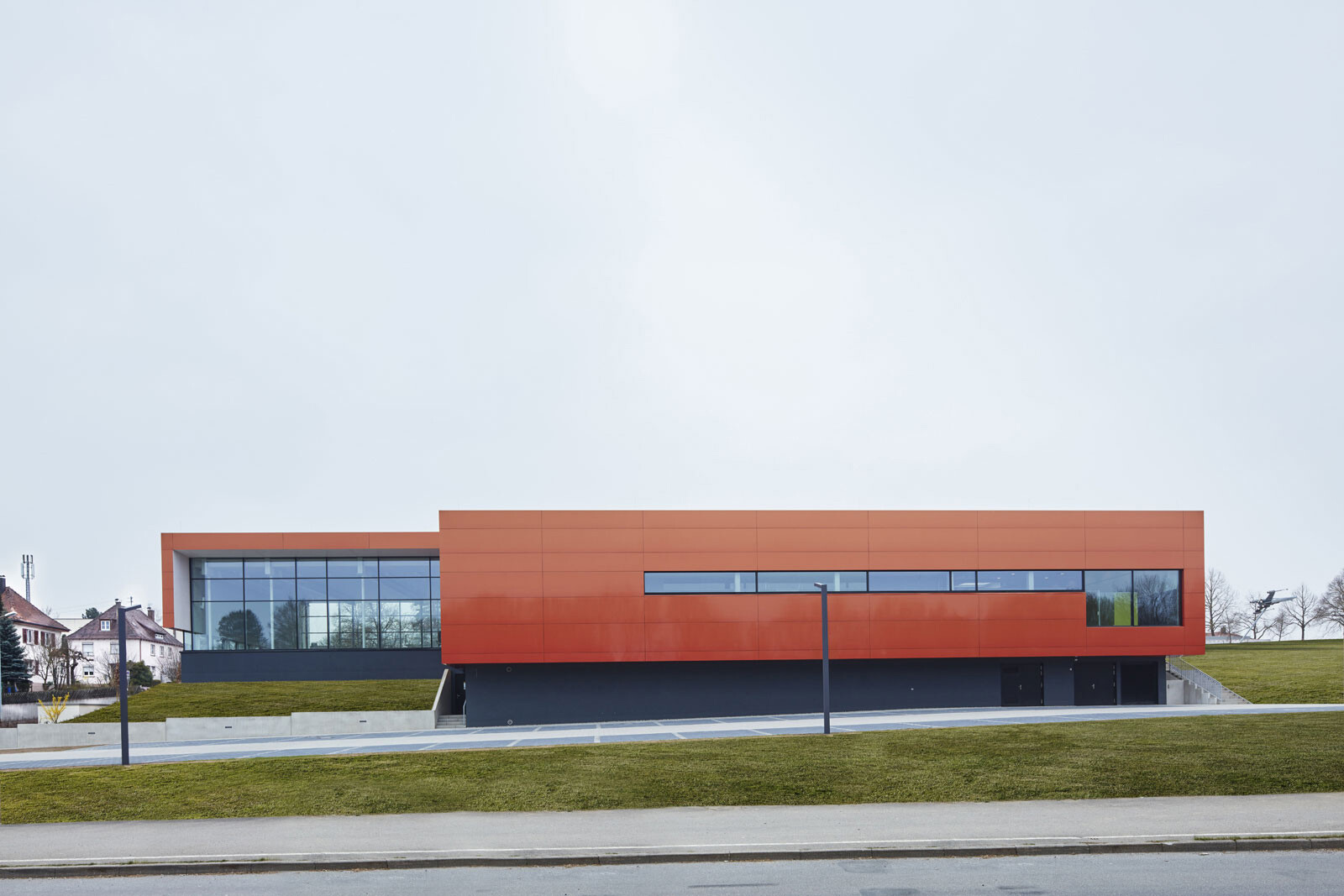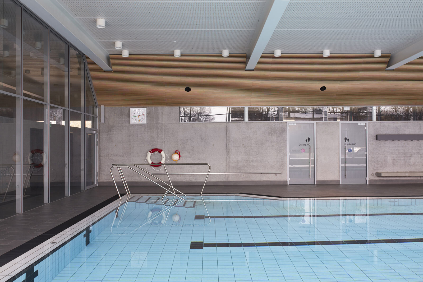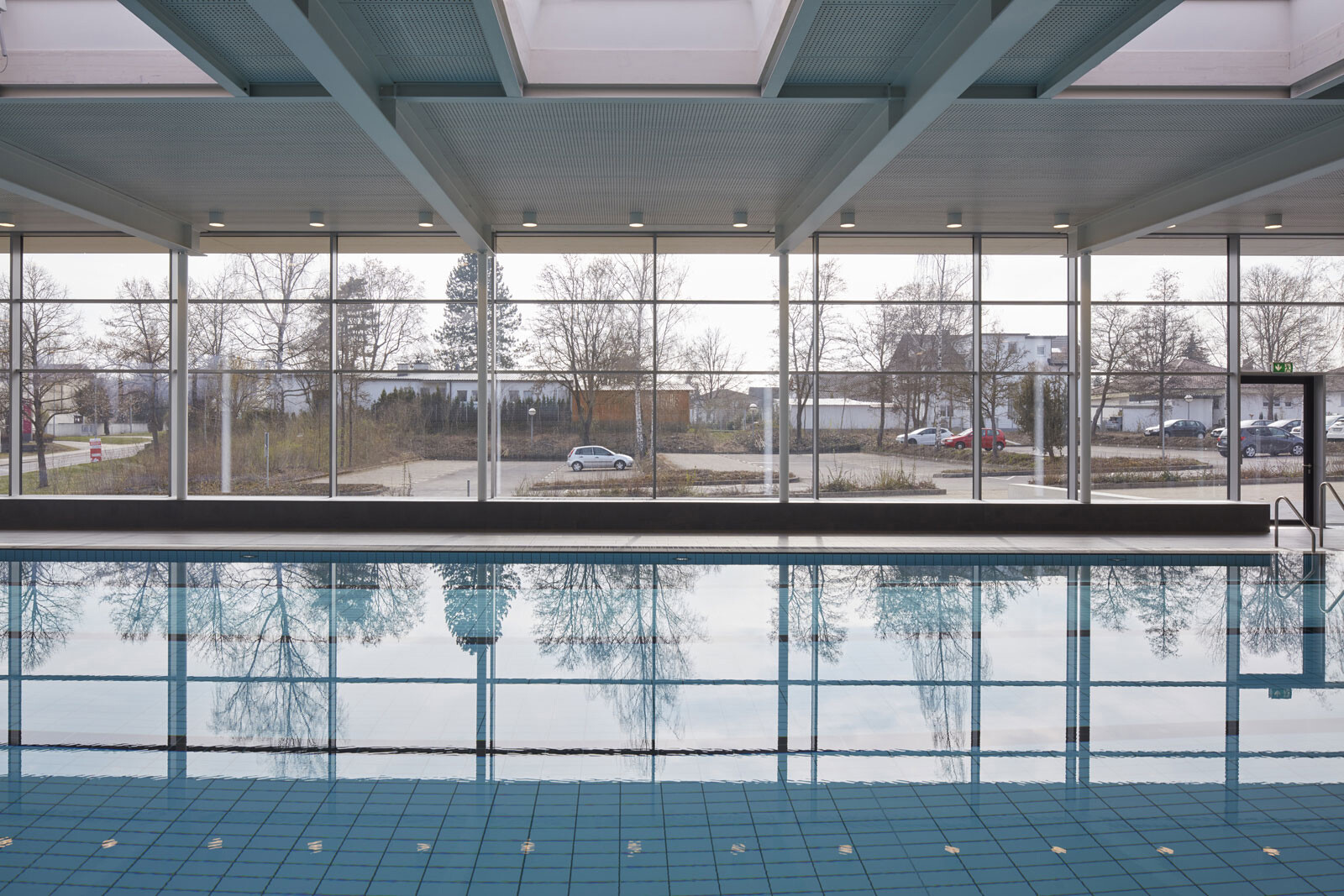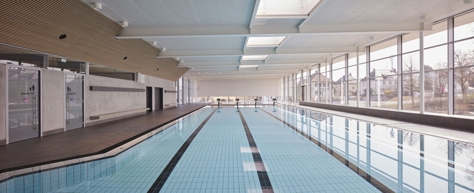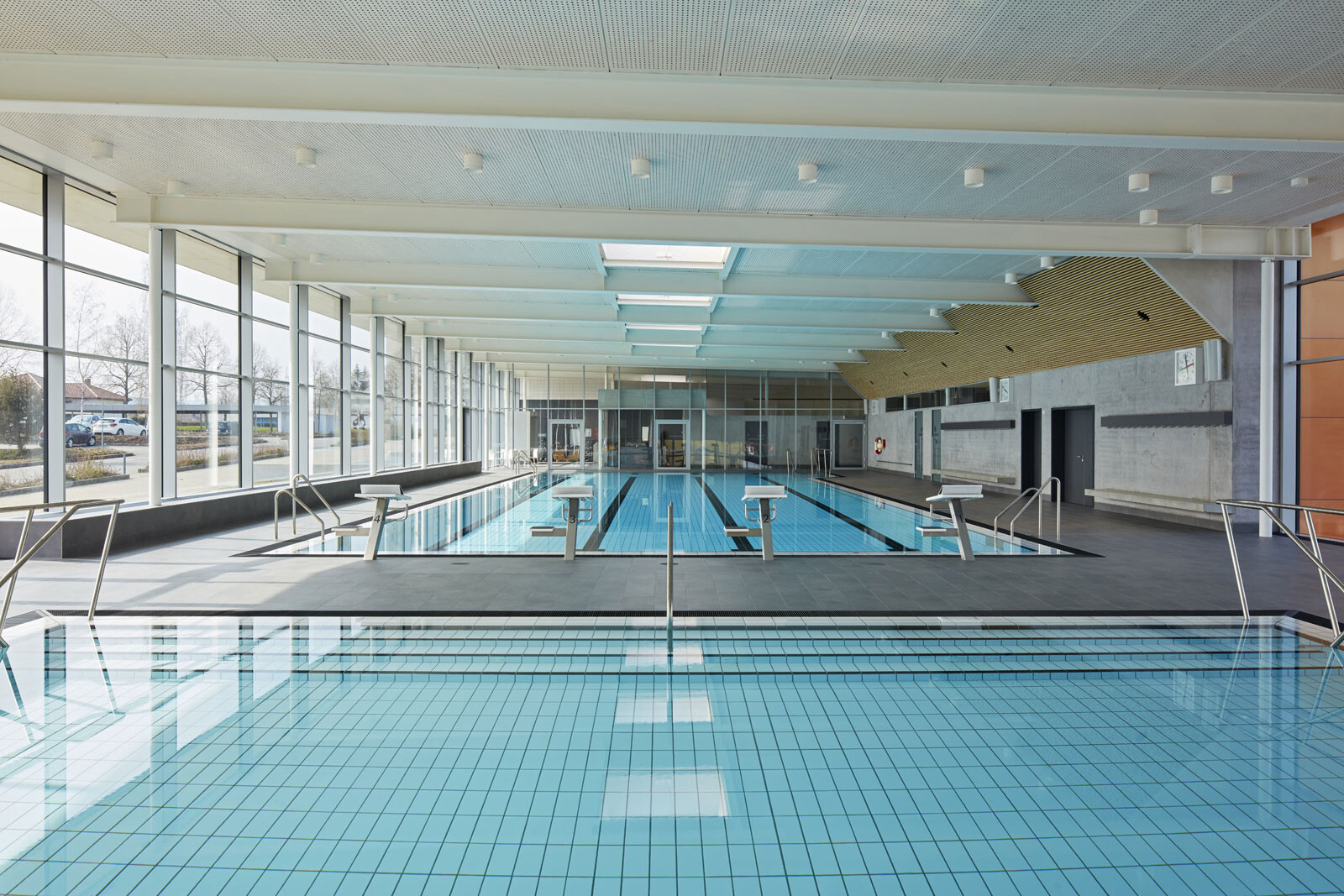Das Hallenbad liegt am nördlichen Ortsrand der Stadt Riedlingen, in direkter Nachbarschaft zum Schulcampus mit Realschule und Gymnasium. In erster Linie wird das Bad von Schulen und Vereinen genutzt, teils ist es auch für die Öffentlichkeit zugänglich. Diese funktionale Ausrichtung spiegelt die klare und kompakte Gestaltung des Baukörpers, der sich behutsam in den Hang einbettet. Eine Außentreppe führt den Besucher vom Parkplatz nach oben zum Haupteingang. Vom Eingangsbereich im Erdgeschoss geben großzügige, raumhohe Glasfassaden den Blick in die Schwimmhalle frei und schaffen einen Dialog zwischen Innen- und Außenraum. Das Erdgeschoss ist klar organisiert und umfasst vier Zonen: Foyer, Umkleiden, Sanitärspange und Schwimmhalle. Ihren lichtdurchfluteten und weitläufigen Charakter erhält die Badehalle durch ihre nahezu dreiseitig raumhohe Verglasung. Von außen bildet das Erdgeschoss mit seiner einheitlich gestalteten Fassade einen markanten Baukörper. Durch den Materialwechsel zum Untergeschoss und den auskragenden Barfußgangs erhält das Erdgeschoss einen schwebenden Charakter.
