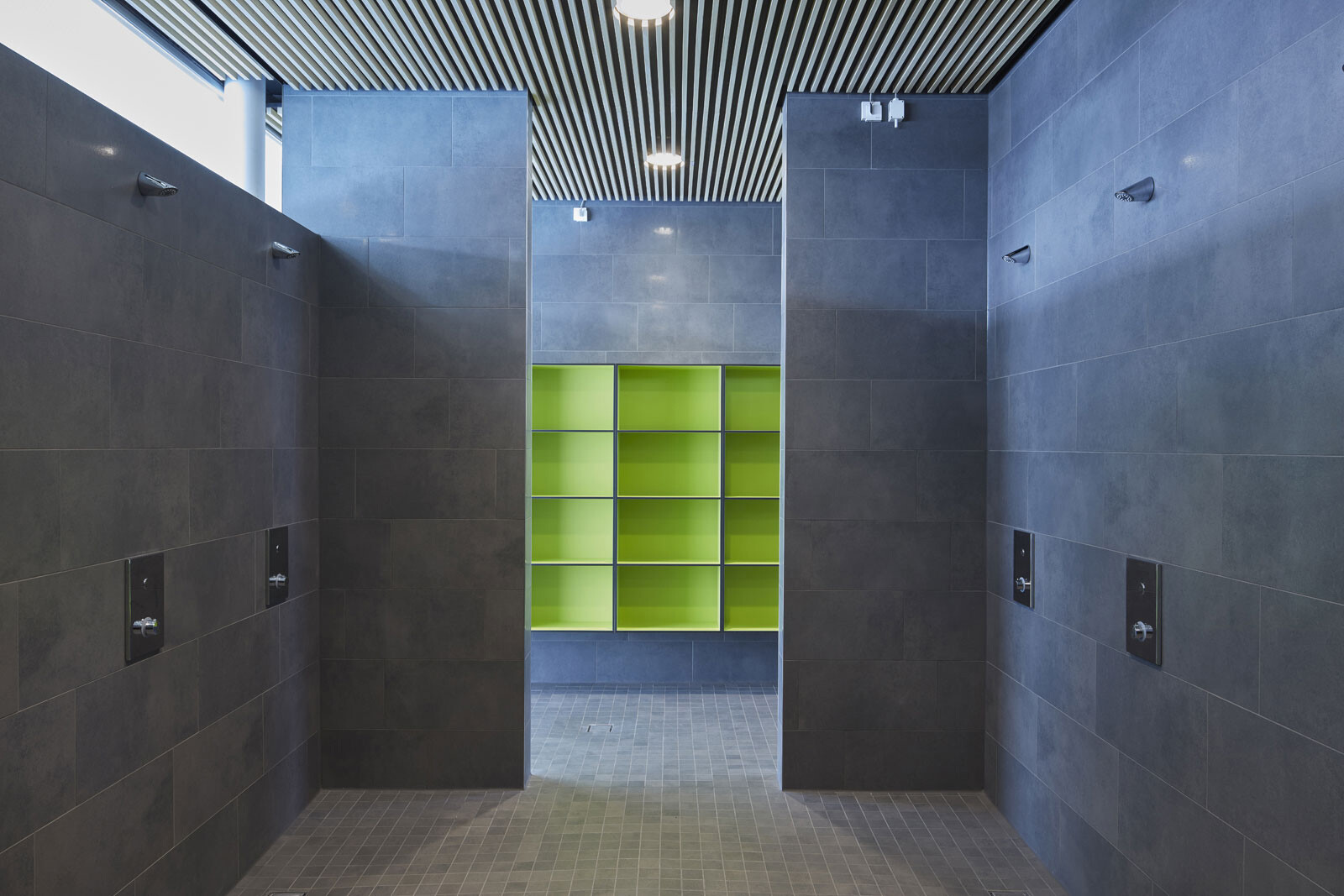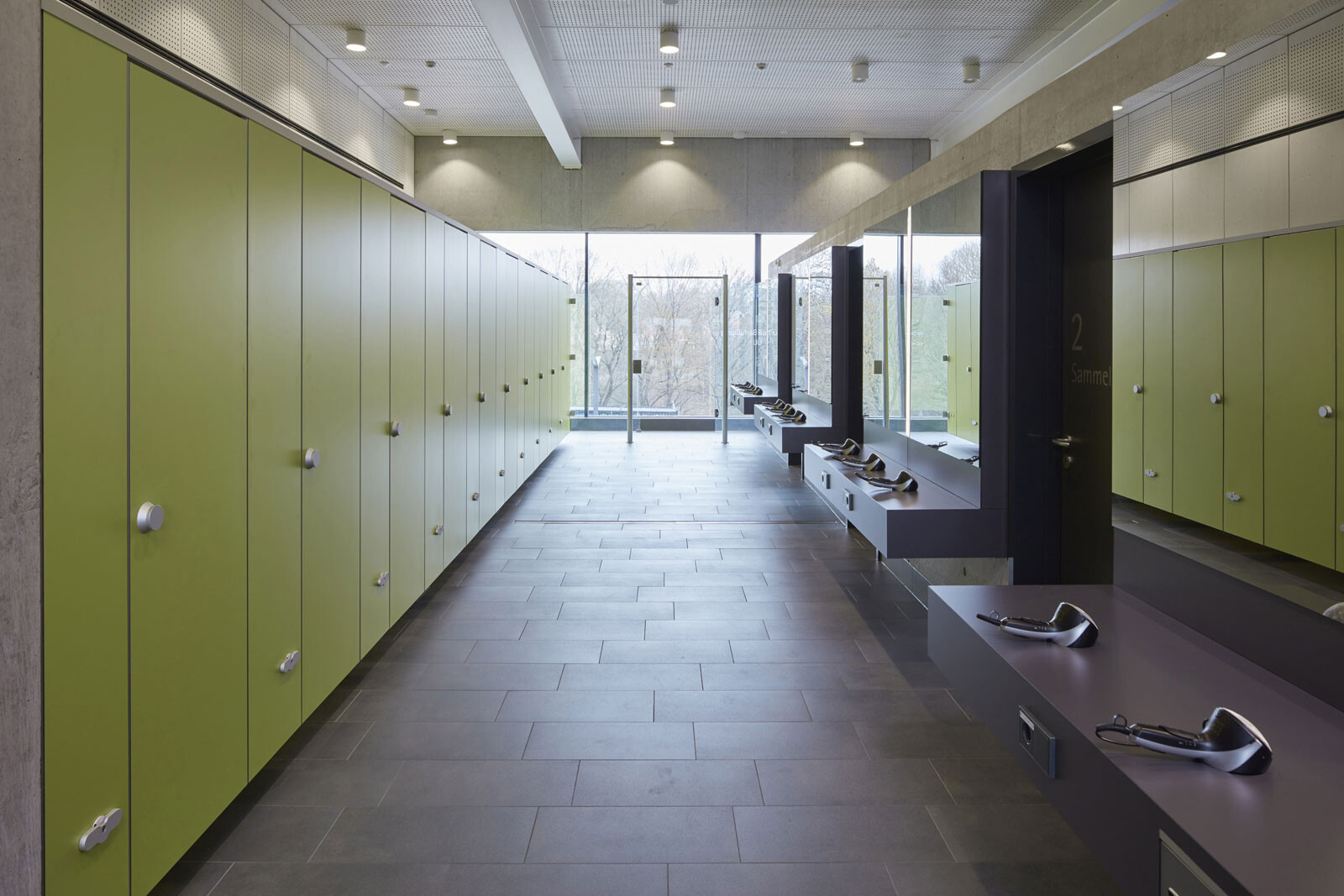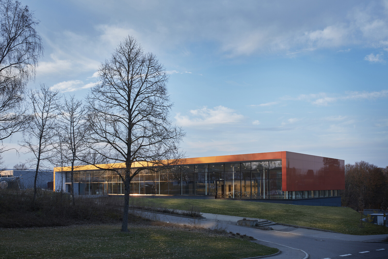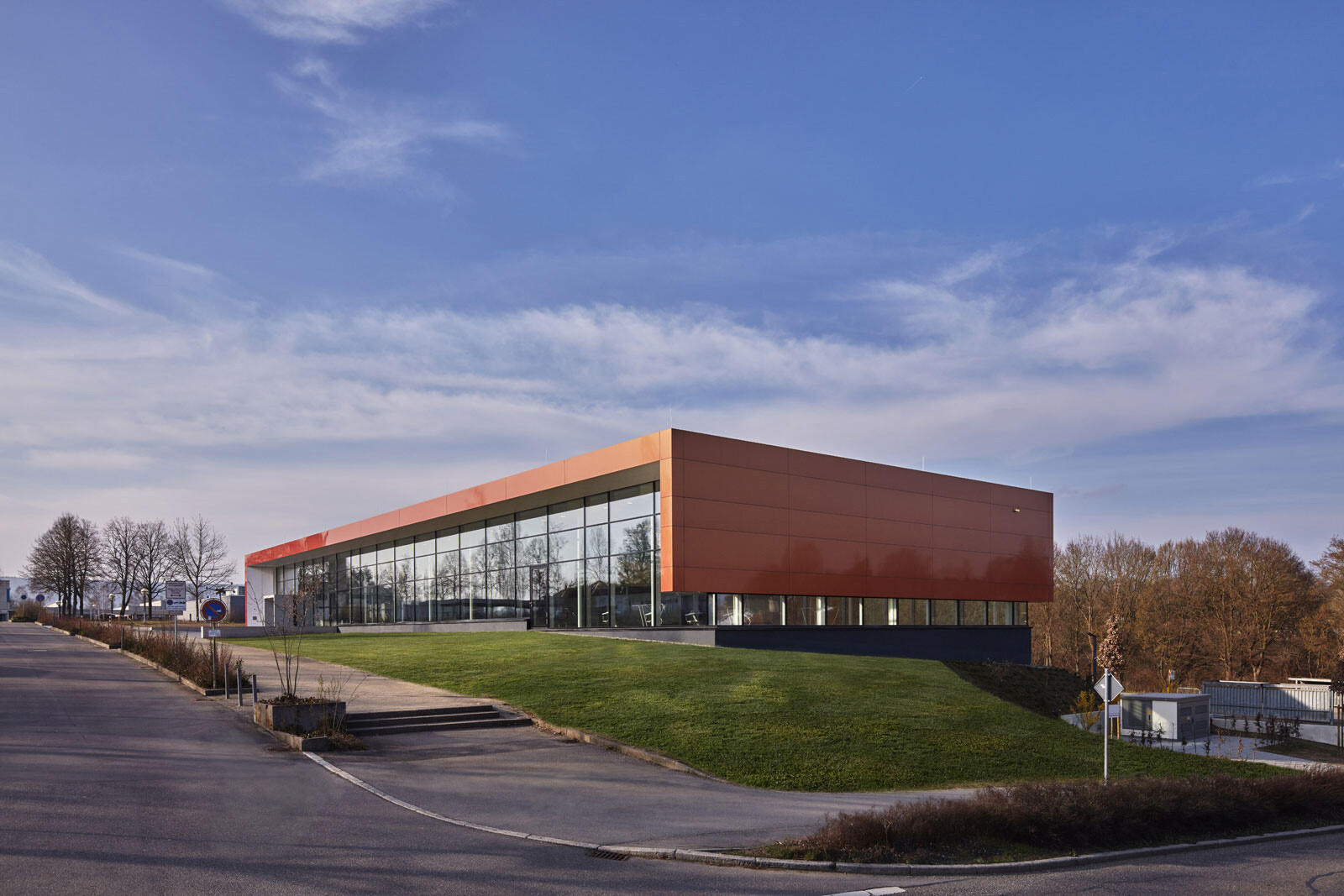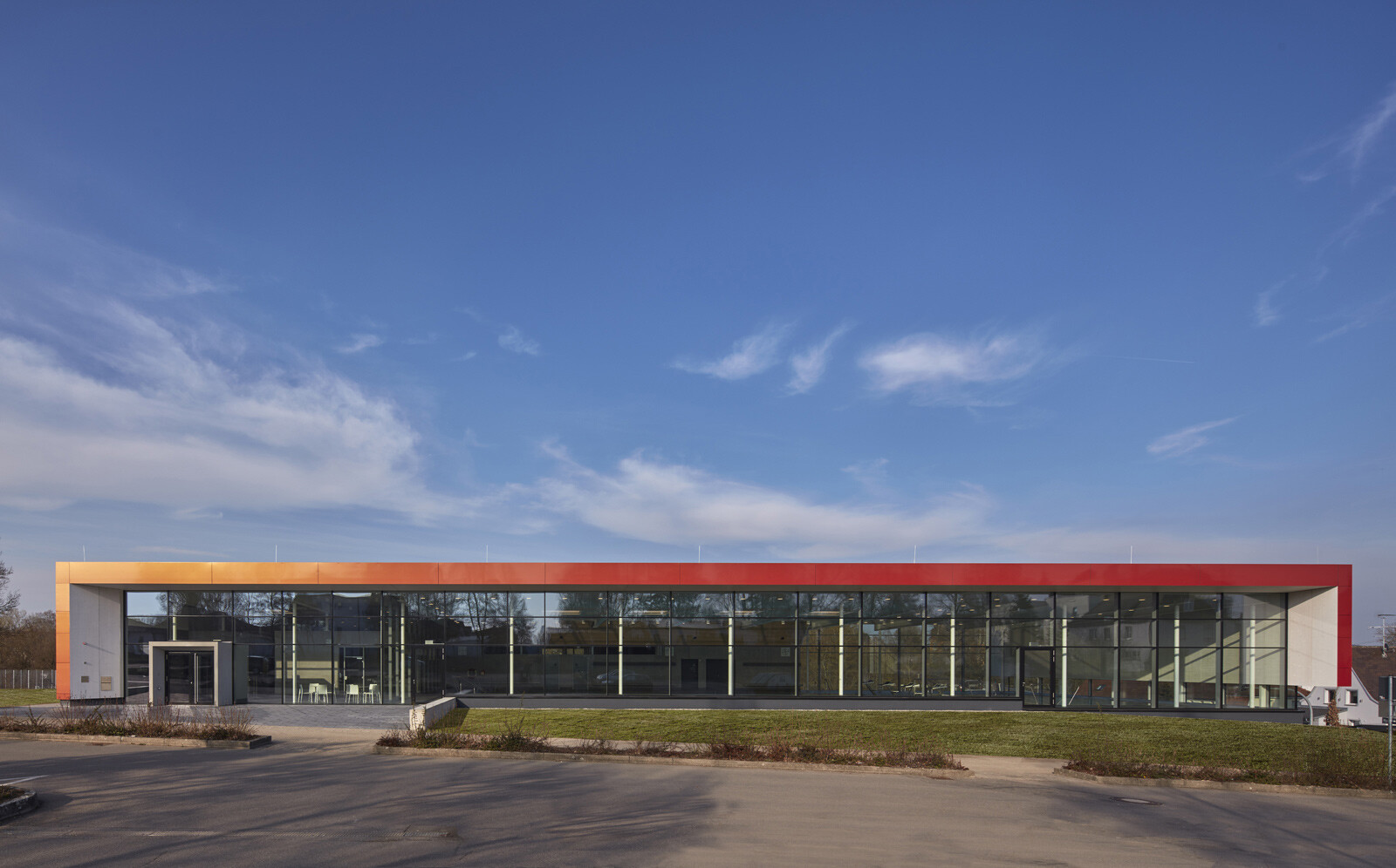 Das Hallenbad liegt am nördlichen Ortsrand der Stadt Riedlingen, in direkter Nachbarschaft zum Schulcampus mit Realschule und Gymnasium. In erster Linie wird das Bad von Schulen und Vereinen genutzt, teils ist es auch für die Öffentlichkeit zugänglich. Diese funktionale Ausrichtung spiegelt die klare und kompakte Gestaltung des Baukörpers, der sich behutsam in den Hang einbettet. Eine Außentreppe führt den Besucher vom Parkplatz nach oben zum Haupteingang. Vom Eingangsbereich im Erdgeschoss geben großzügige, raumhohe Glasfassaden den Blick in die Schwimmhalle frei und schaffen einen Dialog zwischen Innen- und Außenraum. Das Erdgeschoss ist klar organisiert und umfasst vier Zonen: Foyer, Umkleiden, Sanitärspange und Schwimmhalle. Ihren lichtdurchfluteten und weitläufigen Charakter erhält die Badehalle durch ihre nahezu dreiseitig raumhohe Verglasung. Von außen bildet das Erdgeschoss mit seiner einheitlich gestalteten Fassade einen markanten Baukörper. Durch den Materialwechsel zum Untergeschoss und den auskragenden Barfußgangs erhält das Erdgeschoss einen schwebenden Charakter.