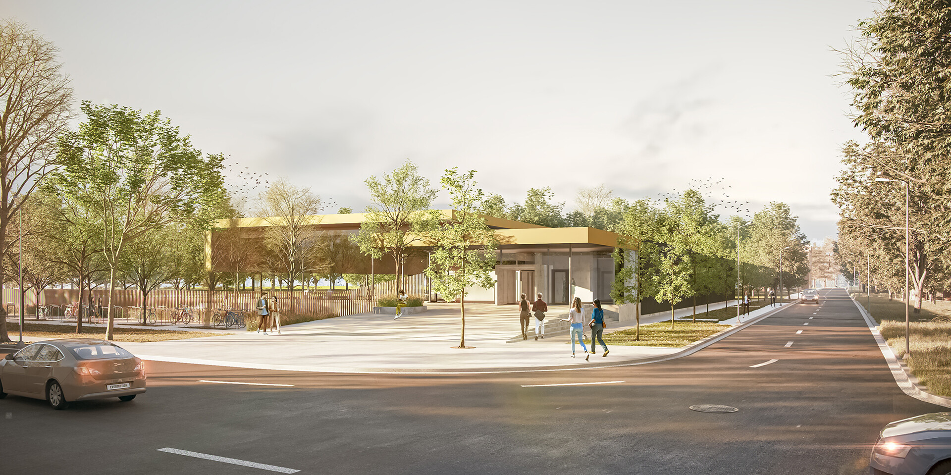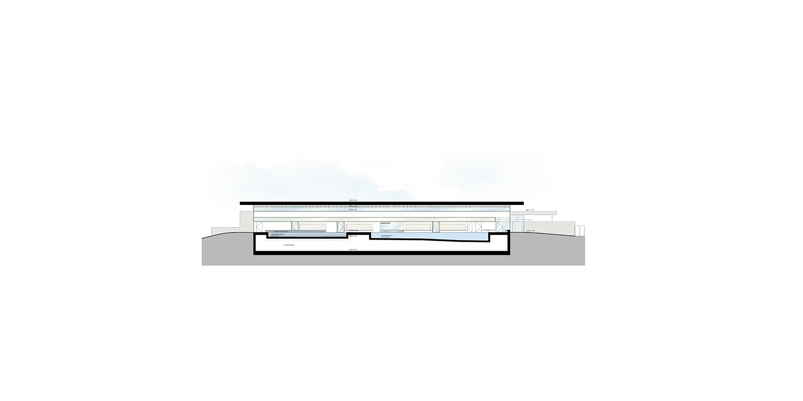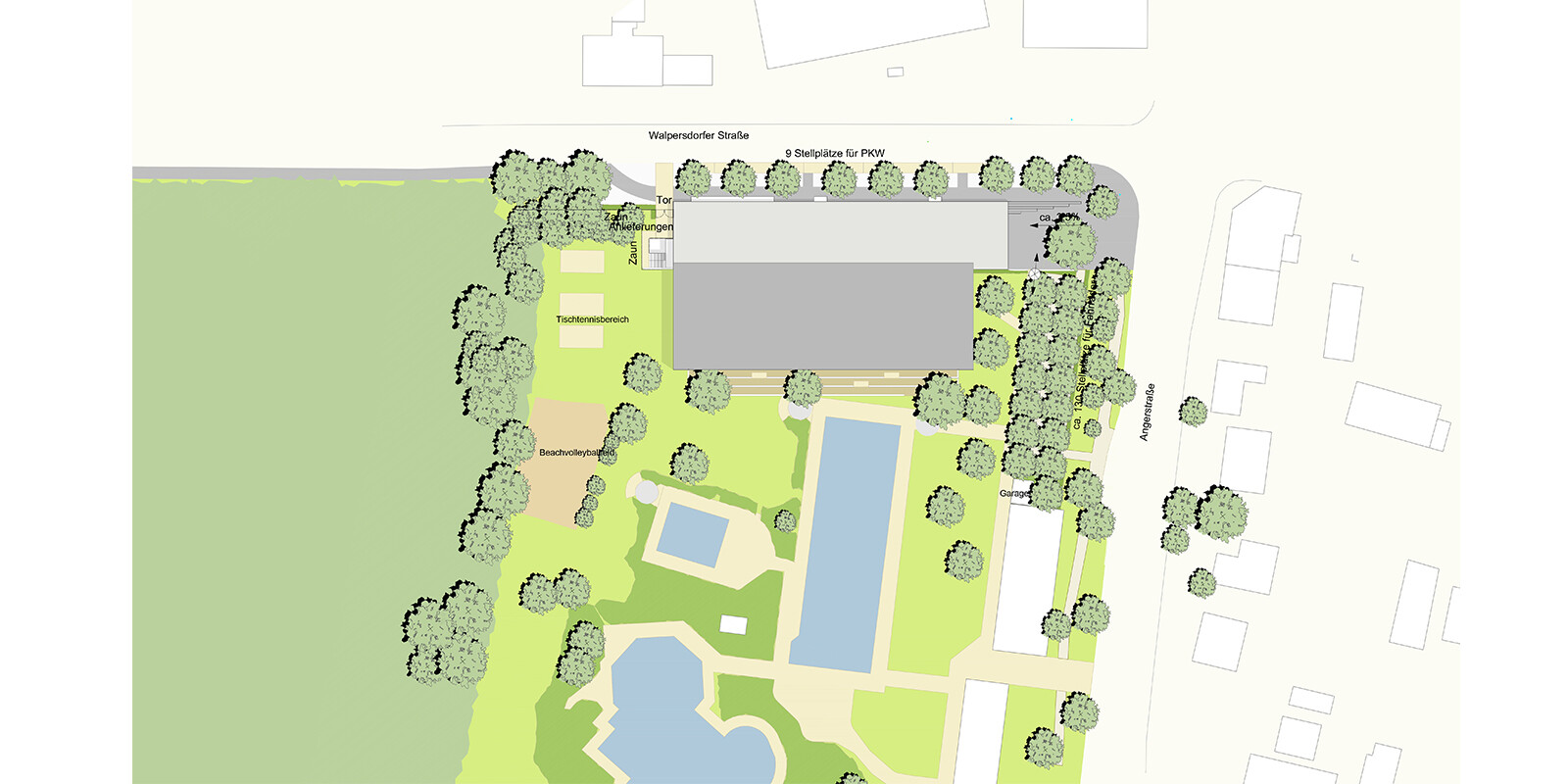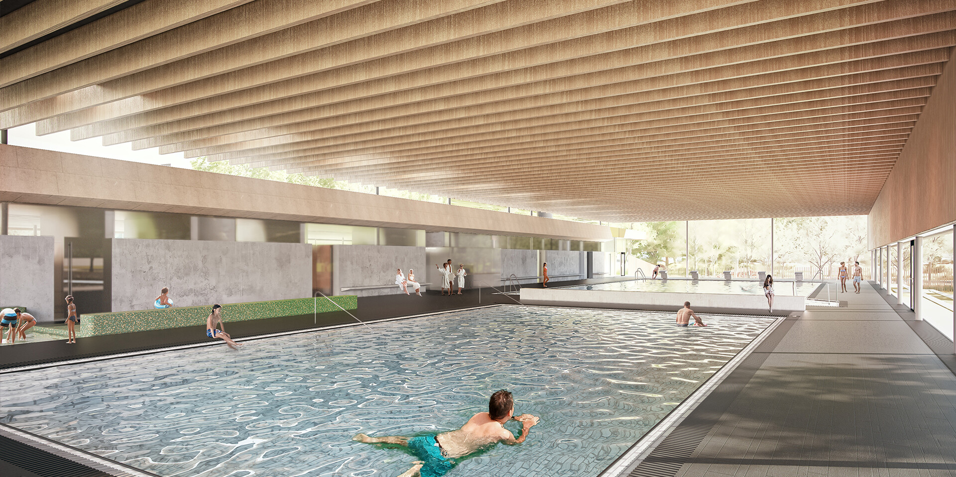 Auf dem Gelände des bestehenden Freibades „Parkbad“ entsteht ein Hallenbad-Neubau als Ersatz für das in die Jahre gekommene Schwimmbad an der Bismarkstraße. Das neue Bad wird schwerpunktmäßig dem Schul- und Vereinssport als Dreifachübungsstätte zur Verfügung stehen, aber auch für die Öffentlichkeit zugänglich sein. Formal gliedert sich das Gebäude in zwei parallel liegende Baukörper mit unterschiedlichen Höhen. Der höhere Baukörper umfasst die Badehalle mit einem 25-Meter-Schwimmerbecken, einem Lehrschwimm- und einem Kinderbecken. Im niedrigeren Baukörper befinden sich das Foyer, die Umkleide- und Duschbereiche sowie sämtliche Nebenräume für das Bad.