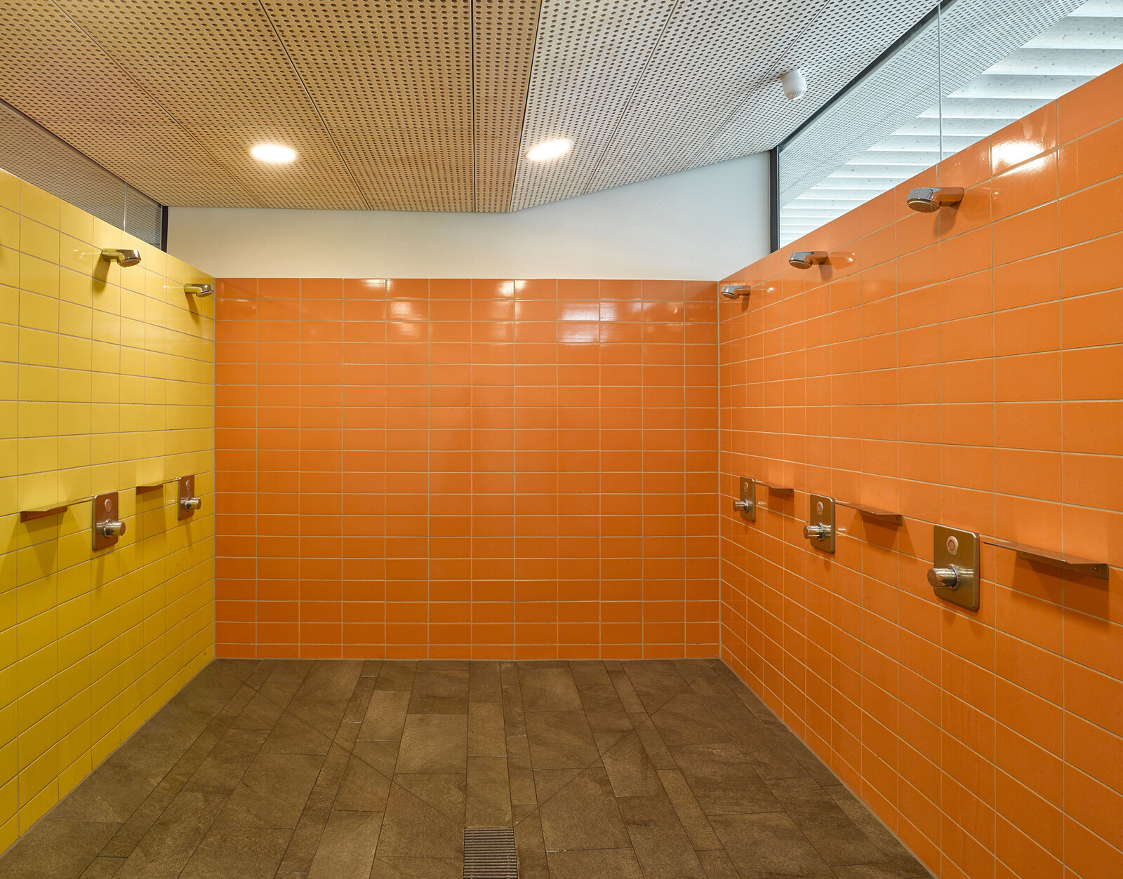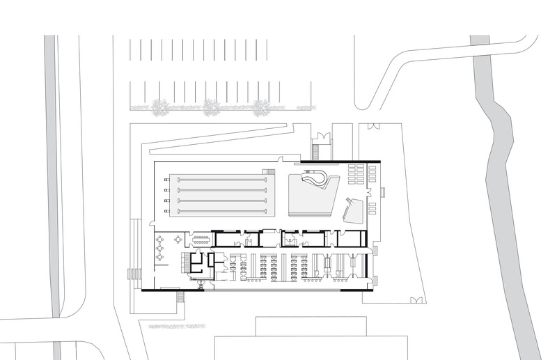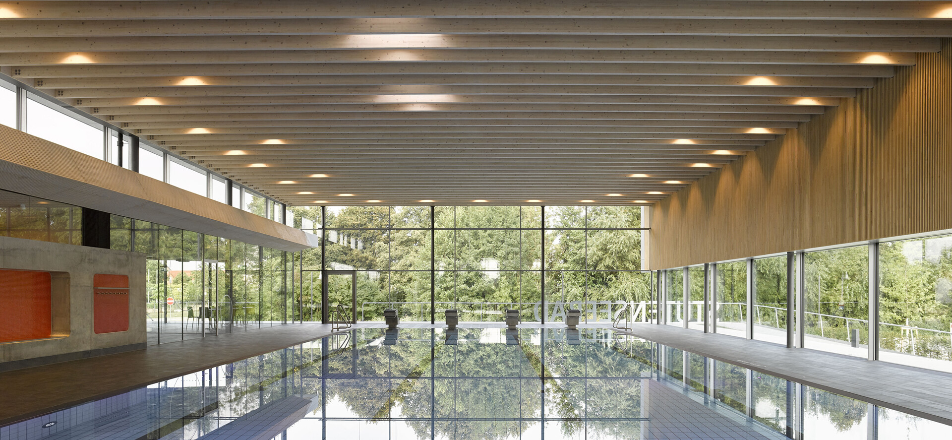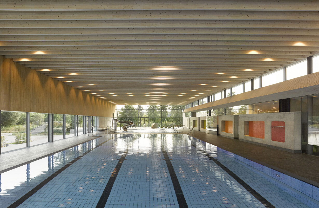 Die klare Grundriss-Organisation von Badehalle und Umkleidebereich ermöglichte eine kompakte und ökonomische Bauweise mit einem günstigen A/V-Verhältnis. So lassen sich nicht nur die Baukosten, sondern auch die Kosten im Betrieb reduzieren. Keller- und Erdgeschoss sind in Stahlbeton ausgeführt, die Tragstruktur für die weit gespannte Badehalle und den Umkleidebereich wurde in Holzbauweise errichtet. Auch die abgehängten, akustisch wirksamen Lamellen-Decken und Wandverkleidungen sind in Holz ausgeführt. Aufgrund seiner positiven Eigenschaften und seiner natürlichen Anmutung eignet sich das Material besonders gut, um Räumen mit schallharten Flächen wie Badehallen Atmosphäre zu verleihen und die Raumakustik zu optimieren. Darüber hinaus sorgte der hohe Vorfertigungsgrad der Holzelemente für eine wirtschaftliche Bauweise und kürzere Bauzeiten.