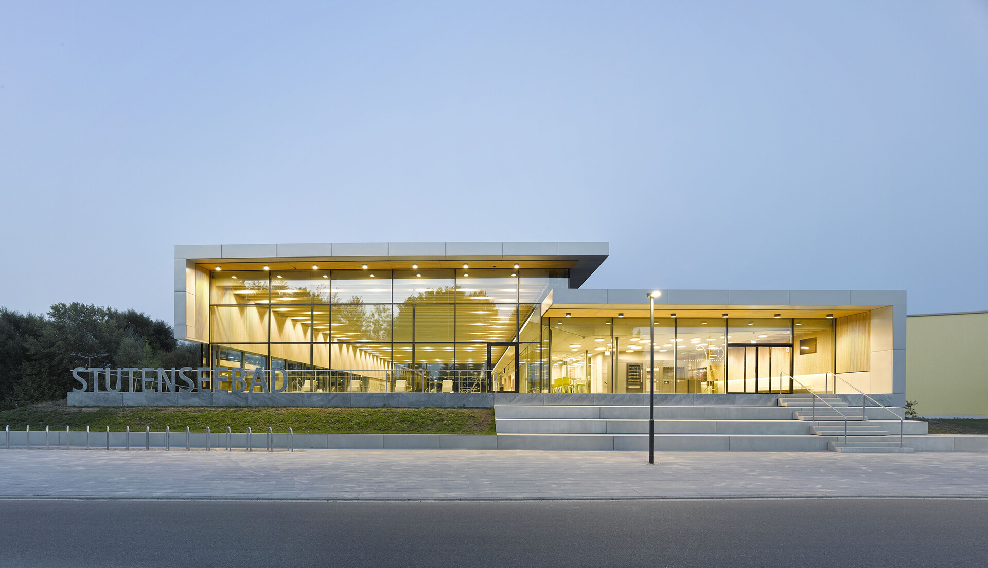 Im Vordergrund der Planung für das neue Schwimmbad stand, ein gestalterisch überzeugendes und qualitativ hochwertiges Gebäude mit langer Lebensdauer zu errichten. Deshalb wurde der Neubau unter Anwendung der Nachhaltigkeitskriterien im staatlich geförderten kommunalen Hochbau entwickelt (Förderprogramm NBBW). Der kompakte Baukörper mutet von außen schlicht an, im Innenraum herrscht eine leuchtend helle Atmosphäre, die mit maximaler Aufenthaltsqualität überzeugt. Architektonisch gliedert sich das Stutensee-Bad in zwei Raumvolumen, die sich sichtbar von außen abzeichnen. Die geräumige Badehalle umfasst ein Schwimmerbecken, ein Lehrschwimmbecken mit Rutschbahn sowie einen Kleinkindbereich mit insgesamt 368 m² Wasserfläche. Der nach Süden angrenzende Eingangs- und Umkleidebereich mit Dusch- und Nebenräumen setzt sich durch eine reduzierte Raumhöhe von der Badehalle ab. Dabei greifen die zwei Baukörper in Form und Materialität ineinander und verzahnen sich von außen durch ein umlaufendes Band der Stahlblechfassade.