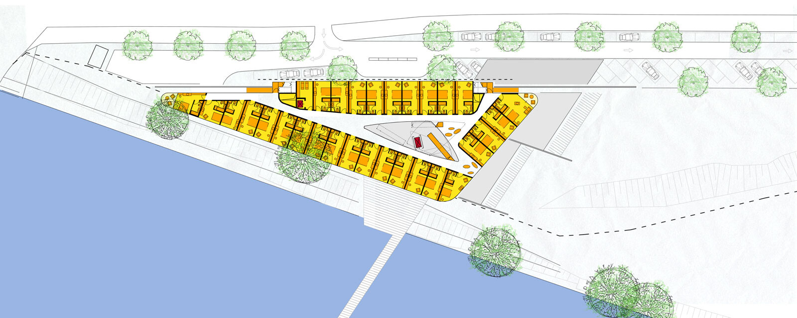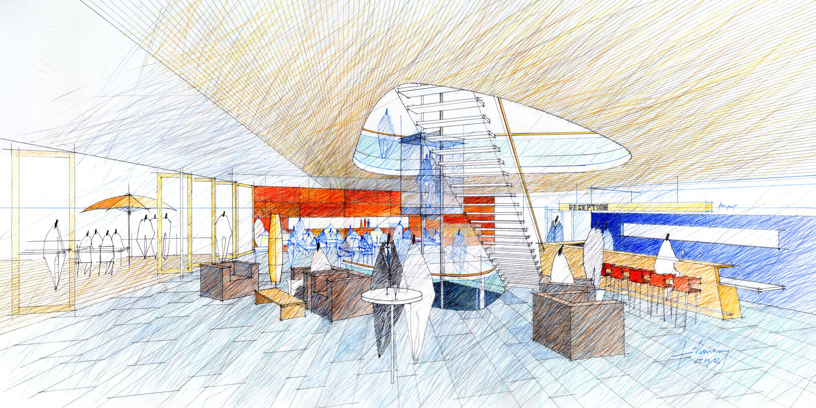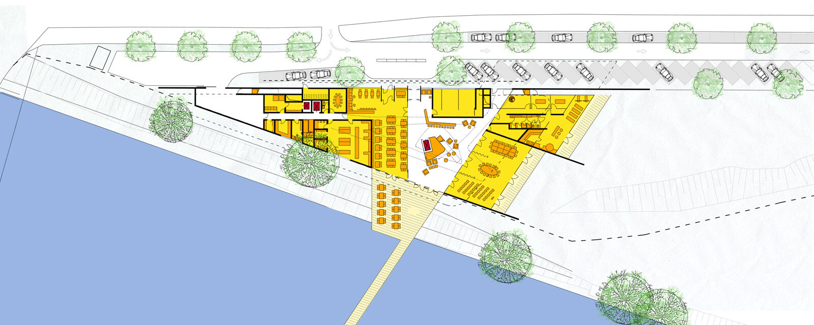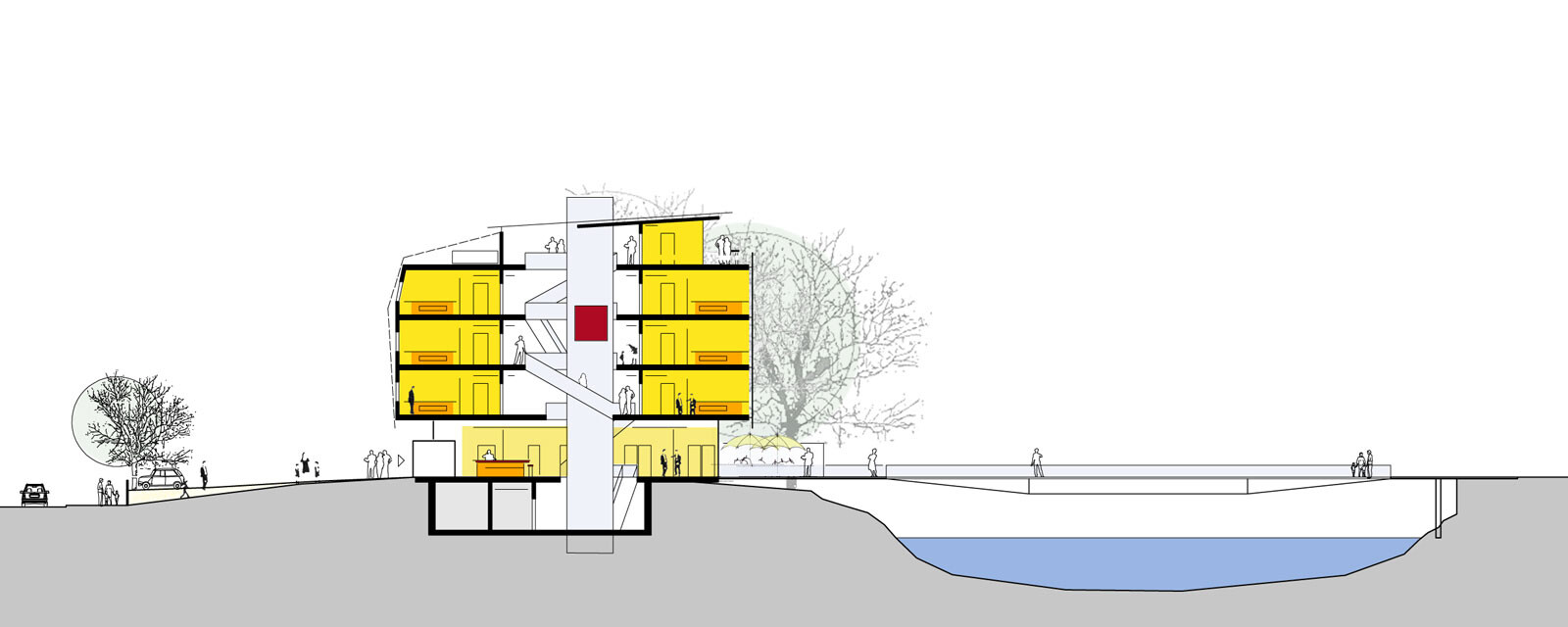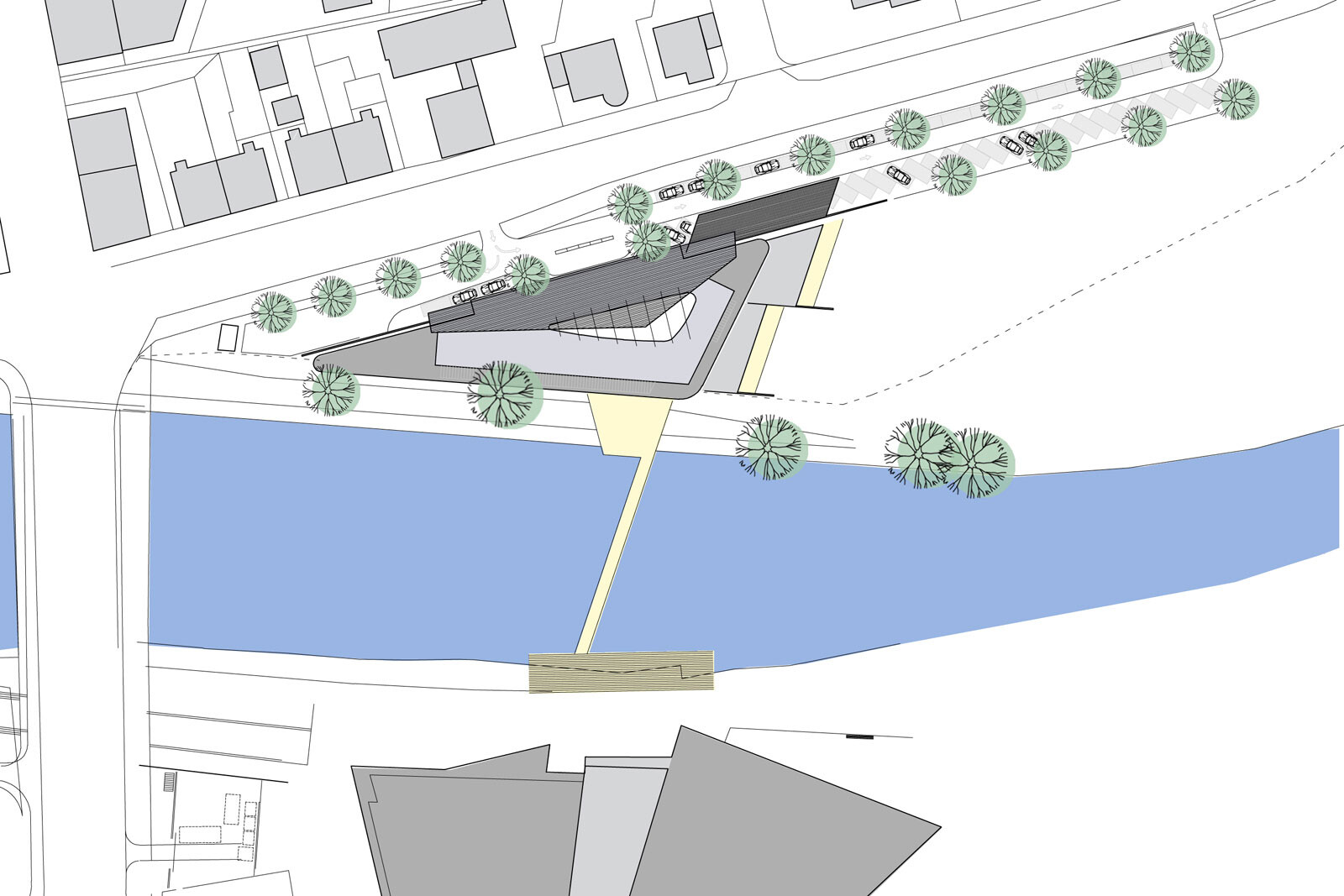 Das Grundstück, auf dem das Hotel realisiert werden soll, befindet sich am Donauufer gegenüber der Tuttlinger Stadthalle. Die markante Dreiecksform des Gebäudes entwickelt sich aus der städtebaulichen Situation. Im Erdgeschoss befinden sich die allgemeinen Funktionsbereiche wie Empfang, Rezeption, Restaurant, Bar und Küche sowie die Tagungsräume. Zentrales Element der Eingangshalle ist ein offen gestaltetes Atrium mit Glasdach, das sich über vier Geschosse erstreckt und das Hotel im Innenraum großzügig mit Tageslicht versorgt. Die Hotelzimmer sind über drei Geschosse um dieses Atrium angeordnet, mit Blick auf die Stadthalle, die Donau sowie den Leutenberg. Darüber hinaus sind im Dachgeschoss Hotelsuiten mit Dachterrassen sowie ein Fitness- und Saunabereich vorgesehen.