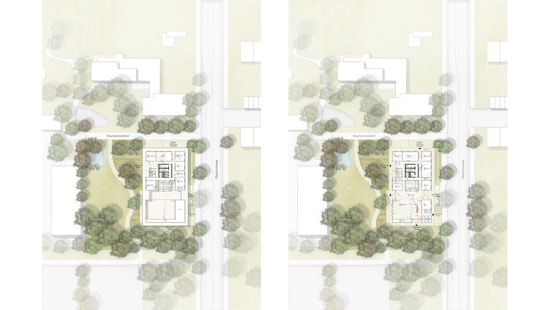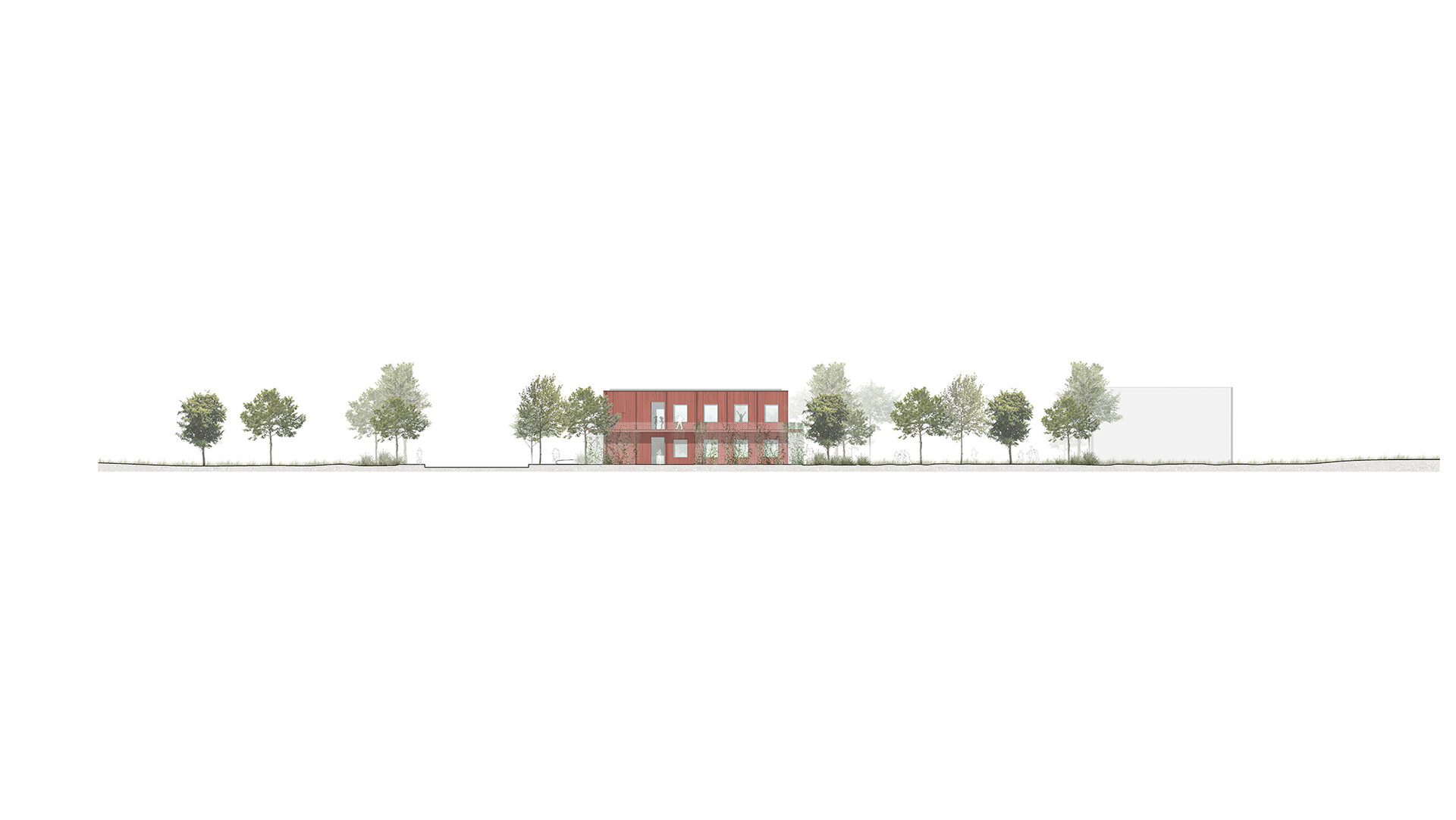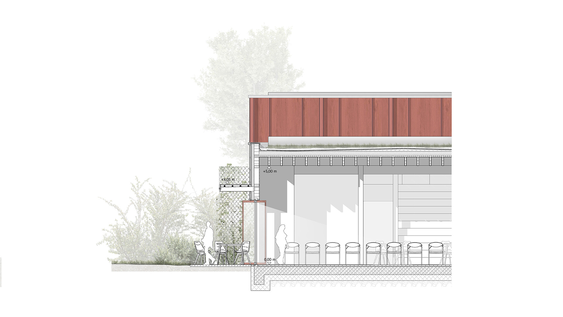 Die Tragkonstruktion erfolgt in Holz-Hybridbauweise. Eine vorgehängte grüne Fassade sorgt im Erdgeschoss für einen Bezug zur Natur und schafft zugleich einen Sichtschutz zum Magistratsweg. Die Fassade zur Straße hin ist weitgehend geschlossen, während die zum Garten gerichtete Seite großzügige Glasflächen bietet. Hoch wärmegedämmte Holz-Aluminiumfenster mit Öffnungsflügeln zur natürlichen Belüftung unterstreichen den nachhaltigen Ansatz. Der umlaufende Fluchtbalkon dient als außenliegender Sonnenschutz und die begrünte Netzstruktur fungiert als Einbruchschutz. Im Inneren prägen naturbelassene, robuste Materialien den Raum. Ein geschliffener Estrichboden mit Fußbodenheizung kontrastiert mit den sichtbaren Holzdecken und mobilen Holzmöbeln. Für die Sanitärbereiche sind keramische Beläge vorgesehen. Optional könnte Lehmputz an den Innenwänden für ein angenehmes Raumklima sorgen. Ein dezentes Farbkonzept erleichtert die Orientierung und unterstreicht das ruhige, einladende Ambiente.