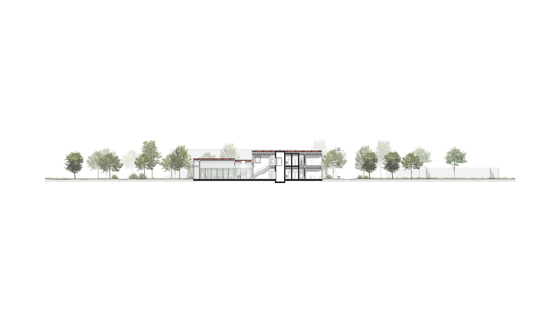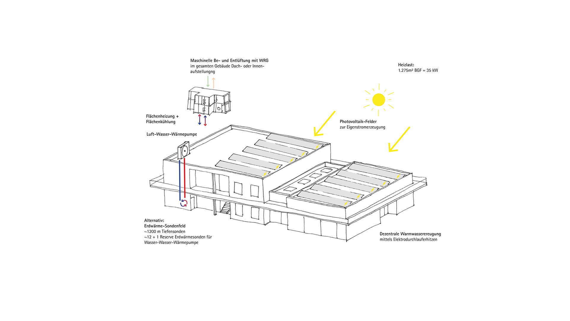 Der Entwurf setzt auf Energieeffizienz und den Einsatz regenerativer Energien. Dachflächen mit Photovoltaikanlagen und Stromspeichertechnik sorgen für eine zeitversetzte Nutzung von Solarenergie. Eine Luft-Wasser-Wärmepumpe wird das Gebäude heizen und, ergänzend im Winter, auch kühlen. Fußbodenheizung und -kühlung sorgen mit moderaten Vorlauftemperaturen für ein angenehmes Raumklima, ohne den Taupunkt zu unterschreiten. Für die Warmwasserbereitung sind dezentrale Elektro-Durchlauferhitzer vorgesehen, um Bereitschaftsverluste zu vermeiden und die selbsterzeugte Solarenergie zu nutzen. Eine zentrale Lüftungsanlage mit Wärmerückgewinnung und einem Wirkungsgrad von über 85 % trägt zum hygienischen Luftaustausch bei. Optional kann, je nach geologischen Gegebenheiten, eine Wasser-Wasser-Wärmepumpe installiert werden, um die Energieeffizienz weiter zu steigern.