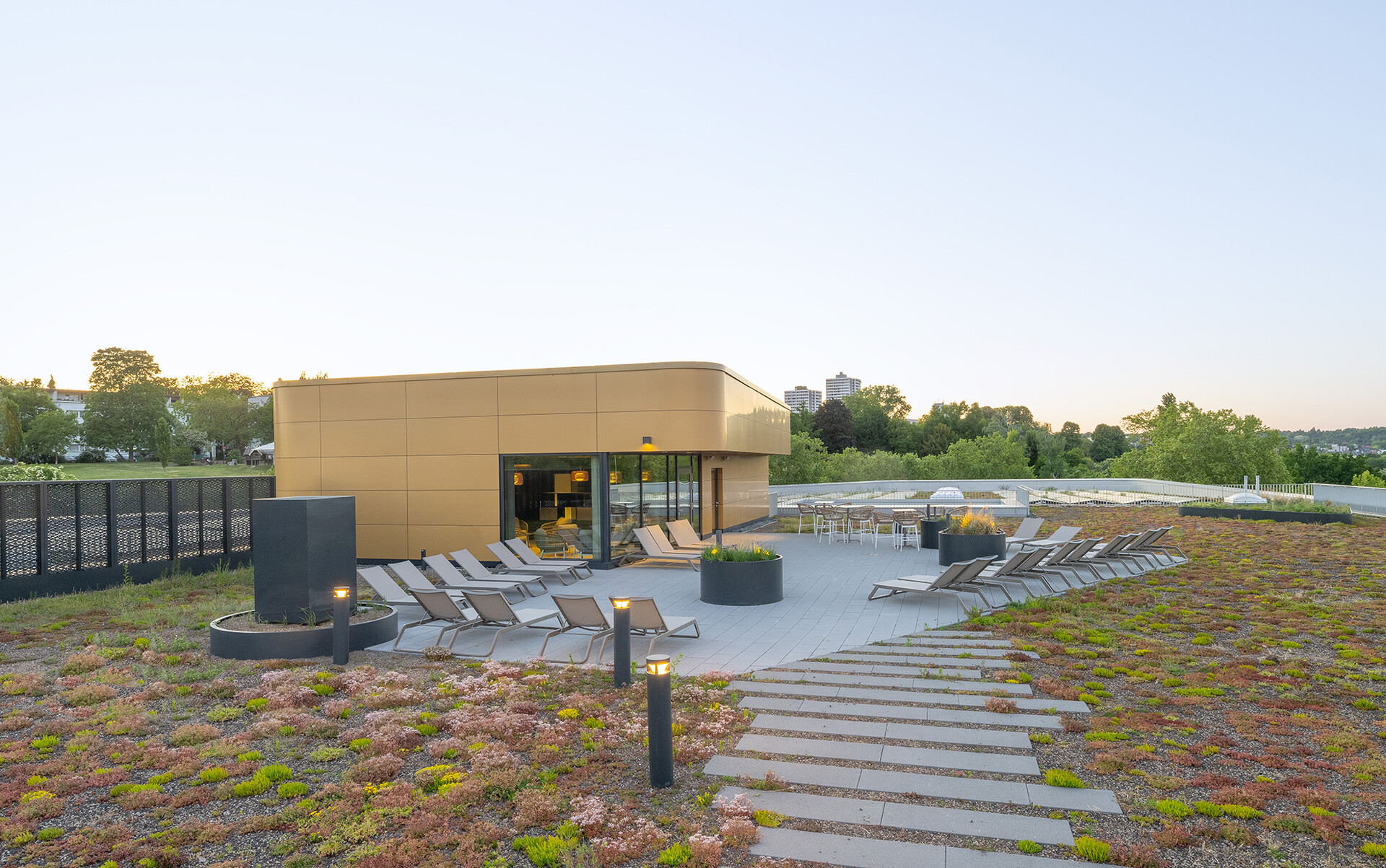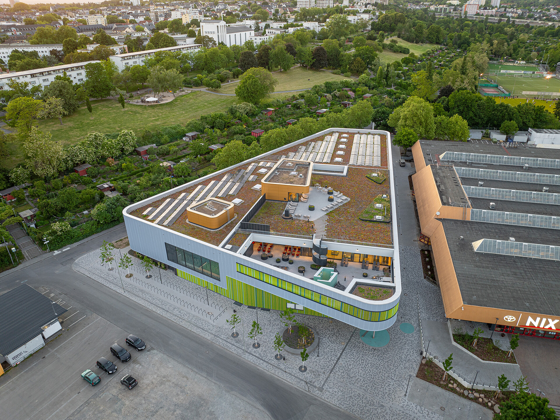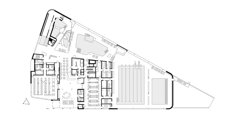 Das Main Bad Bornheim ersetzt das bisherige Panoramabad am Bornheimer Hang und überzeugt durch kompakte Architektur, durchdachte Funktionalität und atmosphärische Gestaltung – bei ressourcenschonender und wirtschaftlicher Betriebsweise. In direkter Nachbarschaft zur Eissporthalle entwickelten 4a Architekten als Generalplaner einen dreigeschossigen Baukörper, der sich kompakt in die bestehende städtebauliche Struktur einfügt und den verfügbaren Raum effizient nutzt. Die klare, reduzierte Kubatur minimiert die Gebäudehülle im Verhältnis zum Volumen und trägt so wesentlich zur Reduktion von Wärmeverlusten bei. Gestalterisch verleihen geschmeidige Rundungen und ein Fassadeneinschnitt im Eingangsbereich der dreieckigen Grundform Dynamik. Die frische Farbgebung der Lamellenverkleidung im Erd- und Obergeschoss sorgt für Lebendigkeit und betont zugleich die Eingangssituation. Aufgrund schwieriger Bodenverhältnisse wurde im Main Bad auf eine aufwändige, energieintensive Unterkellerung verzichtet – ein gestalterisch wie funktional eher ungewöhnlicher Ansatz: Die Technikräume befinden sich im Erdgeschoss, während die Badehalle im ersten Obergeschoss untergebracht ist. Diese Lage ermöglicht den Badegästen einen freien Blick ins Grüne und sorgt für ein lichtdurchflutetes Badeerlebnis mit Panoramaqualität.