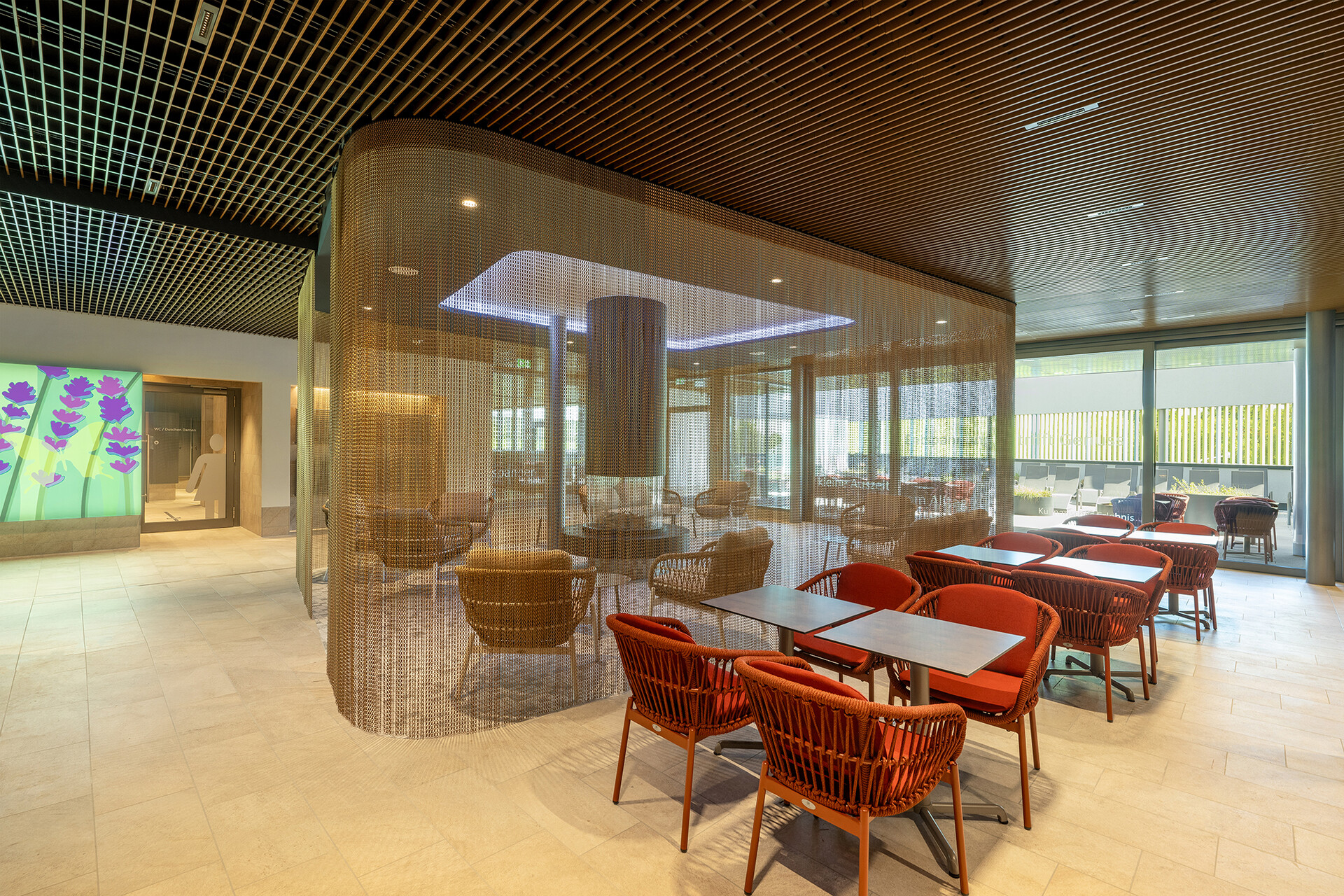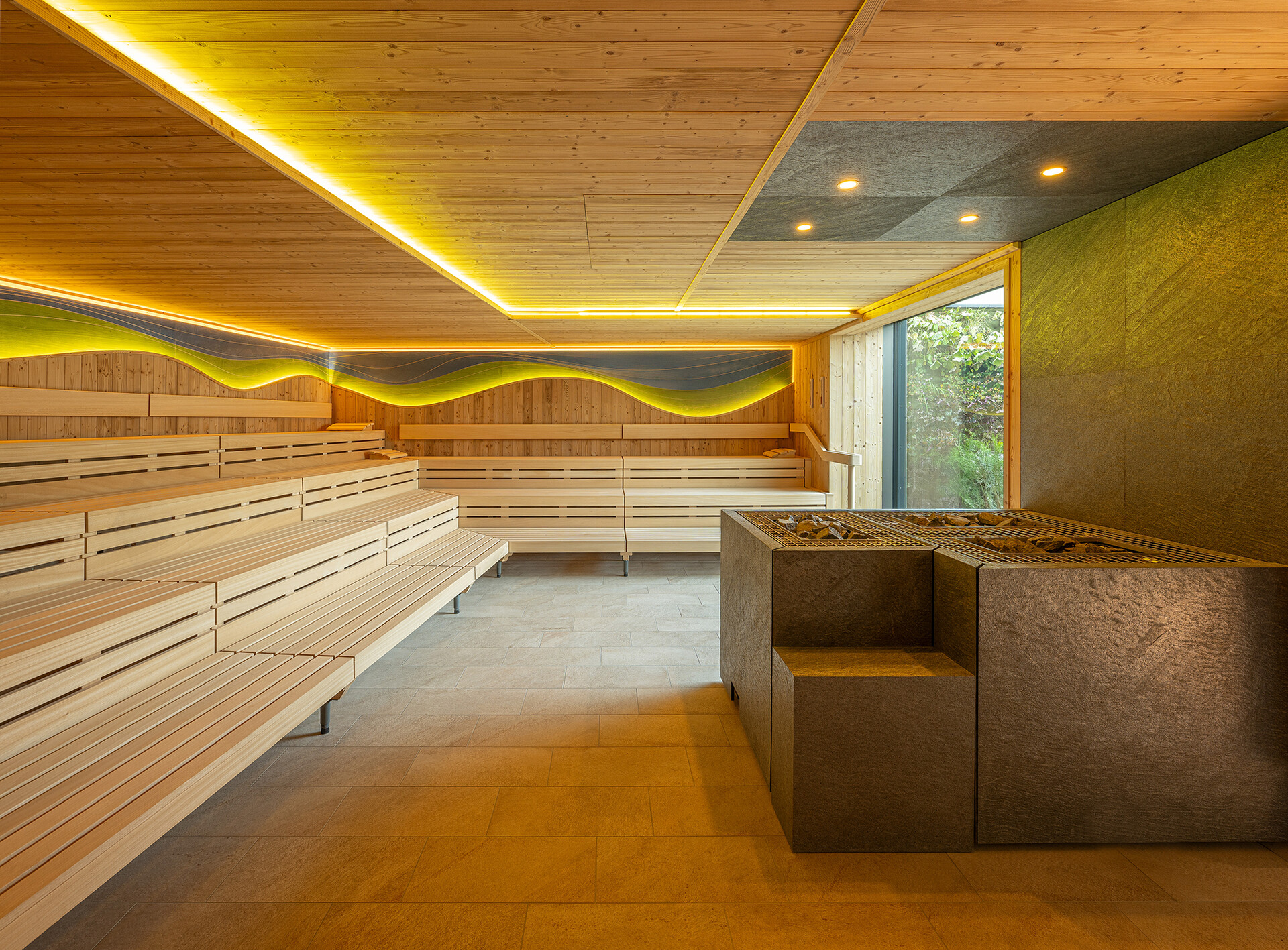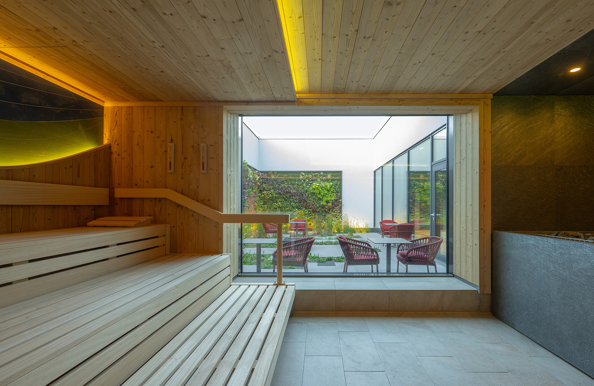 Im Obergeschoss befindet sich die großzügige Saunalandschaft mit fünf verschiedenen Saunen: ein Sanarium, zwei finnische Saunen im Innen- und Außenraum, eine Entspannungssauna und ein Dampfbad. Ein an den Wänden begrüntes Atrium sorgt für natürliche Atmosphäre, Tageslicht und hohe Aufenthaltsqualität. Ruhe- und Kaminzonen, ein Gastronomiebereich sowie ein Außenbereich mit Tauchbecken, Kaltduschen und Sonnenterrasse machen das Angebot vielseitig. Im Dachgeschoss befindet sich zudem ein weiterer Ruheraum mit Ausblick auf die Umgebung.