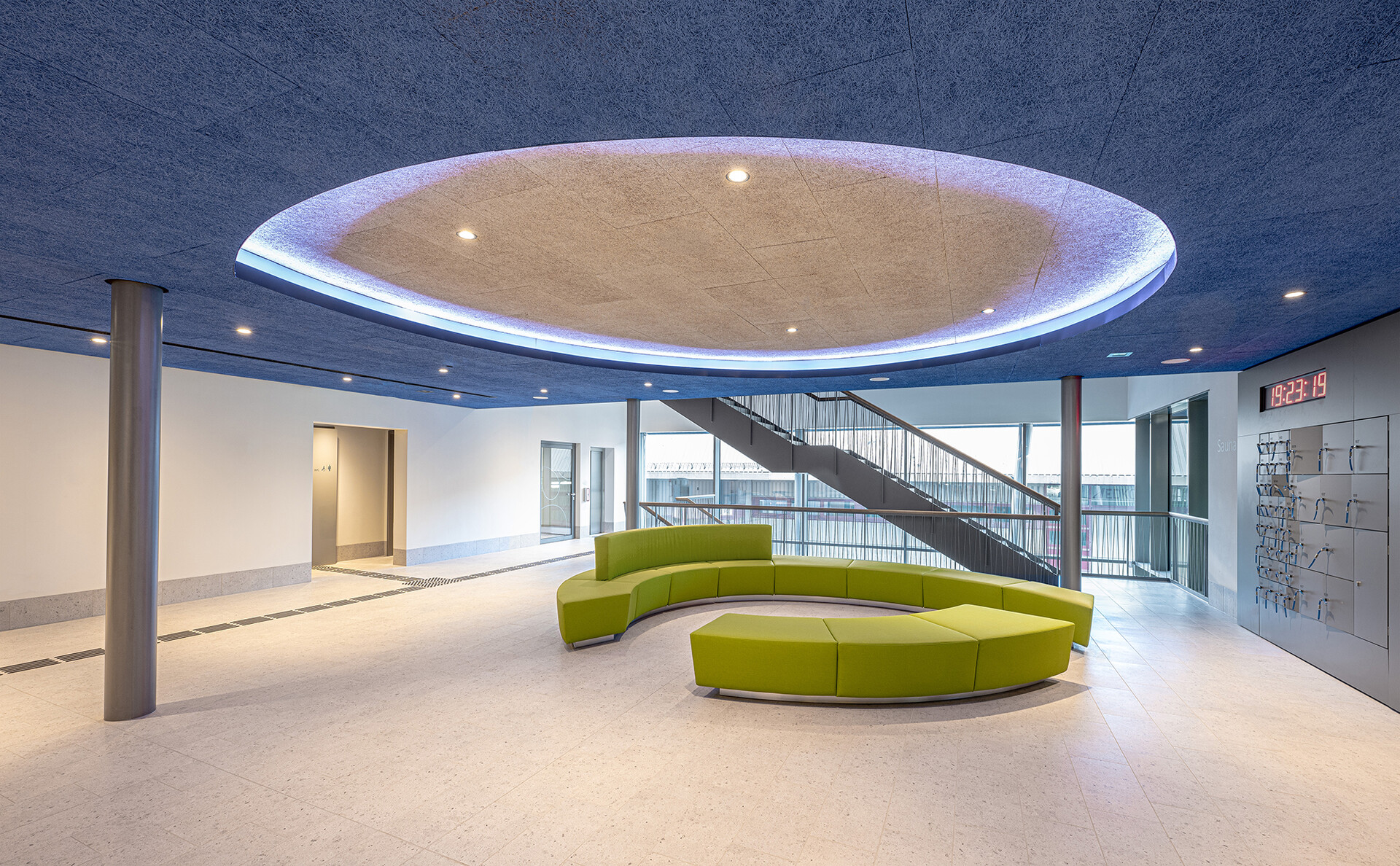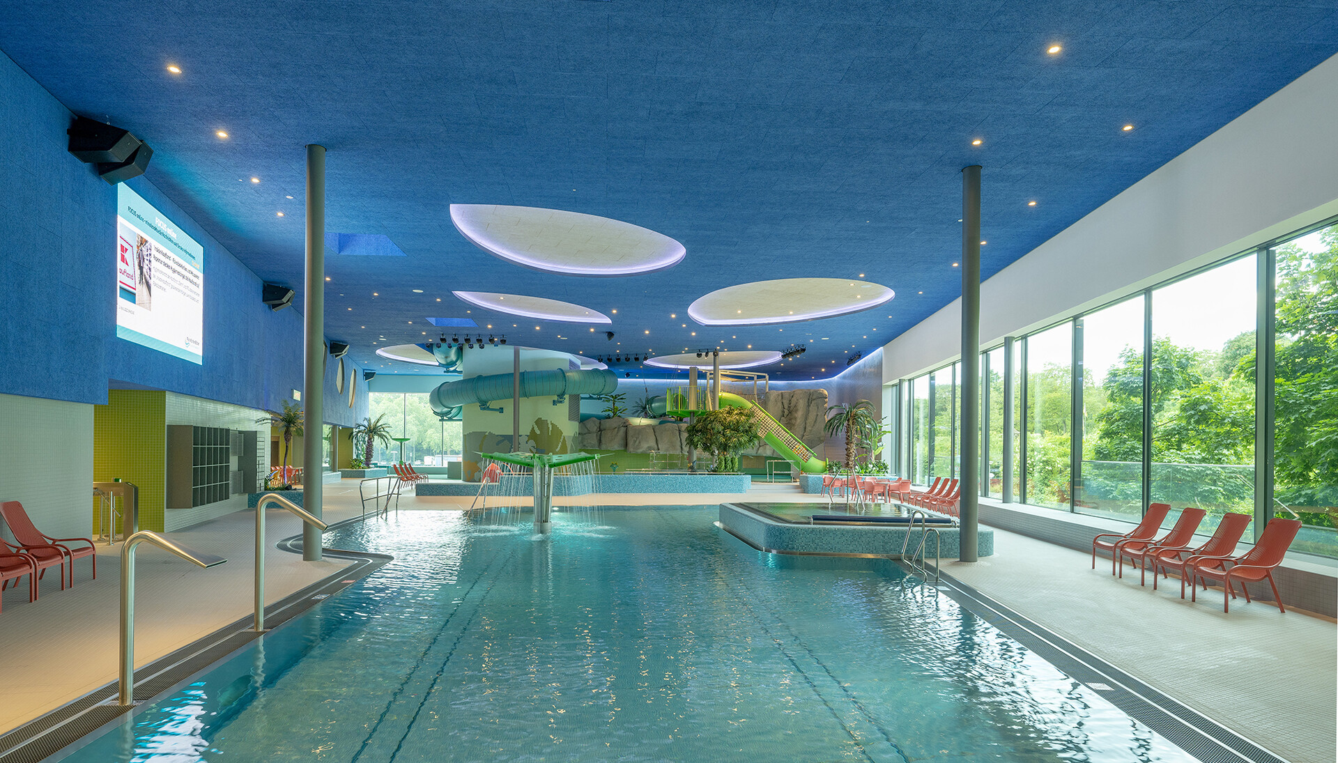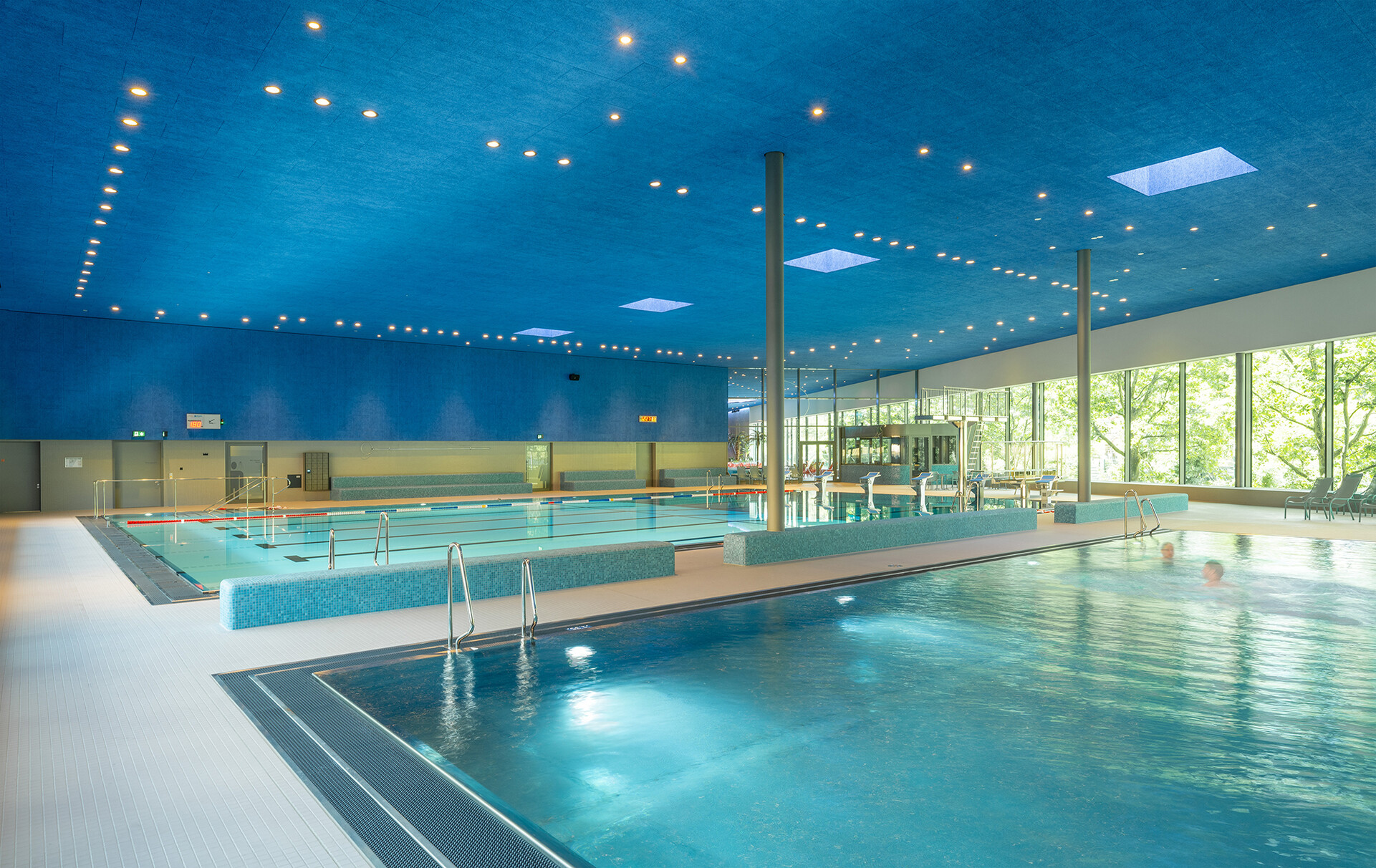 In der Sportbadehalle befindet sich ein 25-Meter-Becken mit sechs Bahnen, einer Ein- bzw. Drei-Meter-Sprunganlage und einer teils variablen Wassertiefe – geeignet für Freizeitschwimmer, Schulklassen und den Vereinssport. Ein separates Lehrschwimmbecken mit breiter Einstiegstreppe rundet das Angebot ab. Die Gestaltung der Halle ist auf das Wesentliche reduziert: klare Formen, ein zurückhaltendes Materialkonzept und schlichte Blautöne schaffen eine ruhige, konzentrierte Atmosphäre. Große Fensterflächen öffnen den Blick in die umgebende Natur. Sitzbänke entlang der Wände laden zum Verweilen und Beobachten ein. Eine raumhohe Verglasung trennt Erlebnis- und Sportbadehalle optisch transparent, aber akustisch wirksam – für konzentriertes Schwimmen und ungestörtes Lernen.