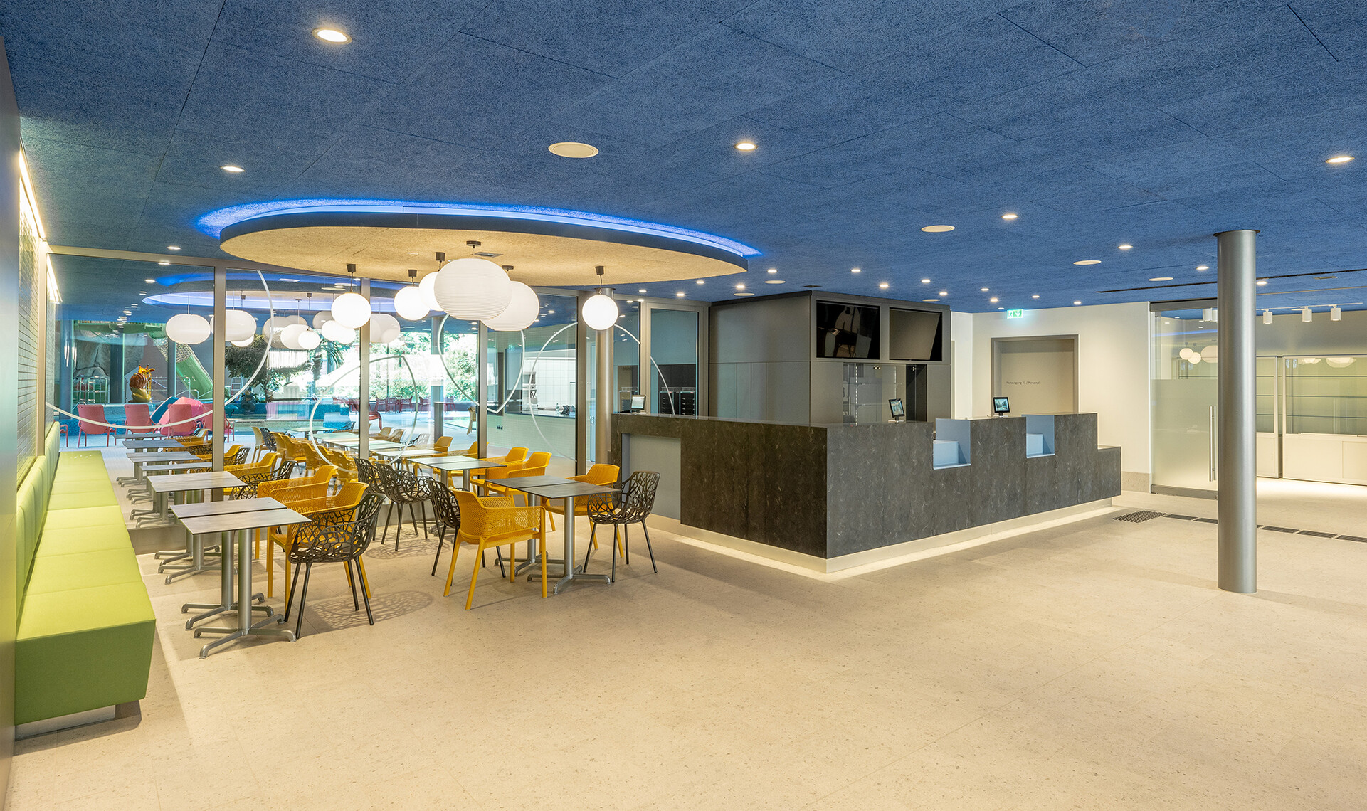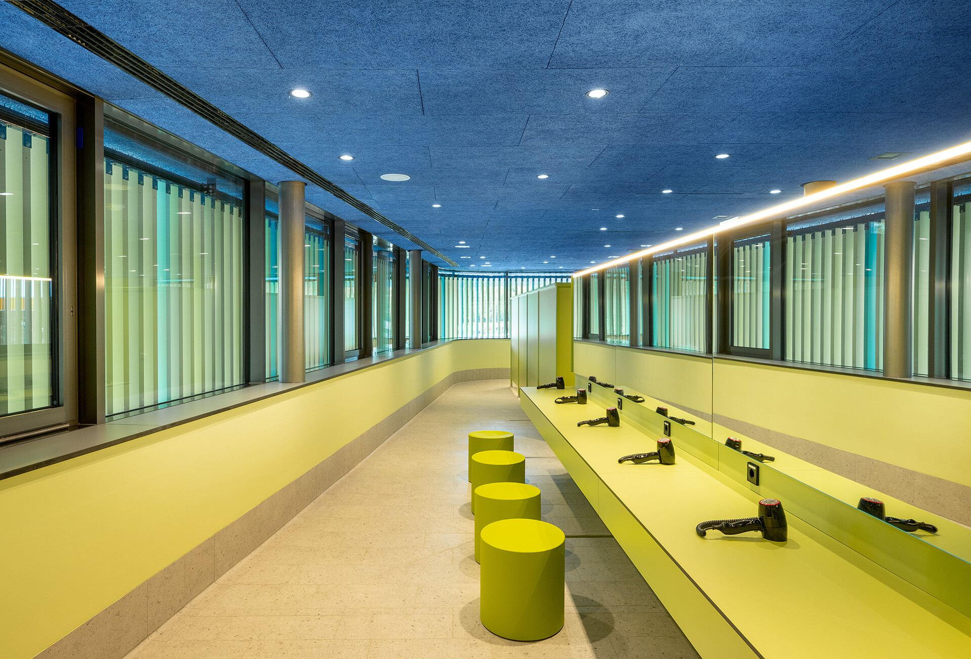 Der Entwurf zeichnet sich durch eine klare, reduzierte Formensprache aus. Außen wie innen wurde bewusst auf Materialien wie Sichtbeton oder Holz verzichtet. Stattdessen dominieren Fliesen, verputzte Flächen und akustisch wirksame Oberflächen, die nicht nur gestalterisch ruhig wirken, sondern sich auch besonders gut reinigen und instand halten lassen. Das Farbkonzept setzt auf kräftige Blau-, Grün- und Gelbtöne, die für Lebendigkeit sorgen.