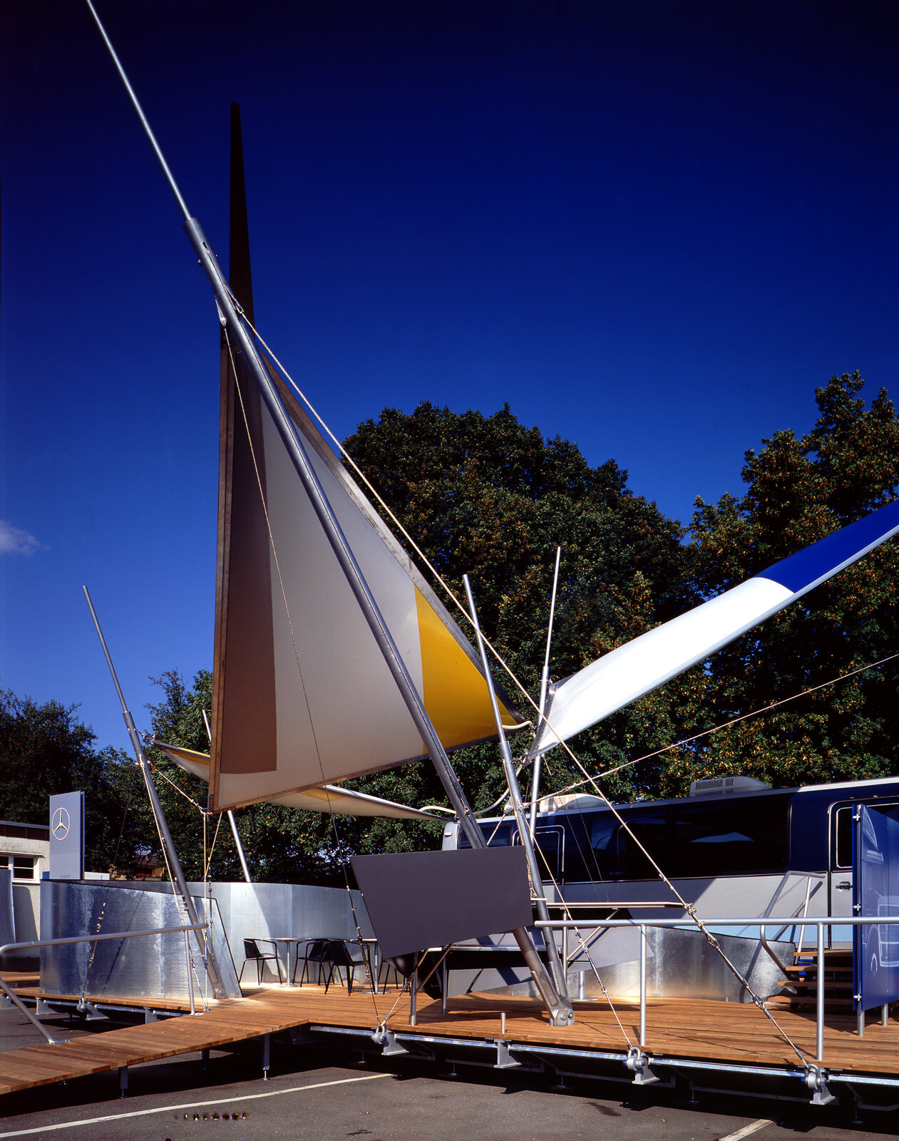 Der vorhandene Konferenzbus wird um ein wiederverwendbares Set ergänzt, das sich für raschen Auf- und Abbau und leichten Transport eignet. Die Konstruktion hebt sich von der Masse der Aussteller ab und wird schon von weitem zum Blickfang: Über einer Plattform von 5 x 12 Metern sind an fünf Pylonen drei flache, dreieckige, mit Luft gefüllte Kissen in Segelform gespannt. Die Pylonen, die jeweils aus zwei Rohren bestehen, sind wiederum über Abspannseile am Trägerrost der Plattform befestigt. Integrierte, mit Wasser gefüllte Wannen tragen zusätzlich zur Stabilisierung des Aufbaus bei.