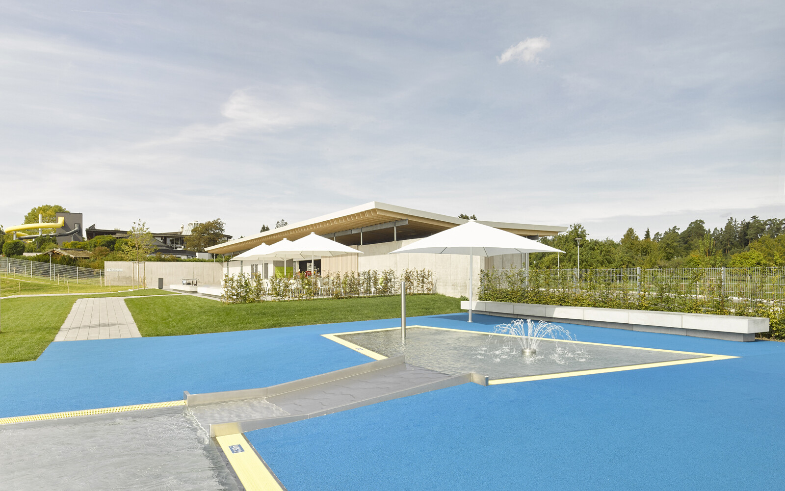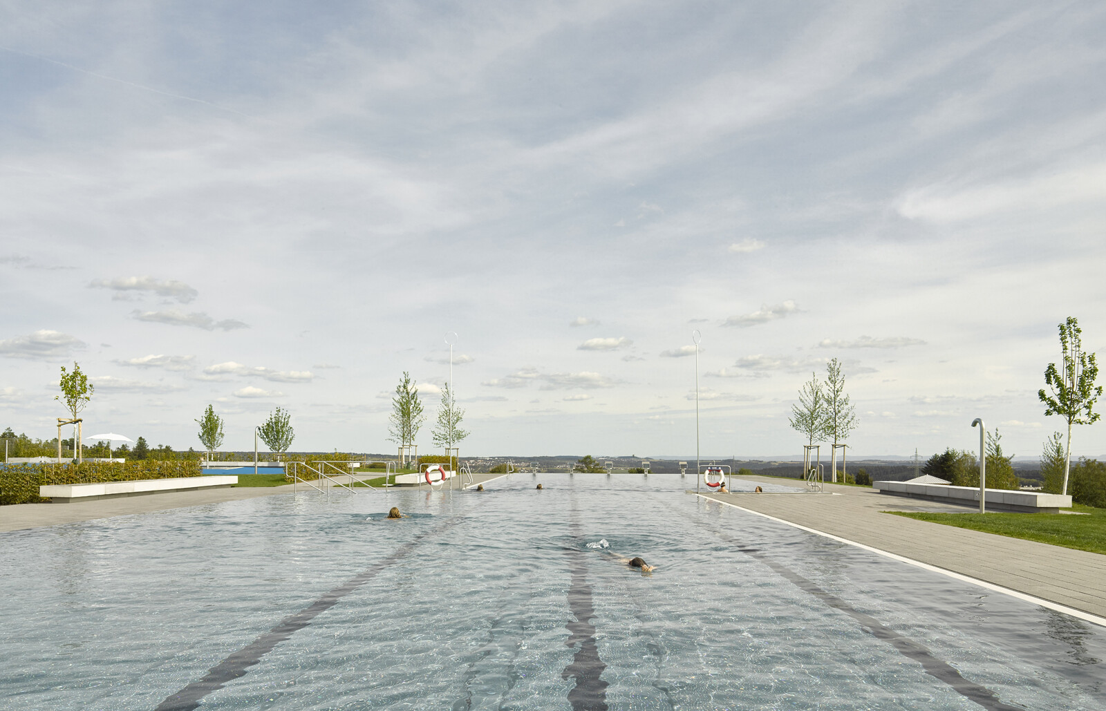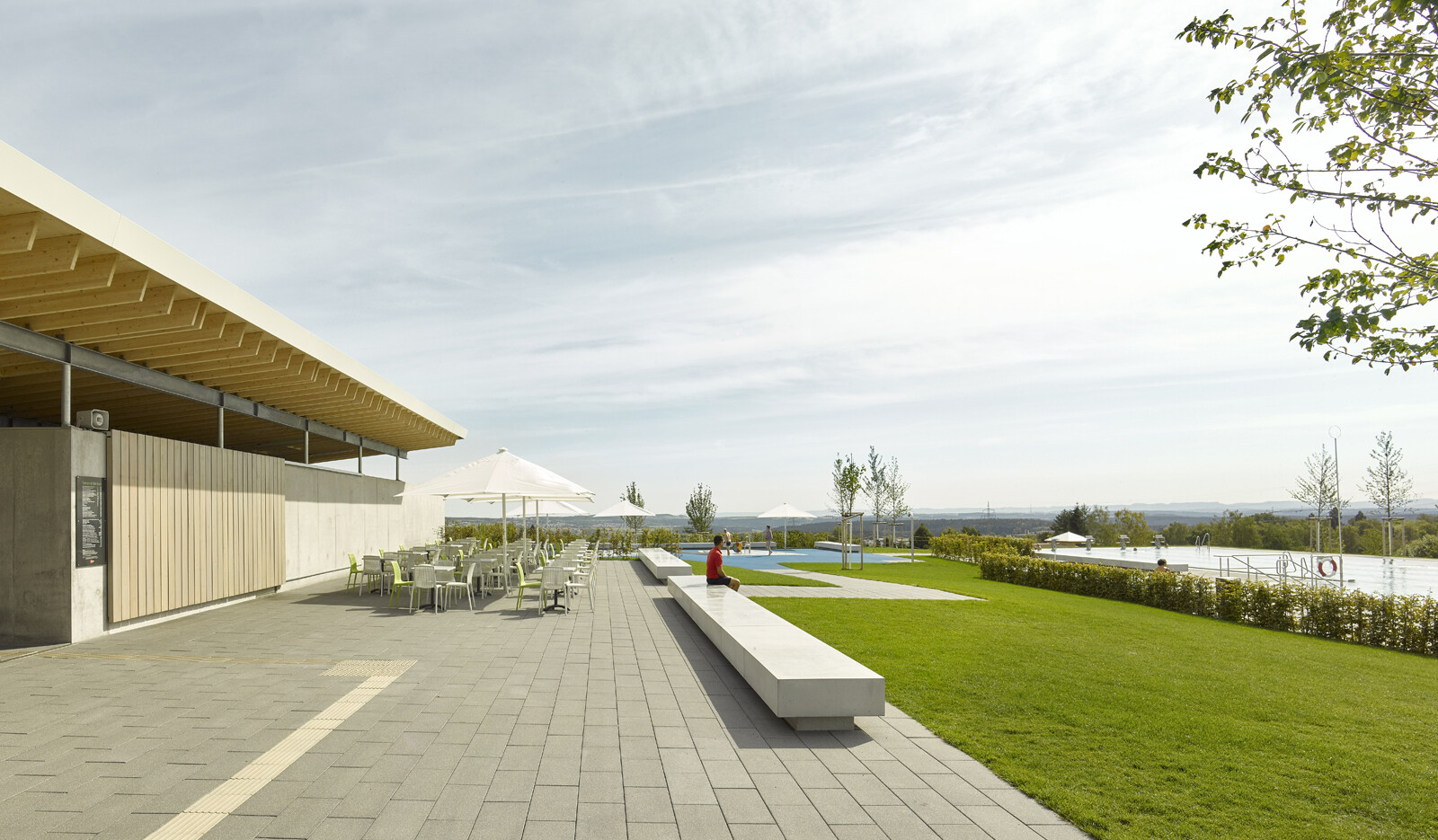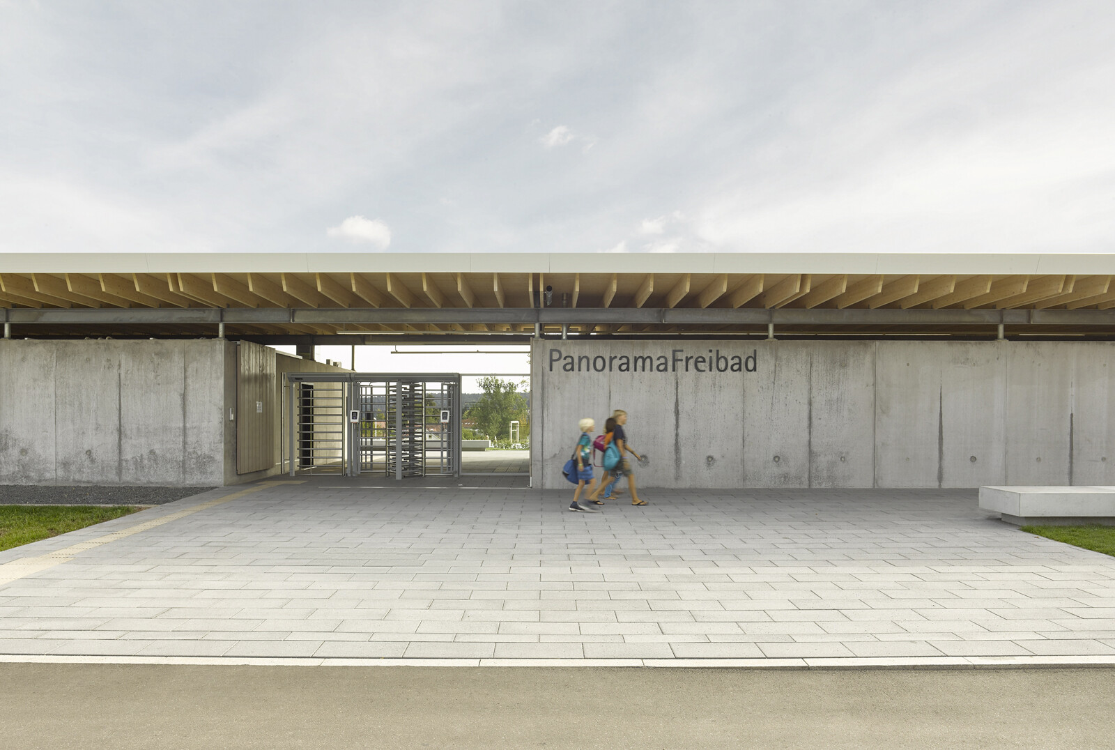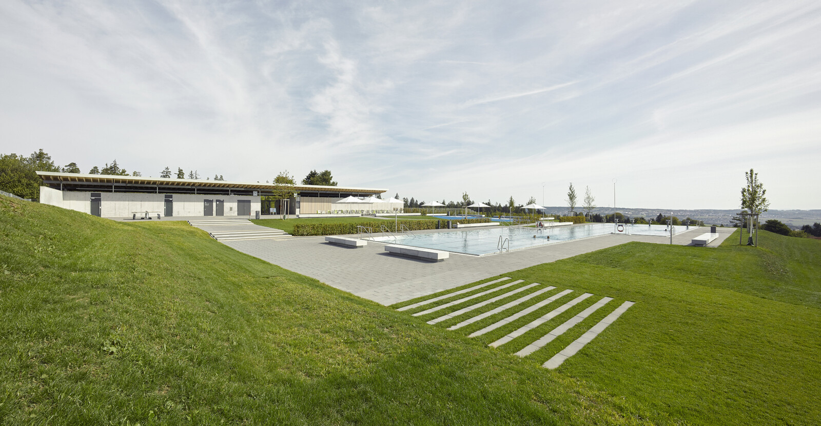 Nach der Sanierung des Erlebnisbereiches und dem Neubau eines Rutschenturms wurde das Badeangebot des Panorama-Bades Freudenstadt um ein Freibad erweitert. Hier können die Besucher in einem kombinierten Schwimmer- und Nichtschwimmerbecken bei wunderbarer Aussicht auf den Schwarzwald 50 Meter lange Bahnen ziehen. Ein separates Kinderplanschbecken, ein Kinderspielplatz und ein Beachvolleyballfeld sowie eine gastronomische Einrichtung ergänzen das Freizeitangebot. Das neue Betriebsgebäude mit schwebendem Dach umfasst im Erdgeschoss die Umkleiden, die sanitären Anlagen und den Freibad-Eingang mit Kassenbereich. Die Schwimmbadtechnik befindet sich im Untergeschoss.