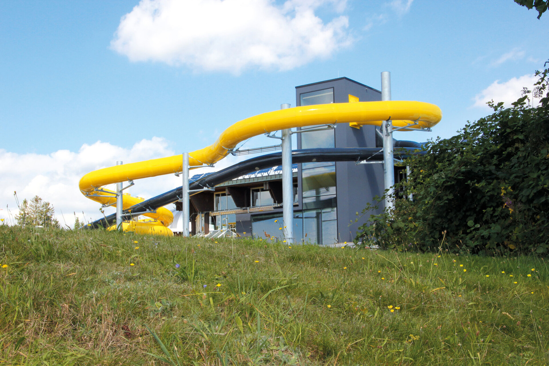 Als zweite Attraktivierung entstand im Anschluss an die Sanierung des Erlebnisbereichs an der Südseite des Bades ein Rutschenturm mit zwei Rutschen. Ein 4-geschossiges Treppenhaus führt zu den Startpunkten der zwei Rutschenröhren – einer Turborutsche mit ca. 68 m Länge und einer Normalrutsche mit ca. 110 m Länge. Nach Süden und Norden ist das Treppenhaus großzügig verglast und bietet Ausblicke in die umliegende Landschaft und die Badehalle. Die Erschließung des Rutschenturmes erfolgt über die Badehalle, ein weiterer Zugang ist durch die südliche Außenglasfassade möglich. Von hier soll ein Verbindungsweg in den Außenlagen zu dem geplanten Freibad führen.