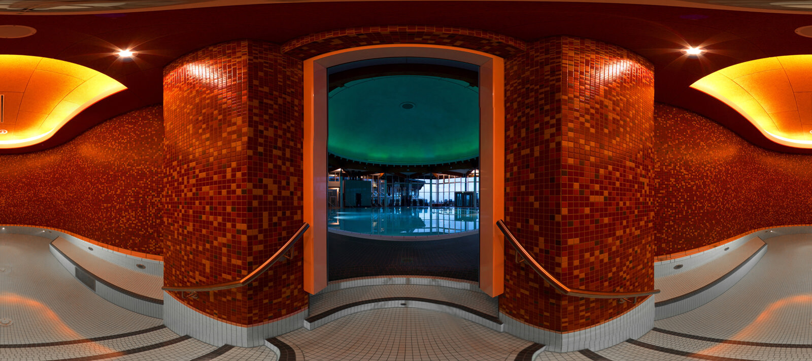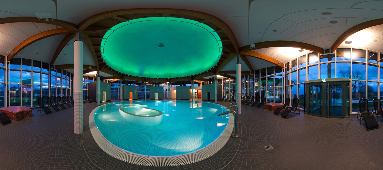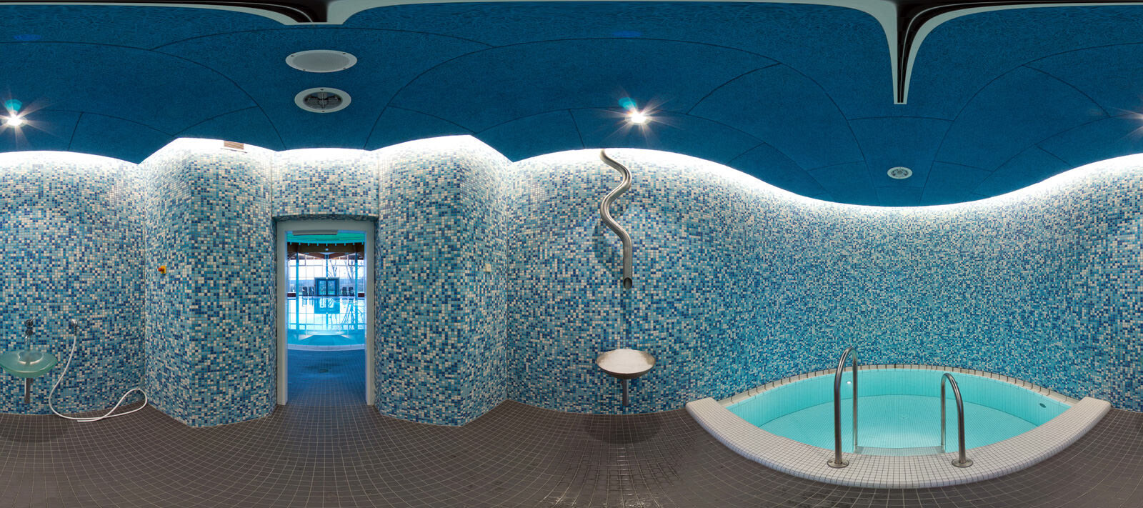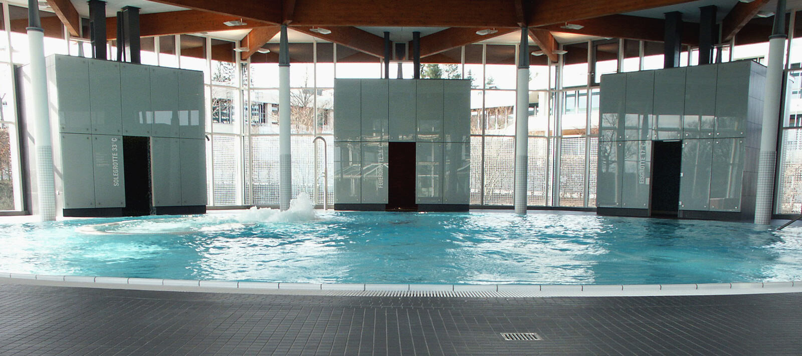 Um die Aufenthaltsqualität im Panorama-Bad zu verbessern, stand eine Sanierung des Erlebnisbereichs an. Im Zuge der Maßnahmen wurde das Badebecken umgestaltet, ein neues Farb- und Materialkonzept für die Badehalle ausgearbeitet und die Raumakustik verbessert. Rund um das Wohlfühlbecken mit Strömungskanal und neu angelegter Sprudel-Insel befinden sich Wärmebänke und Sitznischen zum Relaxen. Der anthrazitfarbene Bodenbelag verleiht dem Erlebnisbereich ein modernes und freundliches Ambiente. Die vier Erlebnisgrotten – Sole-, Feuer-, Eis- und Dampfgrotte – sind entsprechend der Themen mit farbigen Mosaikfliesen verkleidet. Abgehängte Decken und indirekte Beleuchtung sorgen für mehr Komfort in den Grotten und in der Badehalle.