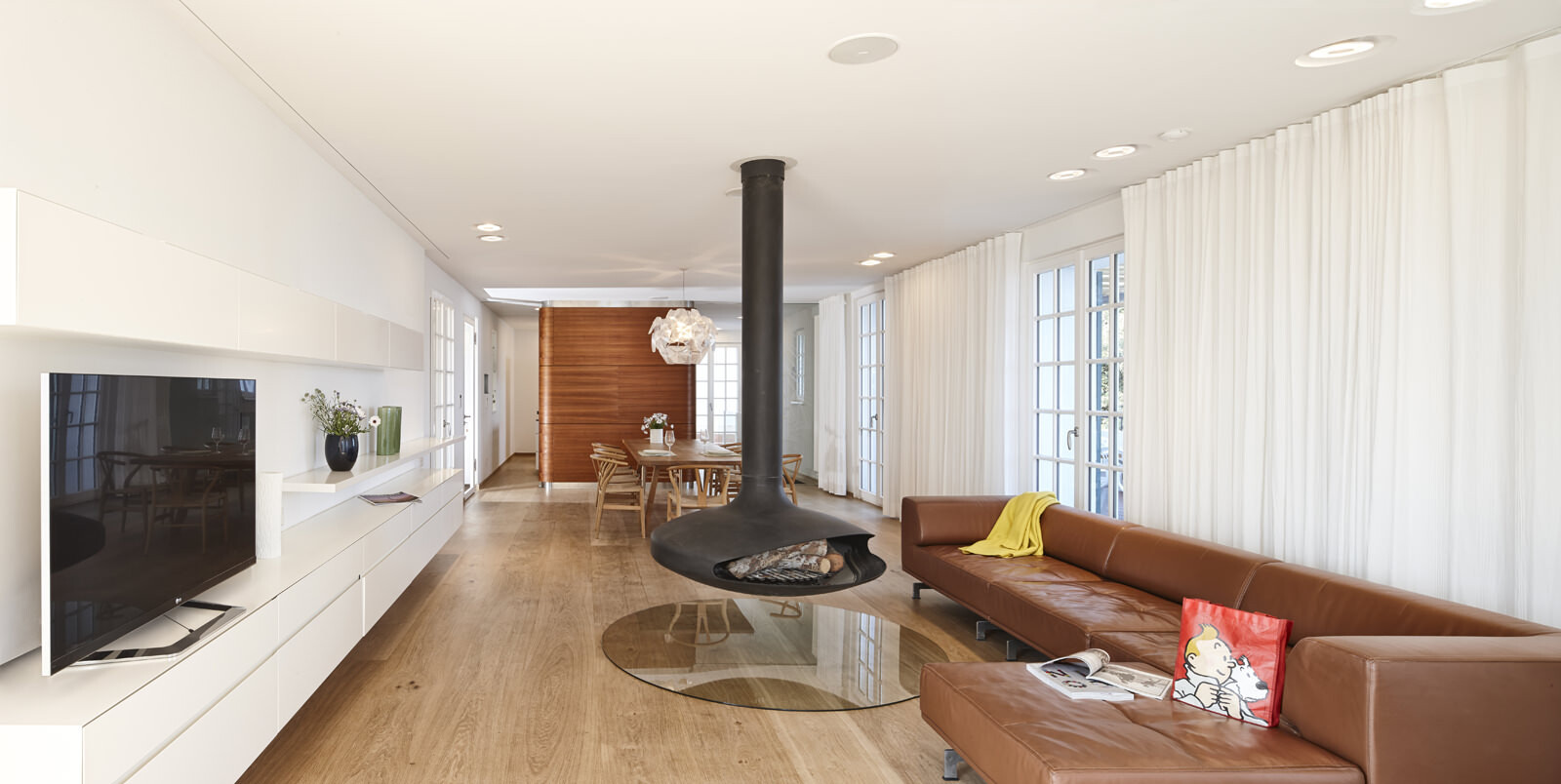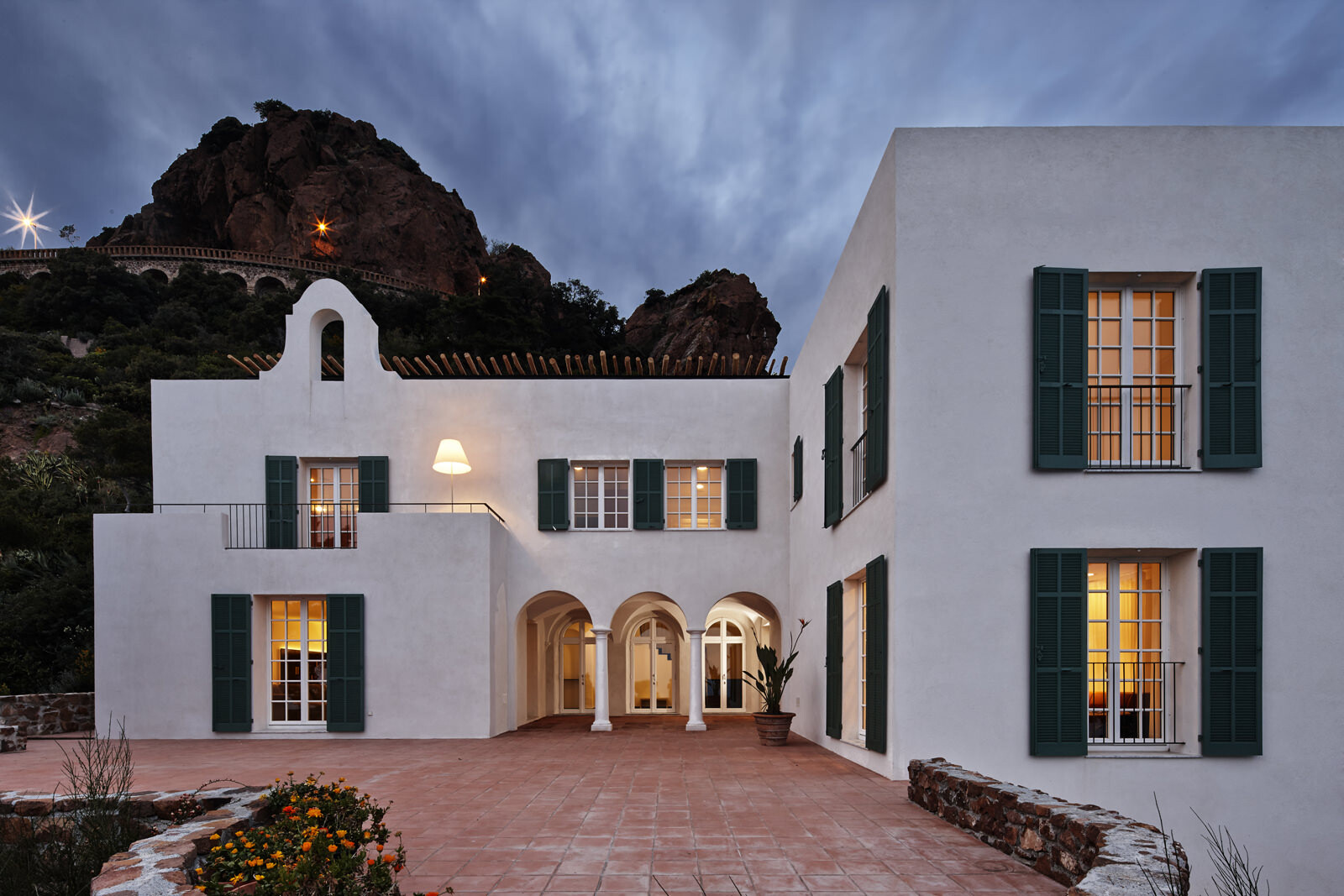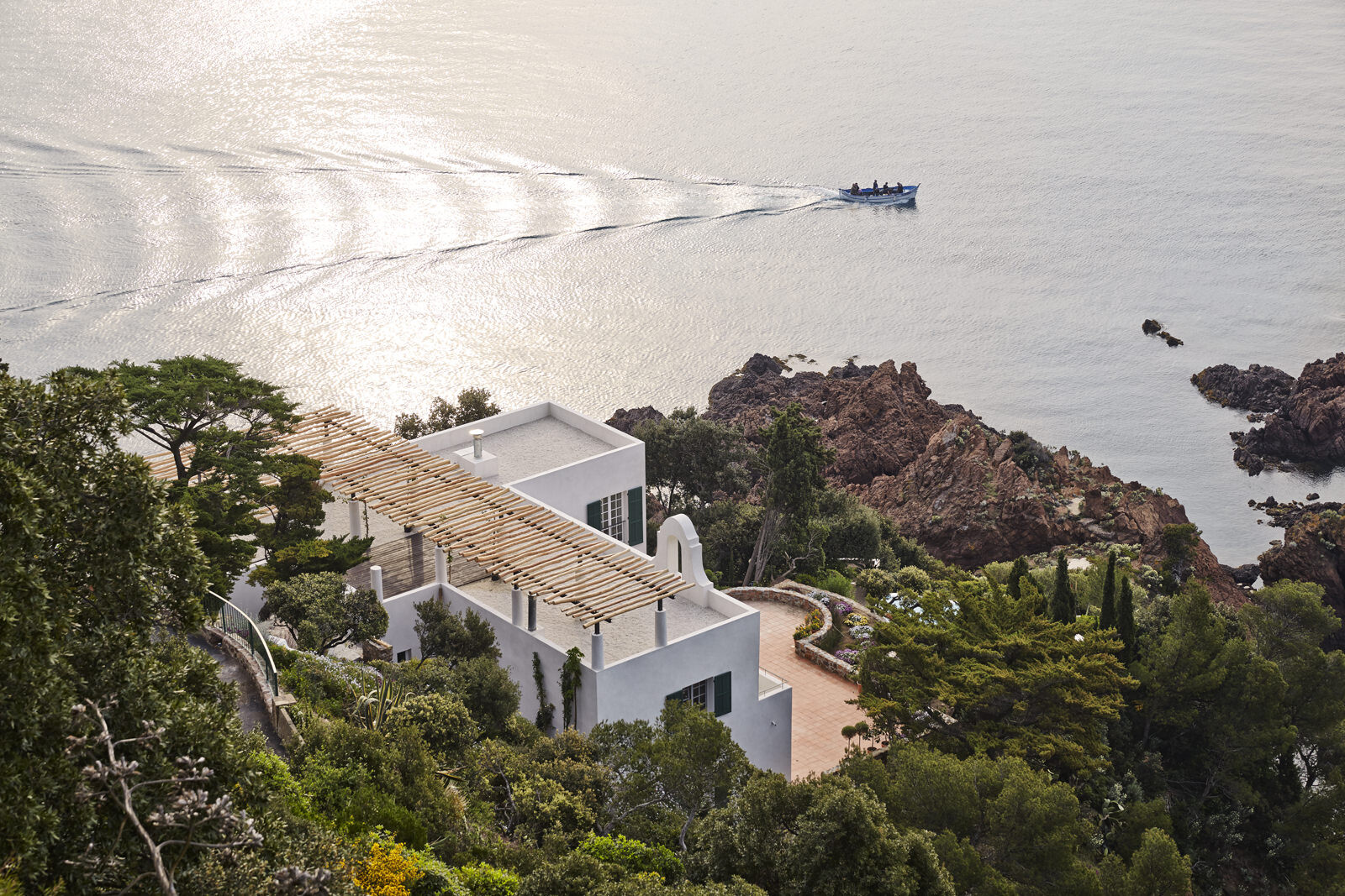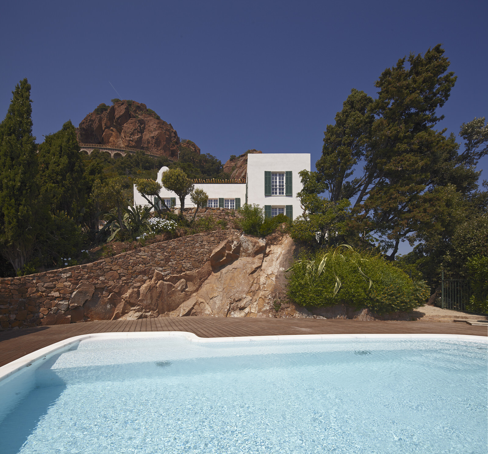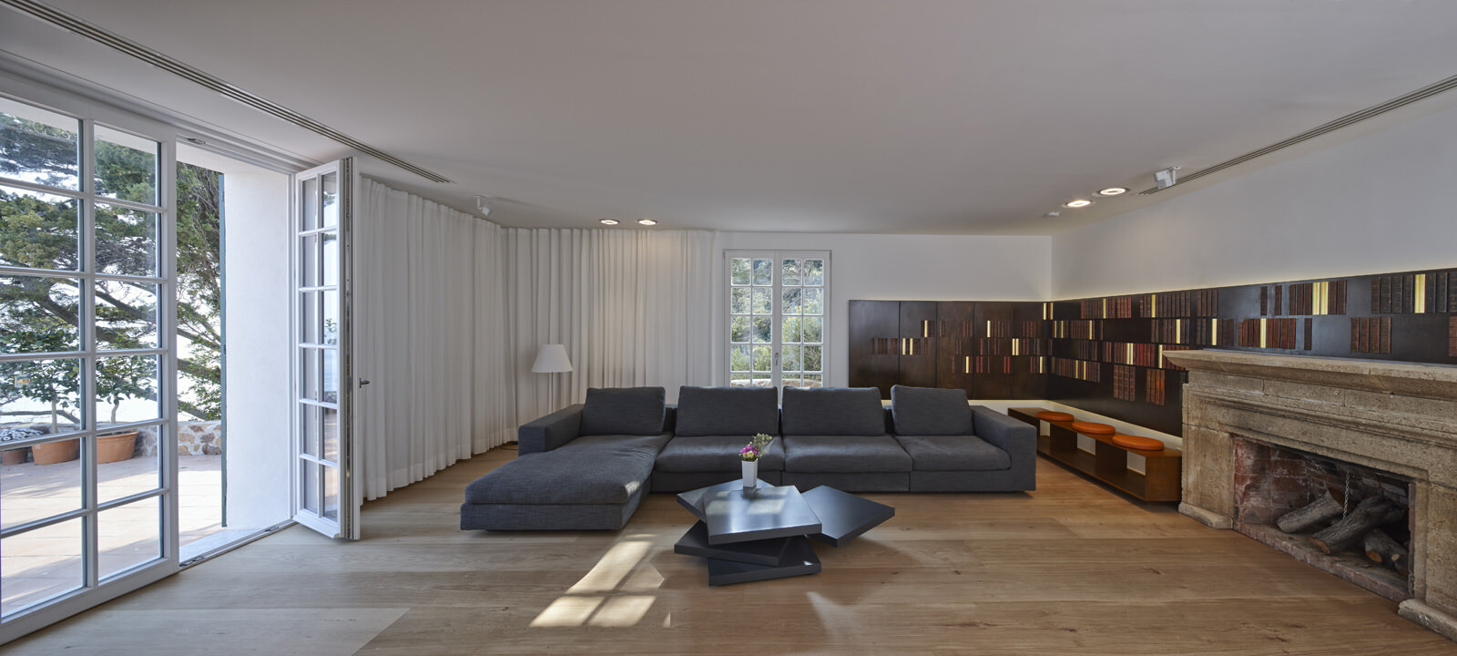 Das Gebäude aus dem Jahr 1926 beeindruckt nicht nur durch seine herrliche Lage an der französischen Riviera, sondern ist auch im Hinblick auf seine Historie etwas Besonderes. Die Villa Le Trident ist die erste von zahlreichen Villen, die der amerikanische Architekt Barry Dierks an der Mittelmeerküste gebaut und auch selbst bewohnt hat. Im Vordergrund der Sanierung stand, dieses architektonische Erbe zu wahren und dem Gebäude zugleich ein modernes Ambiente zu verleihen. Von außen besticht die Villa von Barry Dierks nach wie vor mit ihrer „weißen Architektur“. Weiträumig, lichtdurchflutet und von schlichter Eleganz ist der vorherrschende Raumeindruck seit der Umgestaltung. Für einen fließenden Übergang der unterschiedlichen Bereiche wurden bestehende Innenwände im Erd- und Obergeschoss entfernt. Lange Fensterfronten, weiße Möbel, weiß lasierte Eichenmassivholzdielen und Glaselemente verleihen den Räumen eine helle und ruhige Atmosphäre. Markante Akzente in diesem reduziert gestalteten Ambiente setzen einzelne Elemente wie Möbel, ein von der Decke abgehängter Kamin sowie das von den Architekten gestaltete Wandelement in der Bibliothek. Blickfang auf beiden Ebenen sind die mit Teakholz verkleideten, frei stehenden Kuben. Sie erinnern in ihrer Materialität an einen Schiffsrumpf und stellen so einen lokalen Bezug her.