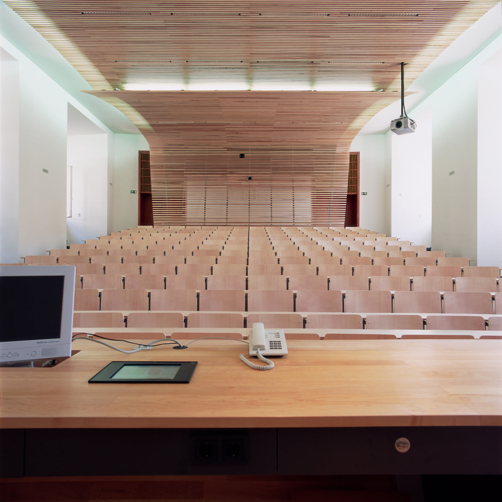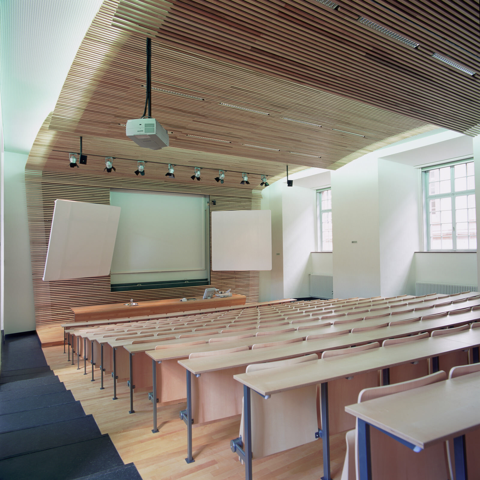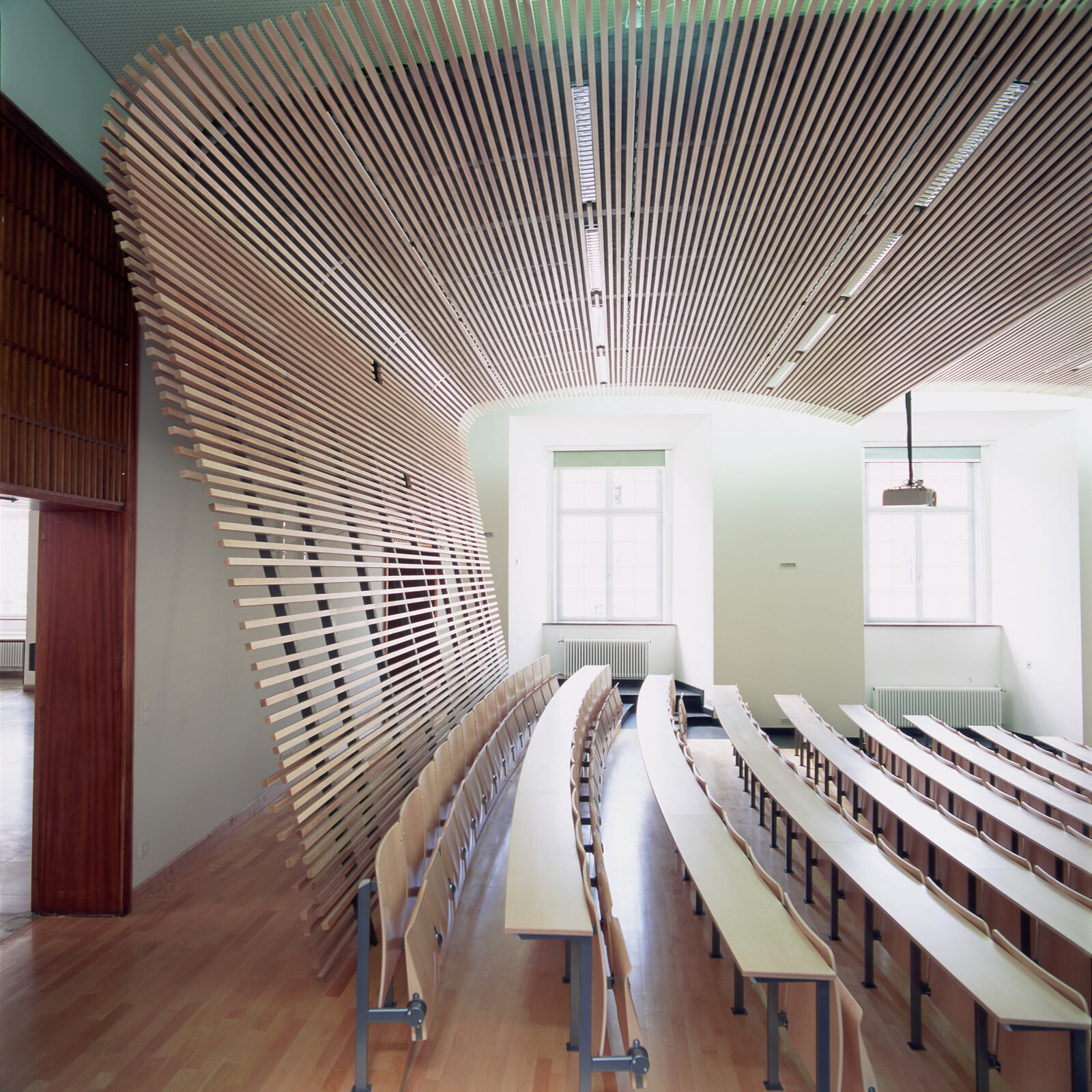 Der für 182 Studenten konzipierte Hörsaal im Mannheimer Schloss wurde im Rahmen des Projektes „Renaissance des Barockschlosses“ umgebaut. Wegen fehlender öffentlicher Mittel übernahmen Sponsoren die Finanzierung. Im Gegenzug kann der Hörsaal zur Präsentation des Unternehmens und letztlich auch zur Akquirierung zukünftiger Mitarbeiter genutzt werden. Diese speziellen Parameter waren maßgeblich für den Entwurf. Ein dynamisch gespanntes Lamellenband löst sich in Form und Materialität vom umgebenden historischen Rahmen und wird damit gleichermaßen zum Symbol für die Verbundenheit zu den ins Berufsleben startenden Studenten wie auch für den Zusammenhalt der Firmen innerhalb der Röchling-Holdinggesellschaft. In dem alten Schloss entsteht eine neue Dynamik, die das innovative Zusammenspiel von Studenten, Sponsoren und der Universität zum Ausdruck bringt.