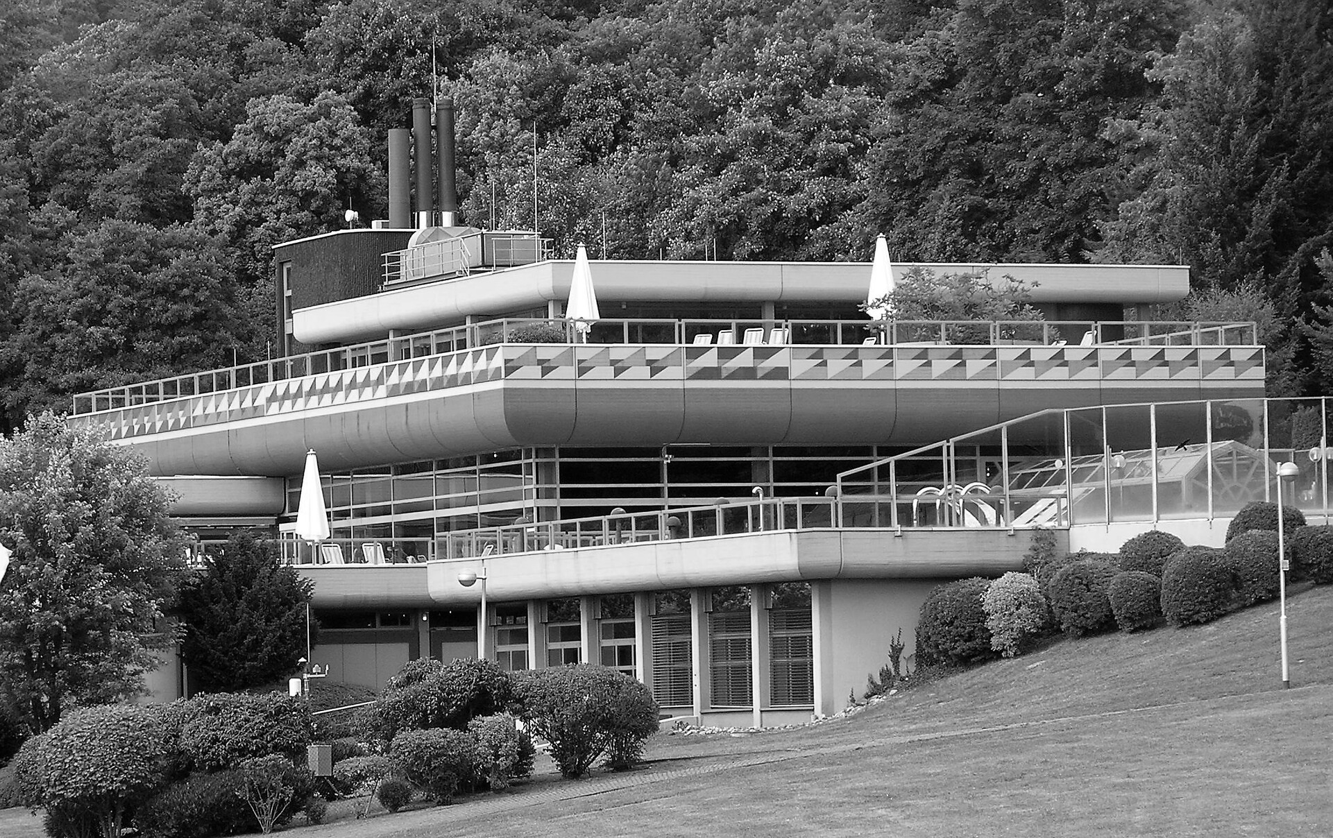 Das Kurbad Königstein steht seit 2013 unter Denkmalschutz. Geplant wurde das Bad in den 70er Jahren von den Architekten Geier + Geier in Zusammenarbeit mit dem Stuttgarter Künstler Otto Herbert Hajek. Nun soll das denkmalgeschützte Gebäude saniert und erweitert werden. Der am Hang gelegene, asymmetrisch gestaltete Baukörper umfasst vier Geschosse mit vorgelagerten Terrassenflächen. Charakteristisch für das Bad ist zum Einen seine Materialität – das Sichtbeton-Gebäude spiegelt den Architekturstil des Brutalismus – zum Anderen die markante Farbgebung, welche typisch für den Künstler Hajek ist. Durch die Komplementärfarben Blau und Orange setzt sich der Baukörper weithin sichtbar vom umgebenden Grünraum und im Stadtbild ab. Diese charakteristische Gestaltung, die auch im Innenraum bis ins Detail fortgeführt wurde, soll im Zuge der Sanierung erhalten bleiben und aufgefrischt werden. Im Fokus der Sanierungsmaßnahmen steht, die Attraktivität des Gebäudes zu steigern und den Saunabereich zu erweitern sowie die Gebäudetechnik unter energetischem und wirtschaftlichem Blickwinkel auf einen zeitgemäßen Stand zu bringen.