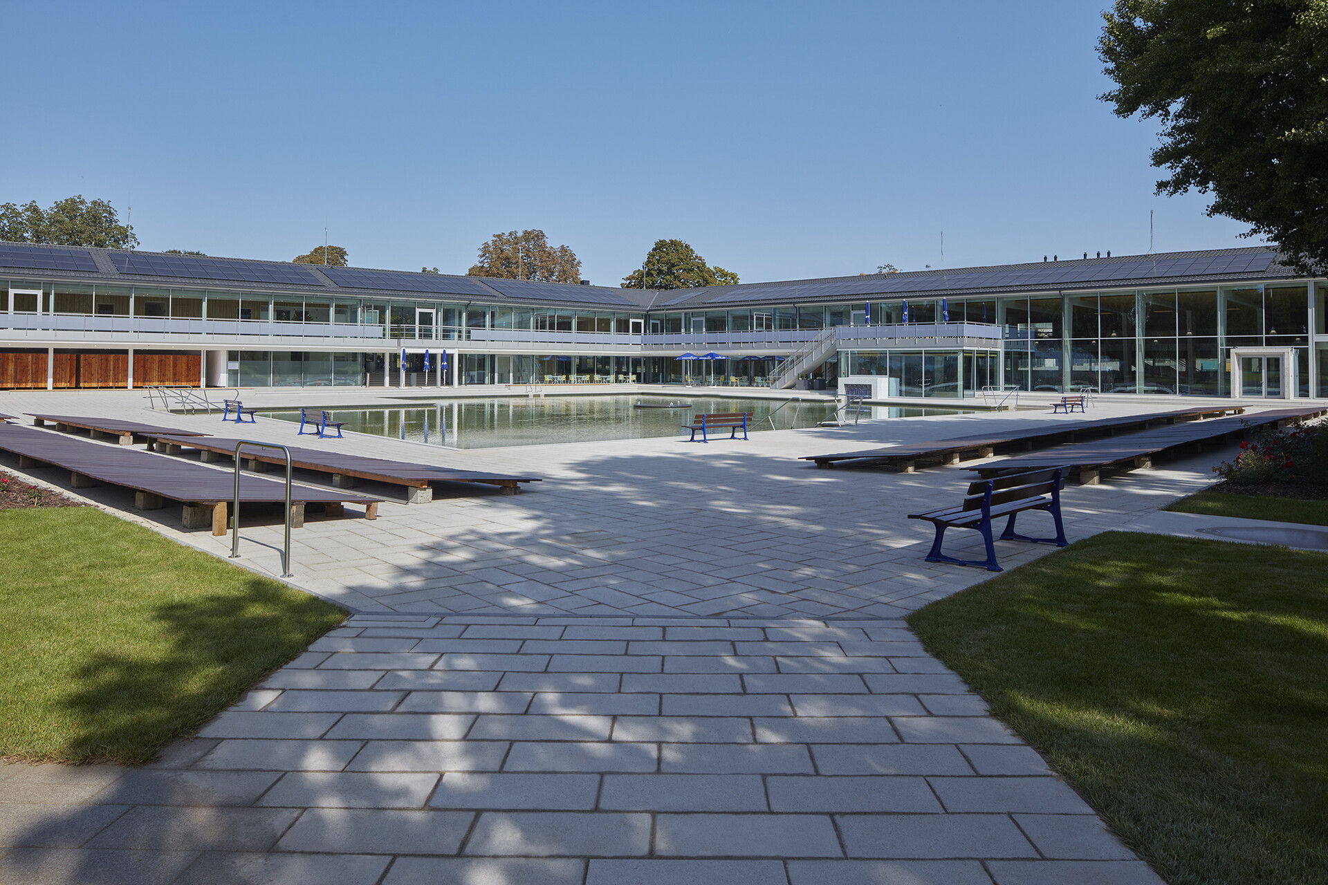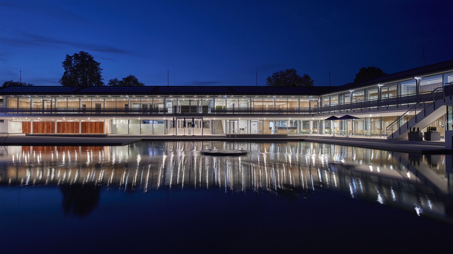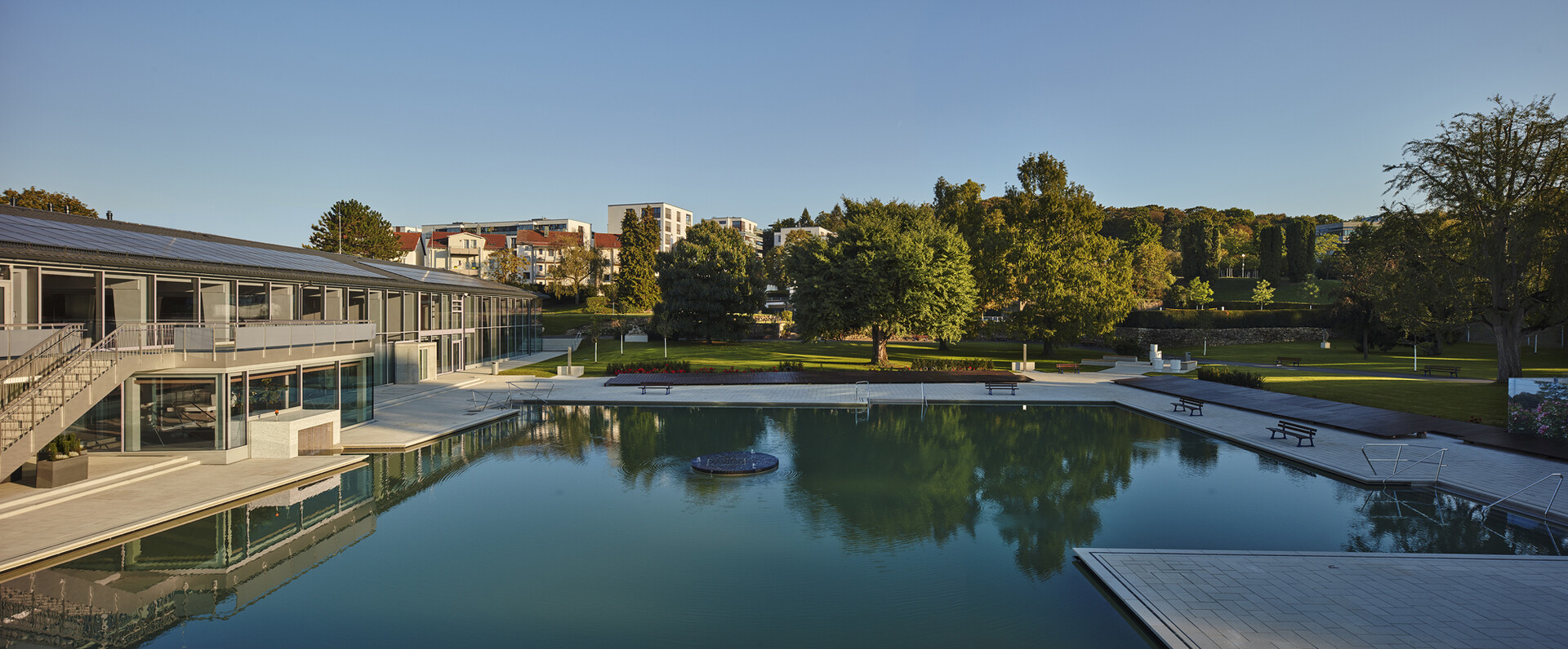 163 Jahre Geschichte verleihen dem Mineralbad Berg Alleinstellungmerkmal - und auch der Kult der Stuttgarter um das Bad ist groß. Im Fokus der Sanierung des ältesten Stuttgarter Mineralbades stand, den besonderen Charakter des Bades zu wahren und die Neugestaltung in Anlehnung an die 50er Jahre zeitgemäß zu interpretieren. Die Herausforderung bei der gestalterischen und technischen Sanierung lag darin, die richtige Balance zwischen Erhalt, Erneuerung und Ergänzung zu finden. So blieb der L-förmige Baukörper mit Nord- und Ostflügel, in den das quadratische Außenbecken mit Seecharakter eingebettet liegt, in seiner ursprünglichen Form erhalten und wurde bis auf den Rohbau zurückgeführt. Lediglich das alte Bewegungsbad im Osten der Anlage wurde abgerissen und durch einen Anbau an die Badehalle, der die charakteristische Gebäudestruktur aufgreift, ersetzt. Das Foyer am Knotenpunkt der Gebäudeachsen ist nach wie vor die zentrale Schnittstelle im Bad. Offen und transparent gestaltet, gibt die Eingangshalle den Blick zum Außenbecken und in den Garten frei, sodass eine weitläufige und luftige Atmosphäre im Innenraum entsteht. Die Badehalle wurde im Erdgeschoss und auch im Obergeschoss durch eine Galerie mit Liegeflächen erweitert. Gestaltgebendes Element in der Badehalle ist eine neue Holzlamellendecke, die sich in sanftem Schwung von der Wandfläche über die Decke bis hin zur Glasfassade schwingt. Sie verleiht dem gesamten Innenraum eine warme Atmosphäre und sorgt für eine gute Akustik. Dem Innenraum verleihen ausgewählte Materialien und ein stimmiges Farbkonzept eine angenehme Atmosphäre und sorgen für eine hohe Aufenthaltsqualität im Bad.