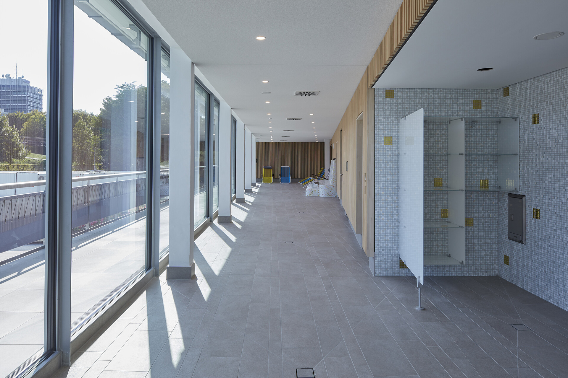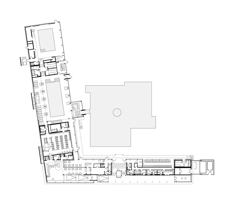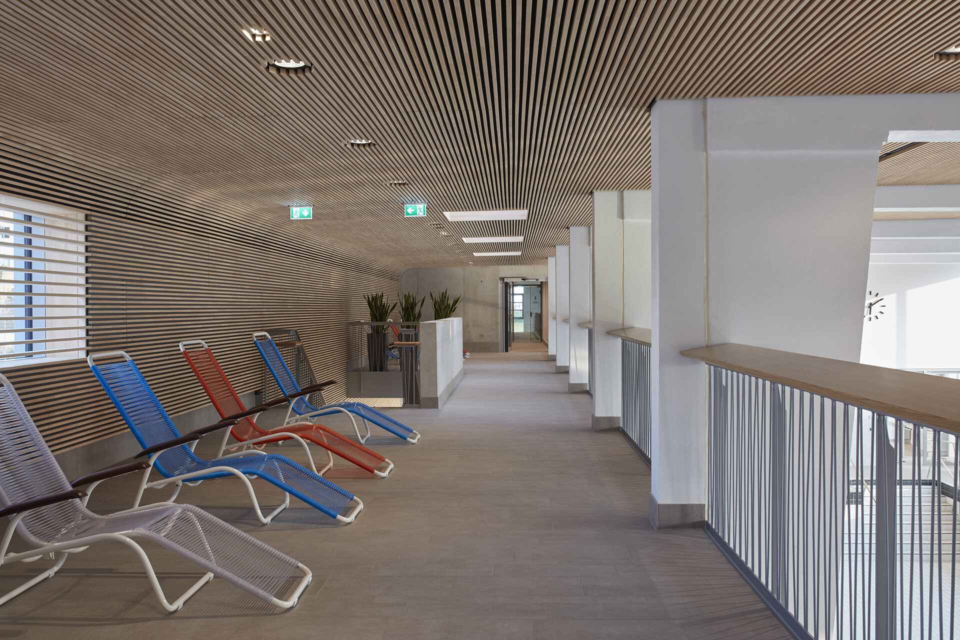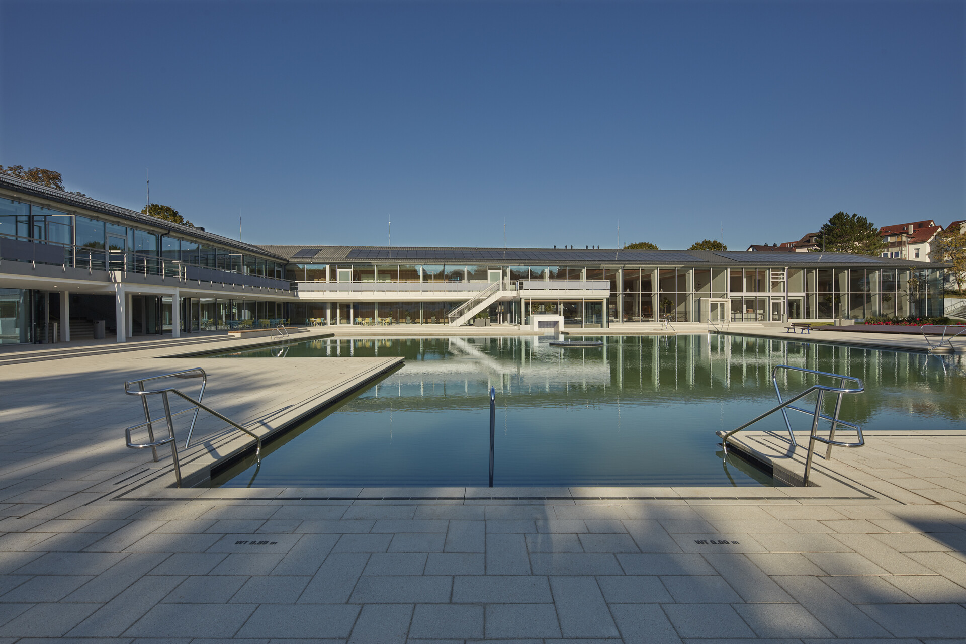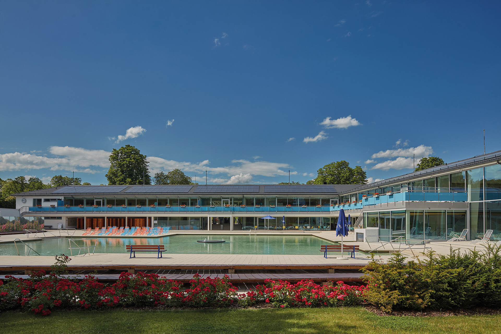 163 Jahre Geschichte verleihen dem Mineralbad Berg Alleinstellungmerkmal - und auch der Kult der Stuttgarter um das Bad ist groß. Im Fokus der Sanierung des ältesten Stuttgarter Mineralbades stand, den besonderen Charakter des Bades zu wahren und die Neugestaltung in Anlehnung an die 50er Jahre zeitgemäß zu interpretieren. Die Herausforderung bei der gestalterischen und technischen Sanierung lag darin, die richtige Balance zwischen Erhalt, Erneuerung und Ergänzung zu finden. So blieb der L-förmige Baukörper mit Nord- und Ostflügel, in den das quadratische Außenbecken mit Seecharakter eingebettet liegt, in seiner ursprünglichen Form erhalten und wurde bis auf den Rohbau zurückgeführt. Lediglich das alte Bewegungsbad im Osten der Anlage wurde abgerissen und durch einen Anbau an die Badehalle, der die charakteristische Gebäudestruktur aufgreift, ersetzt. Das Foyer am Knotenpunkt der Gebäudeachsen ist nach wie vor die zentrale Schnittstelle im Bad. Offen und transparent gestaltet, gibt die Eingangshalle den Blick zum Außenbecken und in den Garten frei, sodass eine weitläufige und luftige Atmosphäre im Innenraum entsteht. Die Badehalle wurde im Erdgeschoss und auch im Obergeschoss durch eine Galerie mit Liegeflächen erweitert. Gestaltgebendes Element in der Badehalle ist eine neue Holzlamellendecke, die sich in sanftem Schwung von der Wandfläche über die Decke bis hin zur Glasfassade schwingt. Sie verleiht dem gesamten Innenraum eine warme Atmosphäre und sorgt für eine gute Akustik. Dem Innenraum verleihen ausgewählte Materialien und ein stimmiges Farbkonzept eine angenehme Atmosphäre und sorgen für eine hohe Aufenthaltsqualität im Bad.