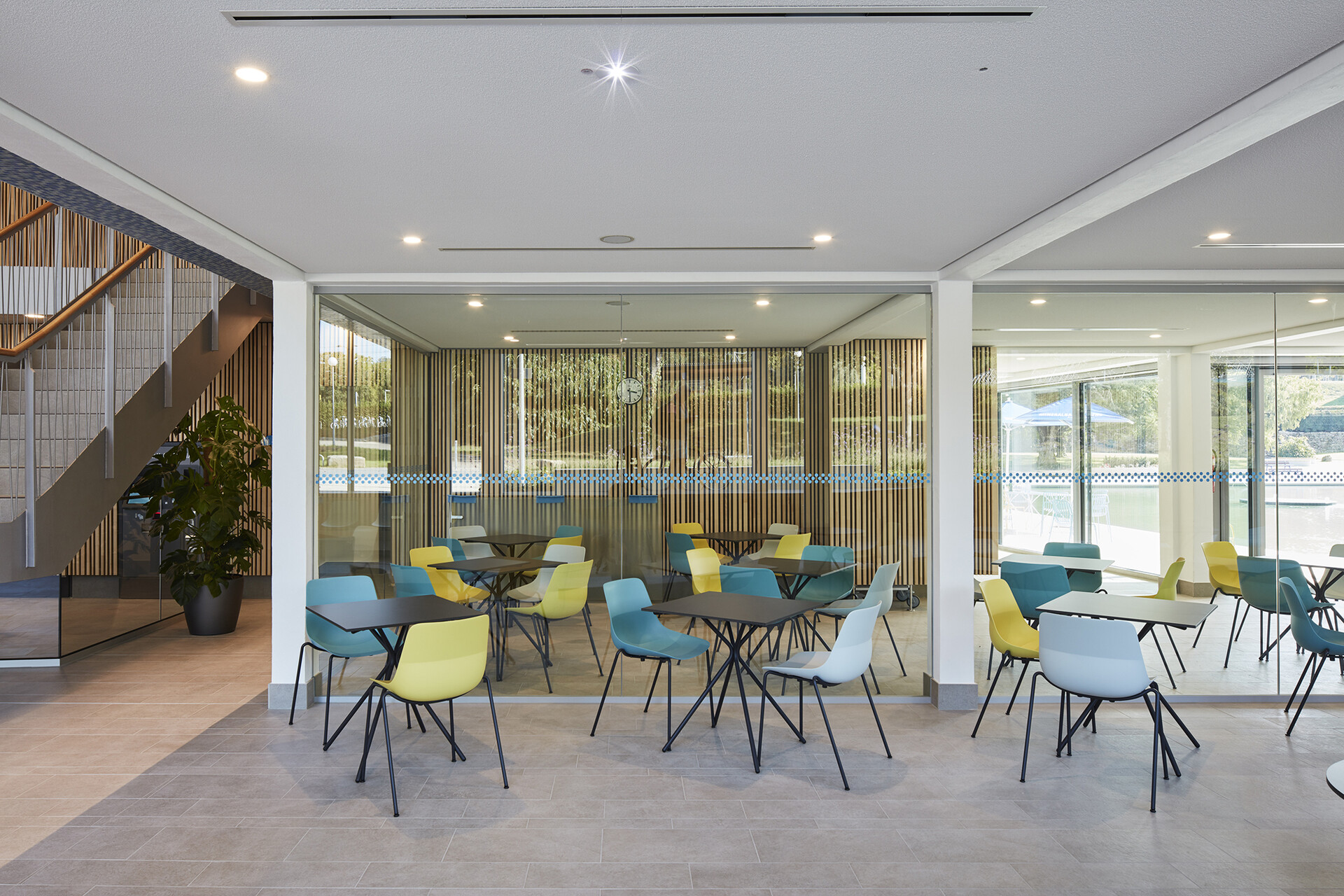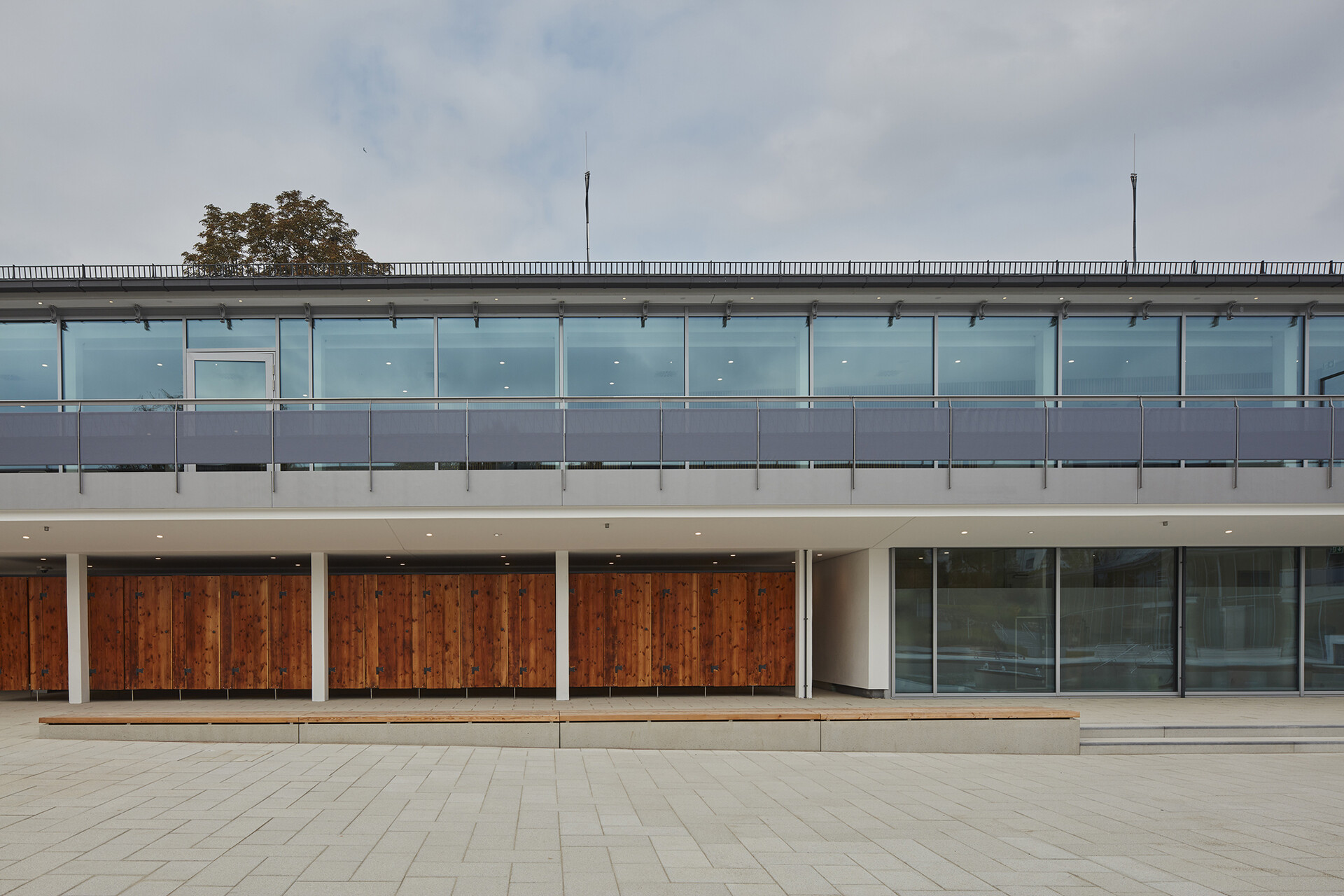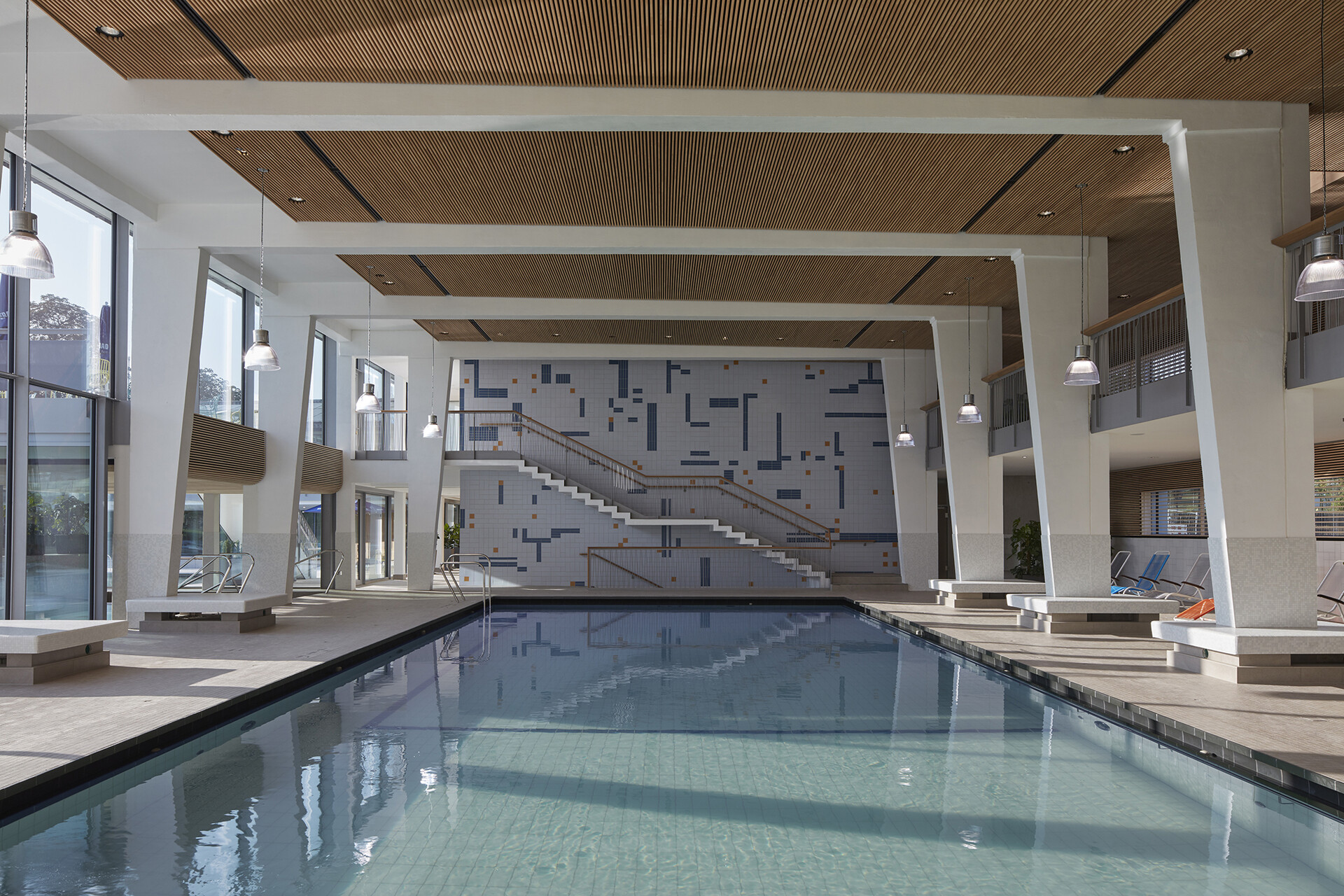 163 Jahre Geschichte verleihen dem Mineralbad Berg Alleinstellungmerkmal - und auch der Kult der Stuttgarter um das Bad ist groß. Im Fokus der Sanierung des ältesten Stuttgarter Mineralbades stand, den besonderen Charakter des Bades zu wahren und die Neugestaltung in Anlehnung an die 50er Jahre zeitgemäß zu interpretieren. Die Herausforderung bei der gestalterischen und technischen Sanierung lag darin, die richtige Balance zwischen Erhalt, Erneuerung und Ergänzung zu finden. So blieb der L-förmige Baukörper mit Nord- und Ostflügel, in den das quadratische Außenbecken mit Seecharakter eingebettet liegt, in seiner ursprünglichen Form erhalten und wurde bis auf den Rohbau zurückgeführt. Lediglich das alte Bewegungsbad im Osten der Anlage wurde abgerissen und durch einen Anbau an die Badehalle, der die charakteristische Gebäudestruktur aufgreift, ersetzt. Das Foyer am Knotenpunkt der Gebäudeachsen ist nach wie vor die zentrale Schnittstelle im Bad. Offen und transparent gestaltet, gibt die Eingangshalle den Blick zum Außenbecken und in den Garten frei, sodass eine weitläufige und luftige Atmosphäre im Innenraum entsteht. Die Badehalle wurde im Erdgeschoss und auch im Obergeschoss durch eine Galerie mit Liegeflächen erweitert. Gestaltgebendes Element in der Badehalle ist eine neue Holzlamellendecke, die sich in sanftem Schwung von der Wandfläche über die Decke bis hin zur Glasfassade schwingt. Sie verleiht dem gesamten Innenraum eine warme Atmosphäre und sorgt für eine gute Akustik. Dem Innenraum verleihen ausgewählte Materialien und ein stimmiges Farbkonzept eine angenehme Atmosphäre und sorgen für eine hohe Aufenthaltsqualität im Bad.
