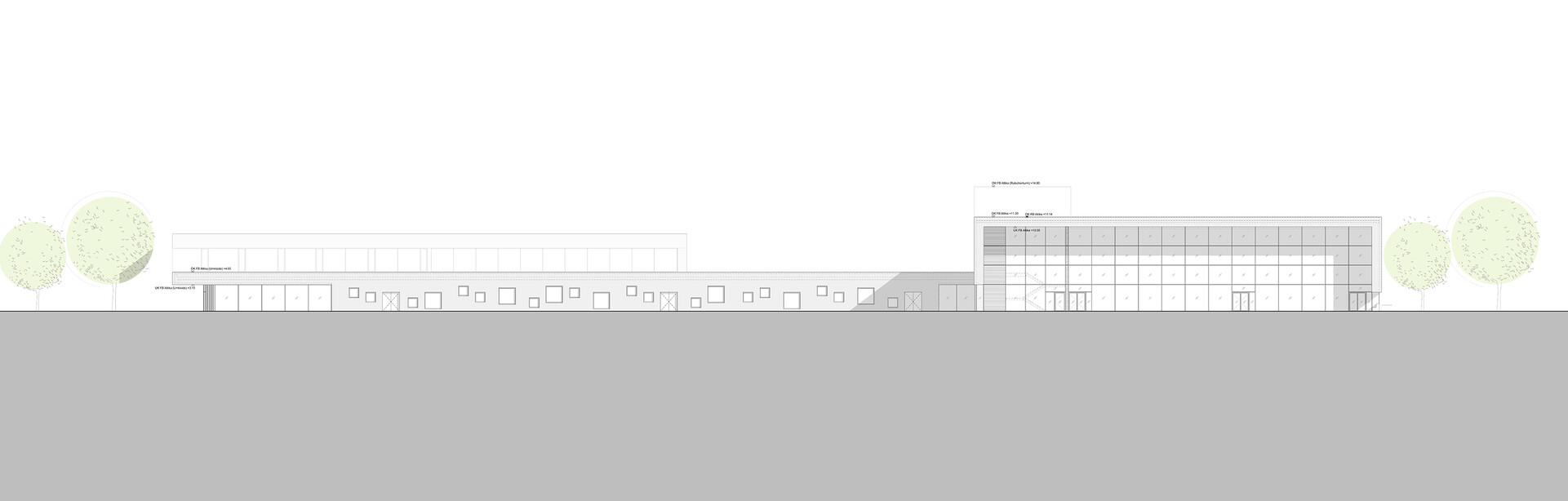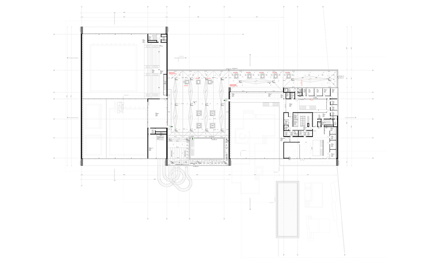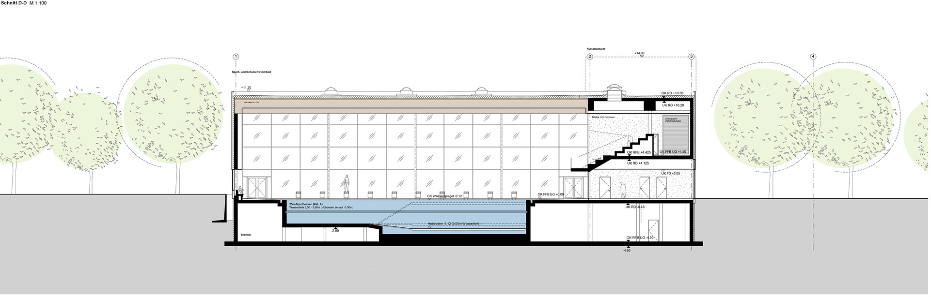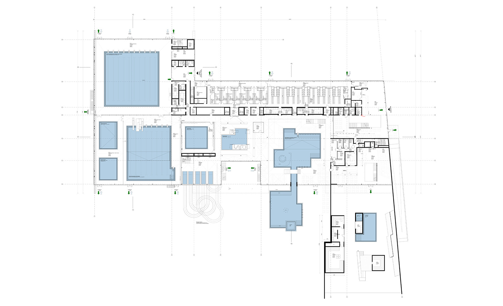 Für das vielfältige Freizeitangebot, das von Schul- und Vereinsschwimmen über Familien- und Freizeitschwimmen bis hin zu einer Sauna- und Wellnesslandschaft reicht, ist das Schwimmbad in Bonn ablesbar in unterschiedliche Baukörper gegliedert. Der Hauptzugang mit auskragendem Dach liegt im Südosten und vermittelt zwischen Stadtraum und öffentlicher Erschließung. Im Osten bildet ein eingeschossiger Umkleideriegel eine klare Kante zur Bahntrasse, nach Süden und Westen verzahnt sich der Neubau mit seinen lichtdurchfluteten Badehallen mit dem attraktiven Landschaftsraum.