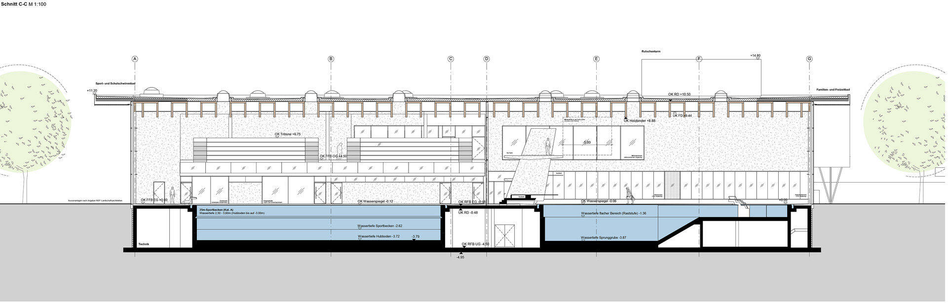 Dem Familien- und Freizeitbad sind ein kombiniertes Innen- und Außenbecken, ein Fitnessbecken, ein Kinderplanschbereich, ein 25-m-Multifunktionsbecken sowie die Rutschenanlage zugeordnet. An die Freizeitschwimmhalle grenzt zudem der Sauna- und Wellnessbereich sowie die Verwaltung an. Das Sport- und Schulschwimmbad ist mit einem 25-m-Wettkampfbecken, einem Lehrschwimmbecken sowie einem Multifunktionsbecken ausgestattet. An der Längsseite des Wettkampfbeckens befindet sich im ersten Obergeschoss eine Tribüne mit 350 Sitzplätzen. Im Beckenumgang sind für die Wettkampfteilnehmer weitere 400 Sitzplätze vorgesehen. Die Trennung des Sport- und Schulschwimmbereich vom Familien- und Freizeitbereich erfolgt durch eine zweigeschossige Glasfassade.