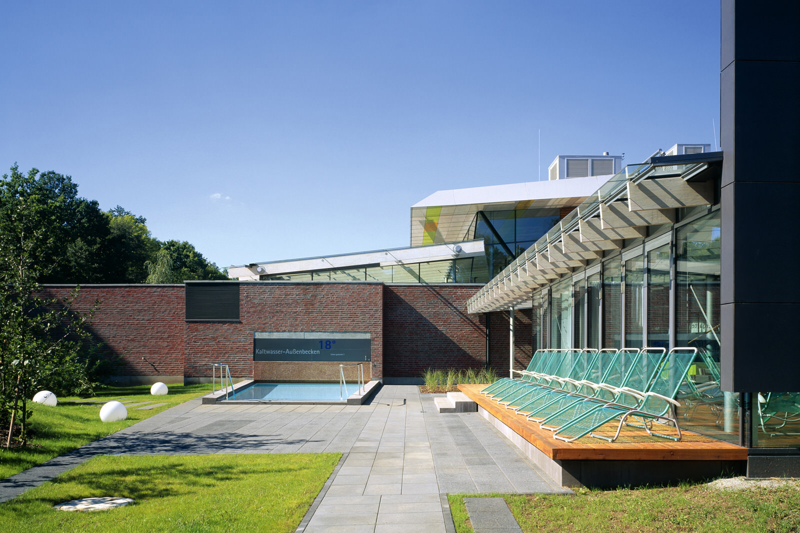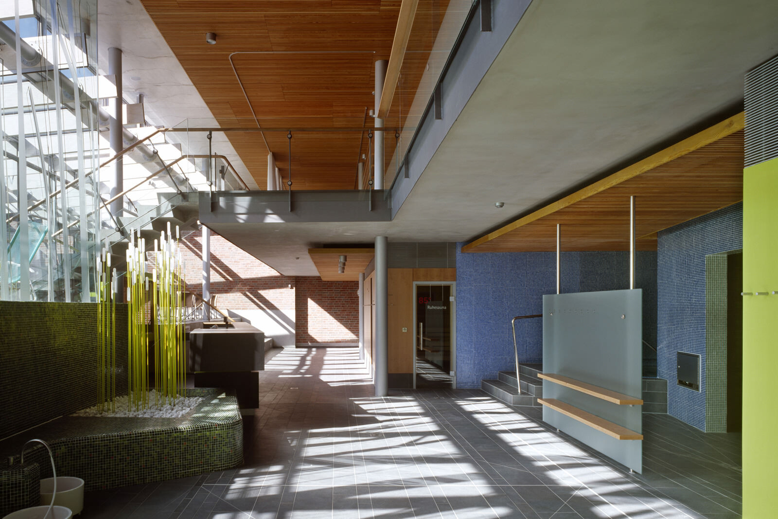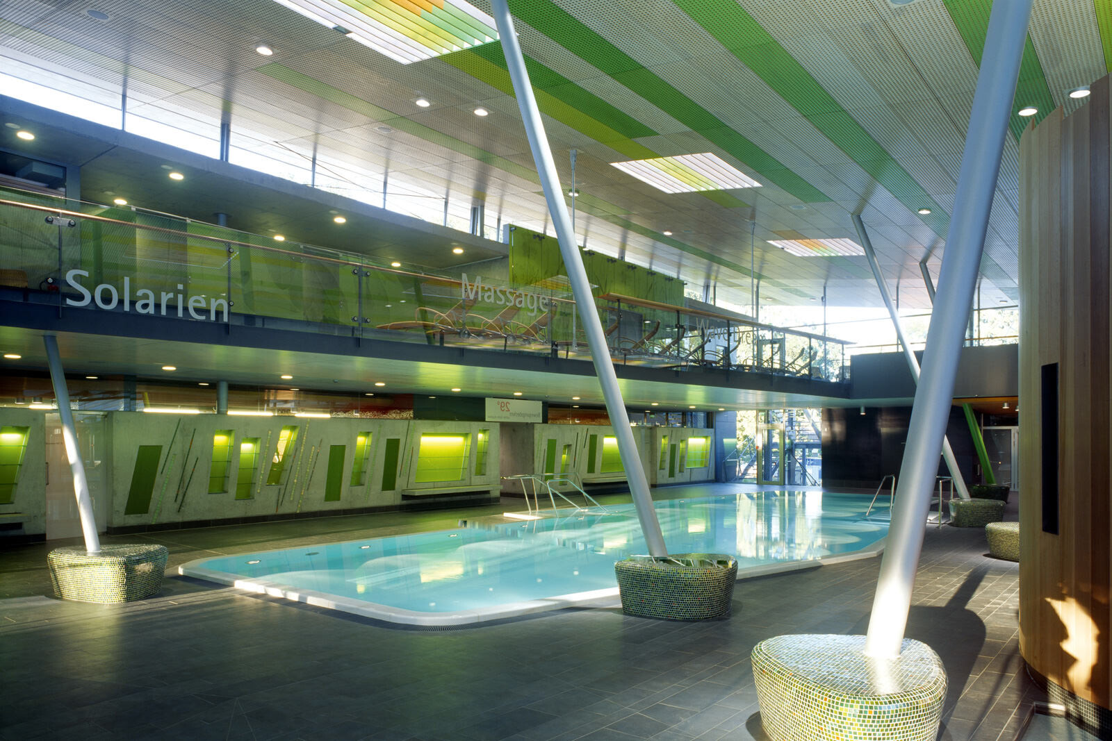 Prägendes Element der Kulturlandschaft Spreewald ist ein weit verzweigtes Netz aus Kanälen, so genannte Fließe, die zu beiden Seiten dicht mit hohen Bäumen bewachsen sind. Auch das Grundstück für die Spreewald Therme außerhalb von Burg wird durch „grüne Wände“ räumlich begrenzt. Die Bade-, Sauna- und Wellnesslandschaft greift die prägenden Elemente der Kulturlandschaft auf. Mit seinem spezifischen Erscheinungsbild bezieht sich das Gebäude ausschließlich auf den Ort Burg im Spreewald und erhält dadurch unverwechselbaren Charakter. Klare Formen und ausgewählte Materialien bestimmen die Komposition des Raumgefüges. Material- und Farbwechsel setzen besondere Akzente im Innenraum und verleihen der Therme eine warme Atmosphäre, die durch den Einsatz von Holz bei Konstruktionen und Verkleidung noch verstärkt wird. Der Bezug zum Ort wird zudem durch eine sensible Materialauswahl hergestellt. Beispielsweise unterstreicht die Verwendung von ortstypischen Materialien wie Reet, Holz und Ziegelsteinen die architektonische Verbindung der Therme mit der Region Spreewald.