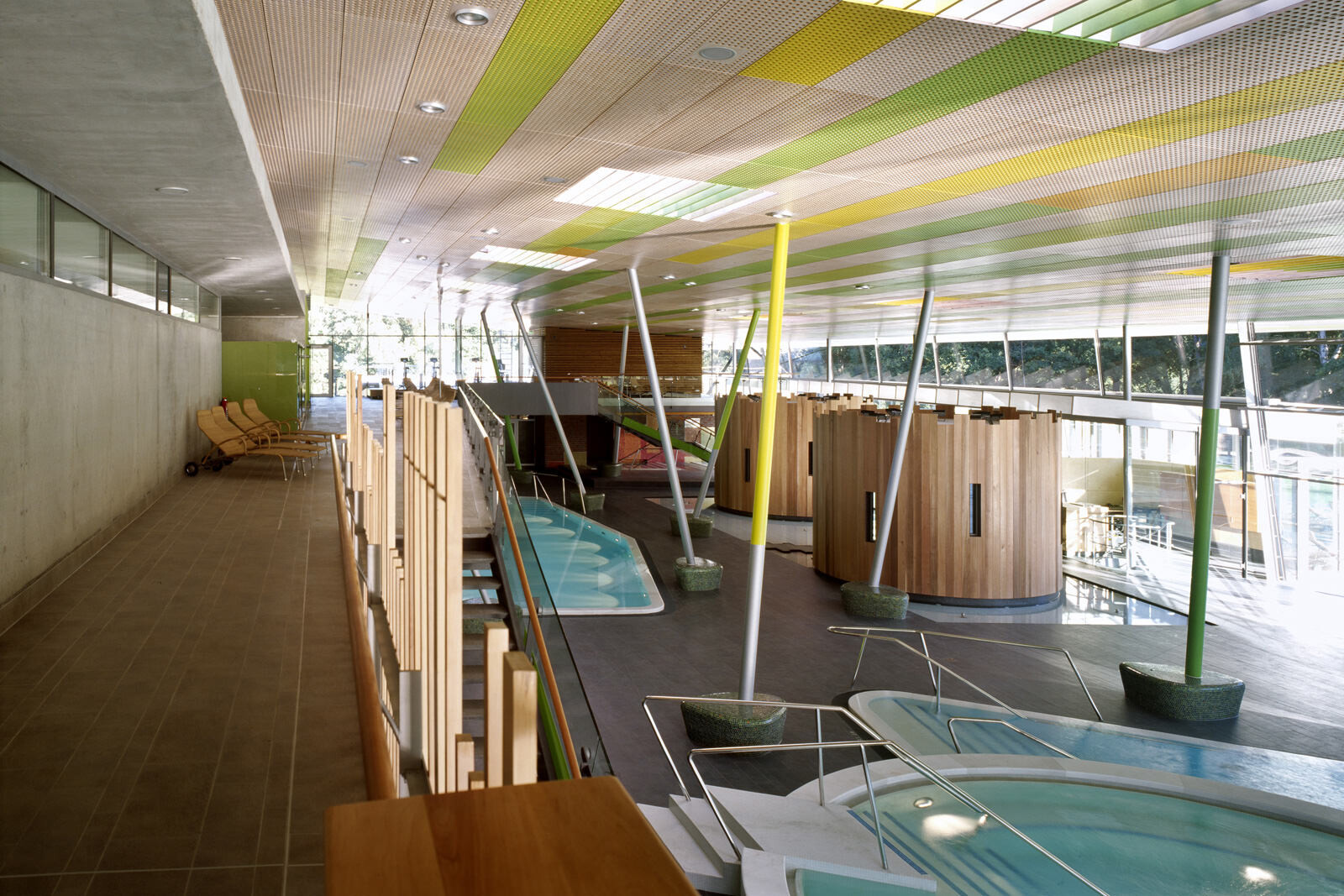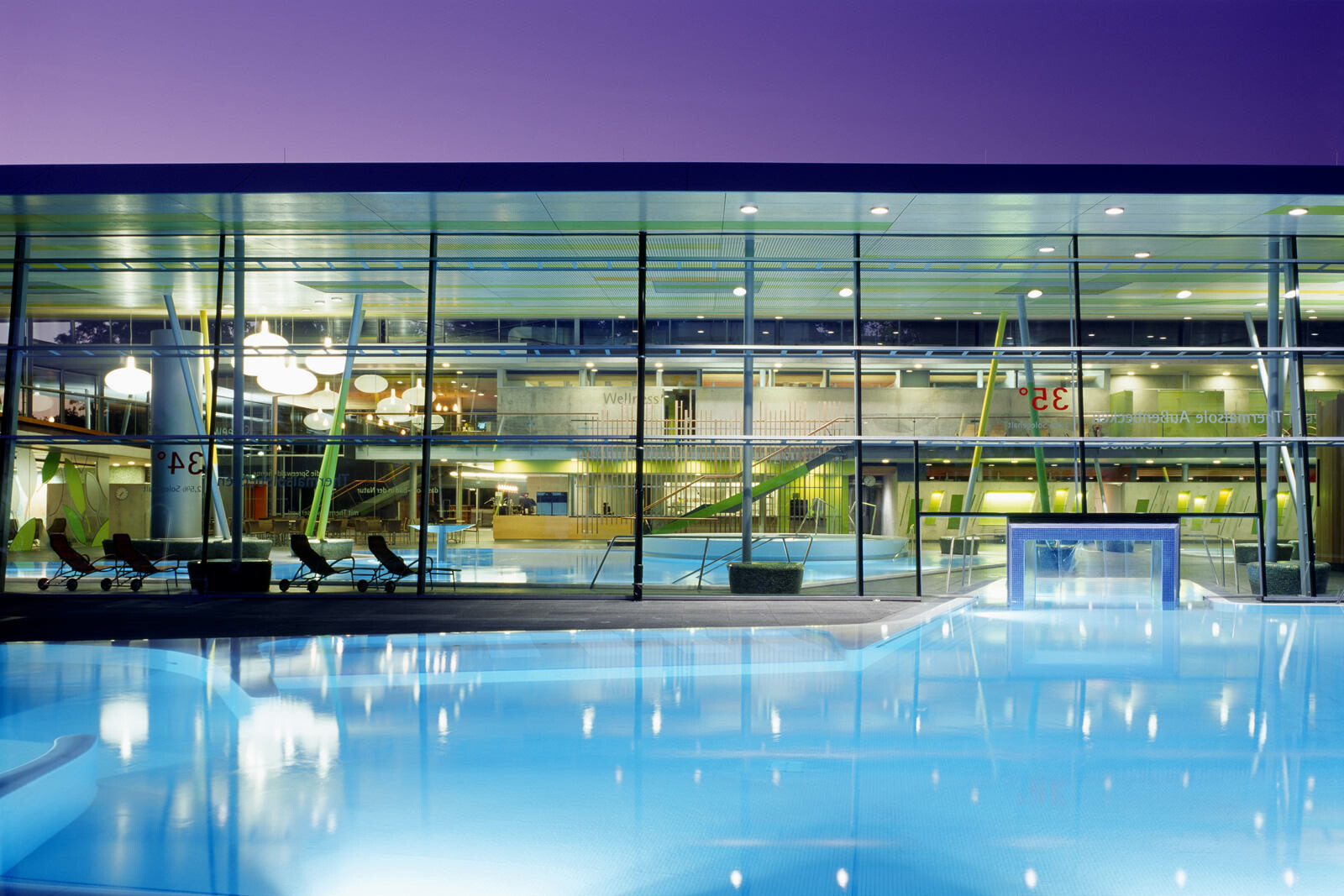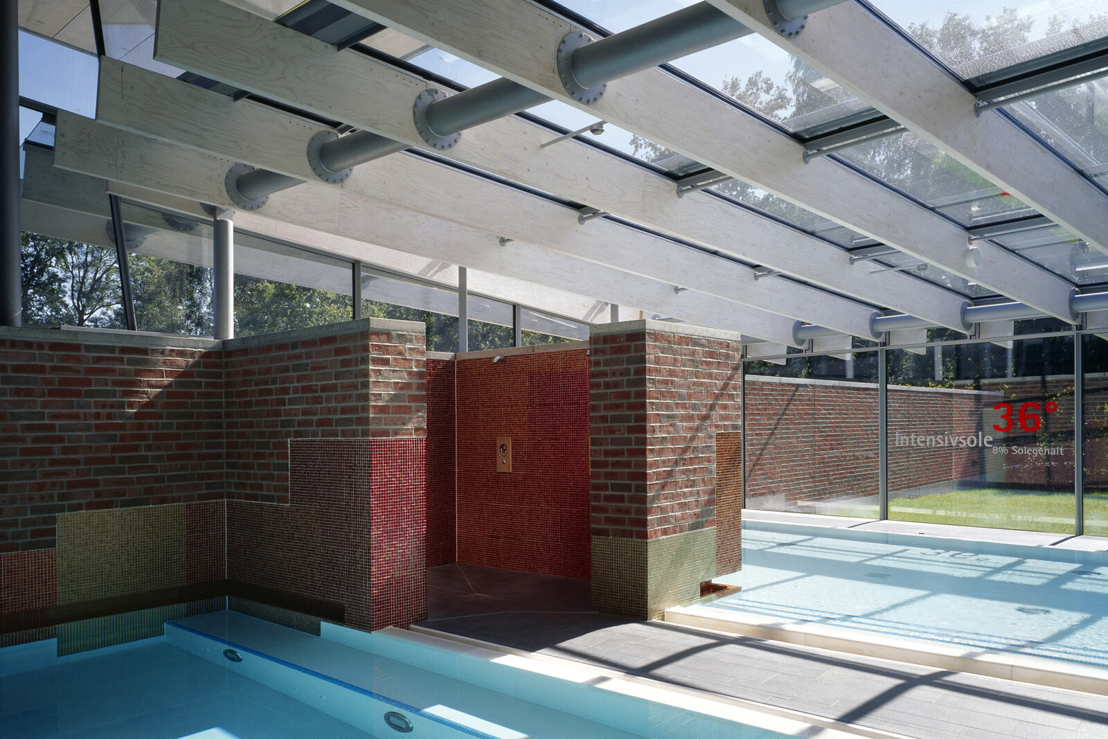 Prägendes Element der Kulturlandschaft Spreewald ist ein weit verzweigtes Netz aus Kanälen, so genannte Fließe, die zu beiden Seiten dicht mit hohen Bäumen bewachsen sind. Auch das Grundstück für die Spreewald Therme außerhalb von Burg wird durch „grüne Wände“ räumlich begrenzt. Die Bade-, Sauna- und Wellnesslandschaft greift die prägenden Elemente der Kulturlandschaft auf. Mit seinem spezifischen Erscheinungsbild bezieht sich das Gebäude ausschließlich auf den Ort Burg im Spreewald und erhält dadurch unverwechselbaren Charakter. Klare Formen und ausgewählte Materialien bestimmen die Komposition des Raumgefüges. Material- und Farbwechsel setzen besondere Akzente im Innenraum und verleihen der Therme eine warme Atmosphäre, die durch den Einsatz von Holz bei Konstruktionen und Verkleidung noch verstärkt wird. Der Bezug zum Ort wird zudem durch eine sensible Materialauswahl hergestellt. Beispielsweise unterstreicht die Verwendung von ortstypischen Materialien wie Reet, Holz und Ziegelsteinen die architektonische Verbindung der Therme mit der Region Spreewald.