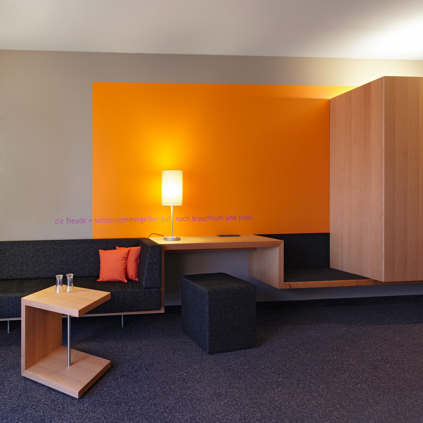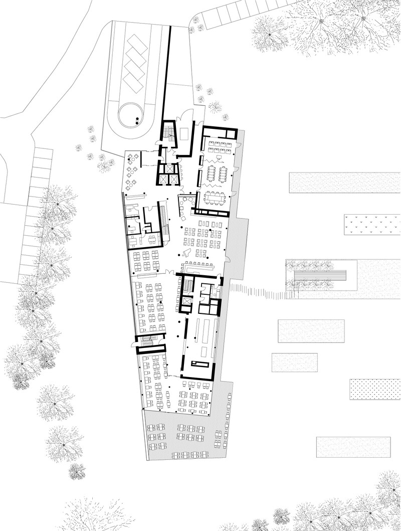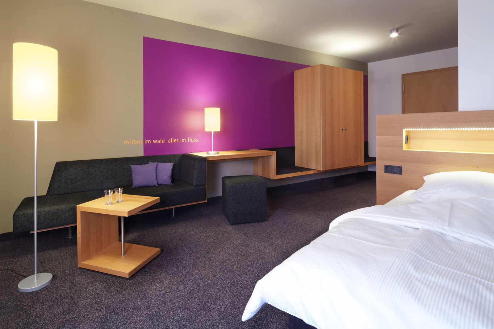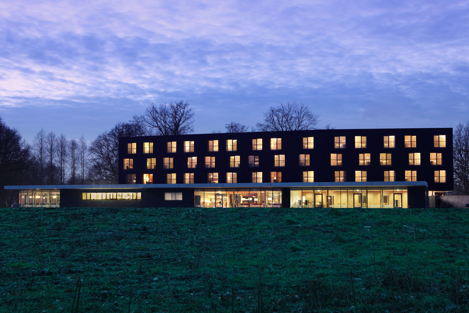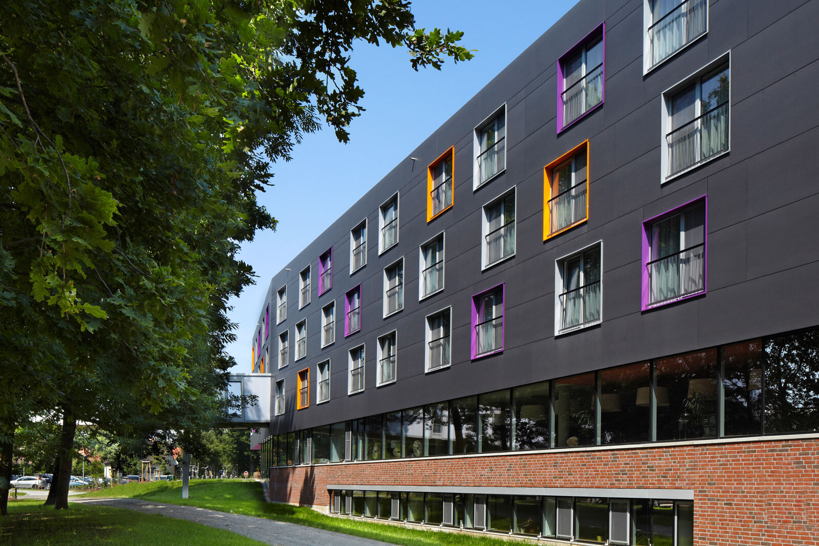 Natur, Wellness und Design: In unmittelbarer Nachbarschaft zur Spreewald Therme, die bereits 2005 von 4a Architekten geplant und errichtet wurde, bietet das 4-Sterne-Hotel seinen Gästen ein Ambiente zum Wohlfühlen und Entspannen. Die Besonderheit und Herausforderung lag darin, das Hotel in den Kontext der Therme zu stellen und zugleich dem neuen Gebäude individuellen und eigenständigen Charakter zu verleihen. Für die gestalterische Einheit von Hotel und Therme sorgen optimal aufeinander abgestimmte Materialien – wie auch das Sole-Thermalbad greift das Hoteldesign die wesentlichen Gestaltungselemente der Spreewald-Region auf. Ein Bademantelgang verbindet Hotel und Therme baulich miteinander. Eine weit auslaufende, mit Ziegeln verkleidete Wandscheibe definiert die Eingangssituation und schafft in ihrer Materialität eine Verbindung zur Spreewald Therme. Die drei oberen Geschosse bilden durch die anthrazitfarbene Fassadenverkleidung sowie die einheitlichen, großformatigen Öffnungen eine Einheit – hier sind die insgesamt 83 Zimmer mit 166 Betten untergebracht. Einen leicht schwebenden Charakter erhält der dreigeschossige Baukörper durch die transparente Gestaltung des Erdgeschosses mit größtenteils fassadenhohen Verglasungen.