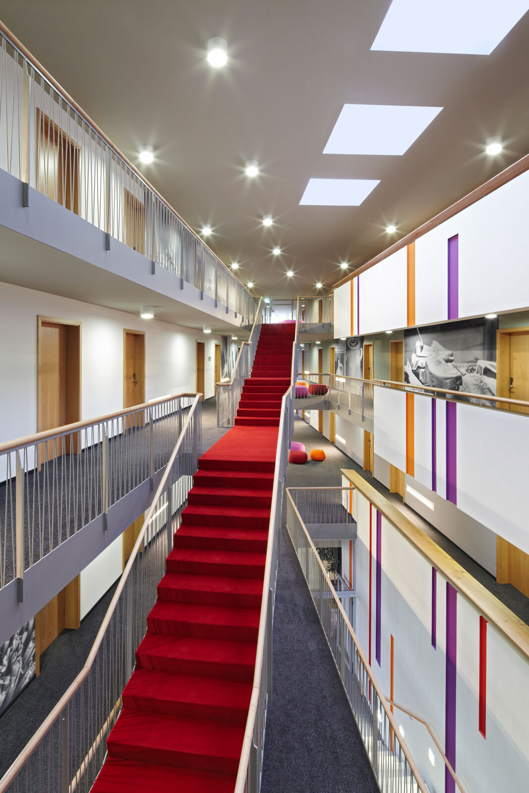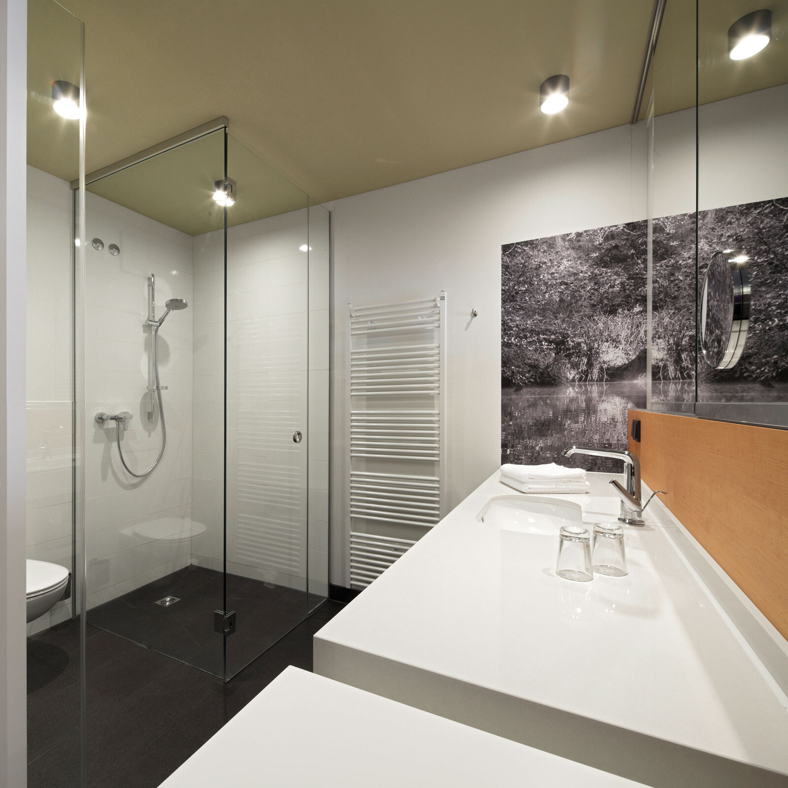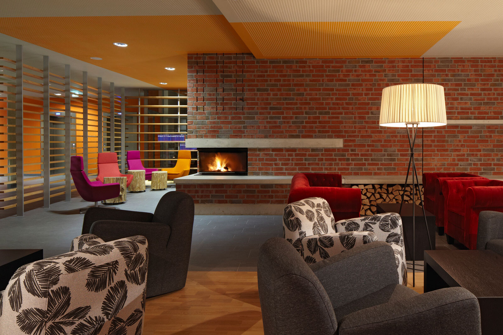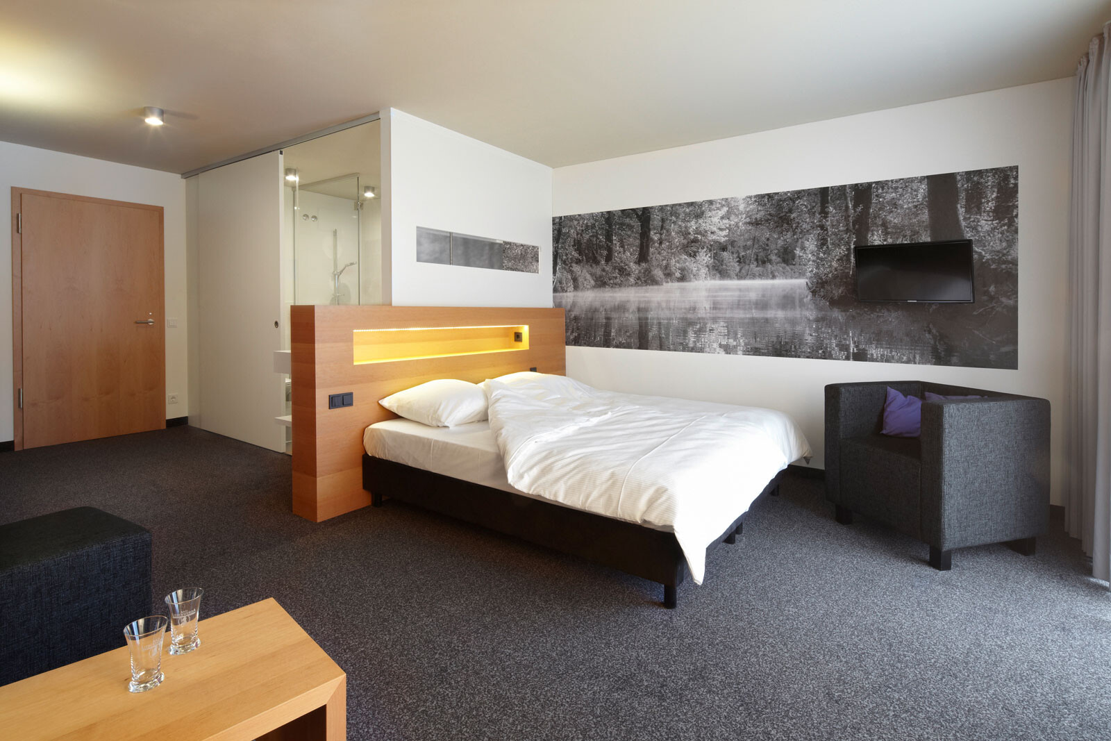Natur, Wellness und Design: In unmittelbarer Nachbarschaft zur Spreewald Therme, die bereits 2005 von 4a Architekten geplant und errichtet wurde, bietet das 4-Sterne-Hotel seinen Gästen ein Ambiente zum Wohlfühlen und Entspannen. Die Besonderheit und Herausforderung lag darin, das Hotel in den Kontext der Therme zu stellen und zugleich dem neuen Gebäude individuellen und eigenständigen Charakter zu verleihen. Für die gestalterische Einheit von Hotel und Therme sorgen optimal aufeinander abgestimmte Materialien – wie auch das Sole-Thermalbad greift das Hoteldesign die wesentlichen Gestaltungselemente der Spreewald-Region auf. Ein Bademantelgang verbindet Hotel und Therme baulich miteinander. Eine weit auslaufende, mit Ziegeln verkleidete Wandscheibe definiert die Eingangssituation und schafft in ihrer Materialität eine Verbindung zur Spreewald Therme. Die drei oberen Geschosse bilden durch die anthrazitfarbene Fassadenverkleidung sowie die einheitlichen, großformatigen Öffnungen eine Einheit – hier sind die insgesamt 83 Zimmer mit 166 Betten untergebracht. Einen leicht schwebenden Charakter erhält der dreigeschossige Baukörper durch die transparente Gestaltung des Erdgeschosses mit größtenteils fassadenhohen Verglasungen.
