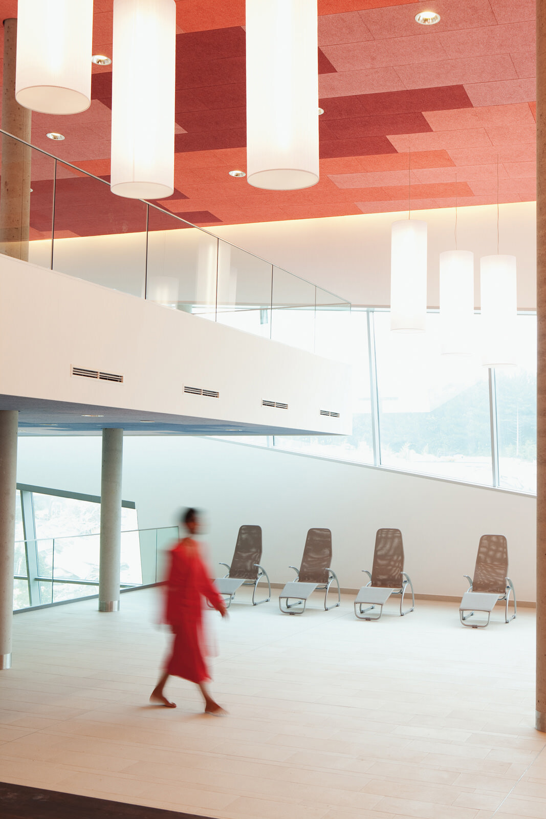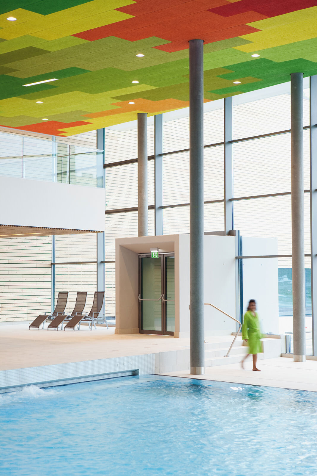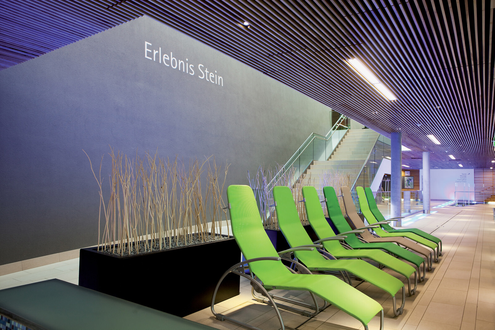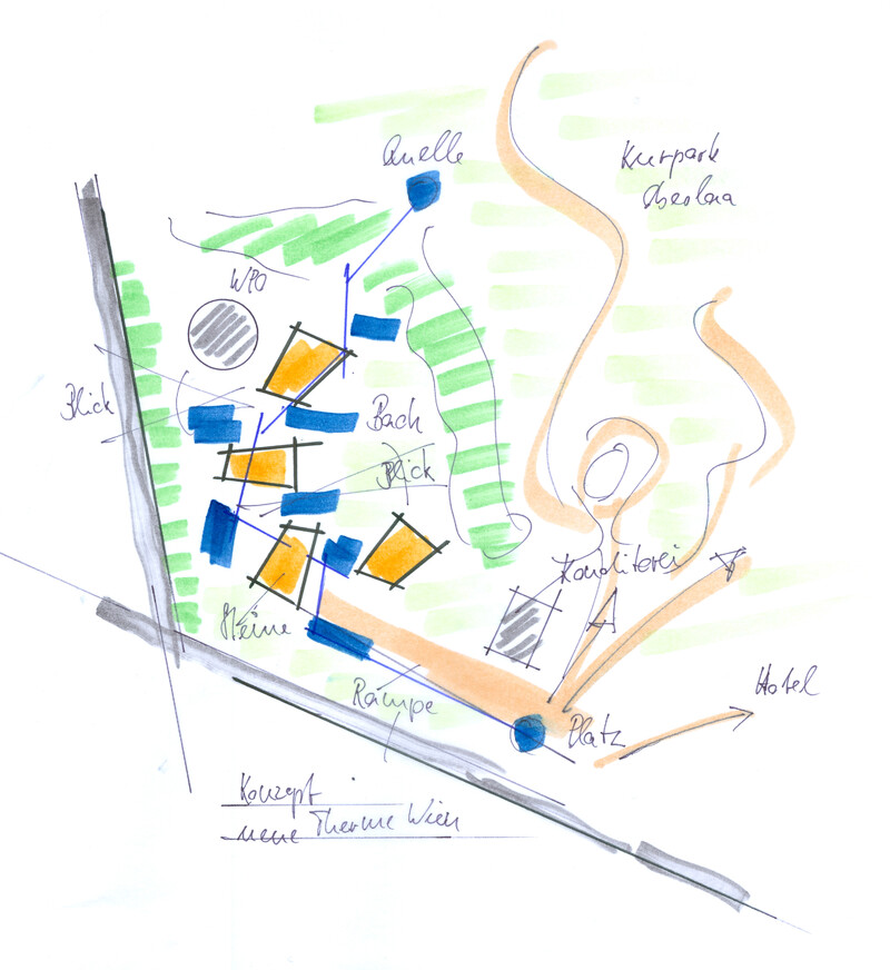Für das Leitbild der Therme stand die Natur Pate: Eingebettet in die Kurlandschaft Wien Oberlaa diente ein Bachlauf als Grundmotiv, welcher sich zwischen Steinen hindurchwindet, sie umspült und mal enger, mal breiter wird. Ausgangspunkt ist eine der beiden Thermalquellen. Das Gebäude folgt ihrem Verlauf ähnlich einem gewundenen Fluss der Topografie abwärts Richtung Süden und umspült dabei einzelne Themensteine, die wie große Bachkiesel aus der Dachlandschaft herausragen. Das maximal dreigeschossige Thermenensemble passt sich dezent an die Umgebung an, seine Ruhewiesen bilden einen sanften Übergang zwischen der Beckenvielfalt im Außenbereich und dem umgebenden Park. Der Bezug zum Wasser und zur Landschaft ist für den Besucher stets spürbar. Das Thema Natur wurde bei der Gestaltung der Therme jedoch nicht nur räumlich, sondern auch im Hinblick auf die Wahl der Materialien und Farben aufgegriffen. Für unterschiedliche Deckenbereiche dienten die vier Jahreszeiten als Leitbild. Dafür wurden atmosphärische Fotos von Frühling, Sommer, Herbst und Winter grafisch vereinfacht, in ein abstraktes Farbmuster überführt und anschließend auf die Akustikplatten übertragen. Die damit erzeugte Farb- und Lichtstimmung lässt immer wieder neue und spannende Raumeindrücke entstehen.