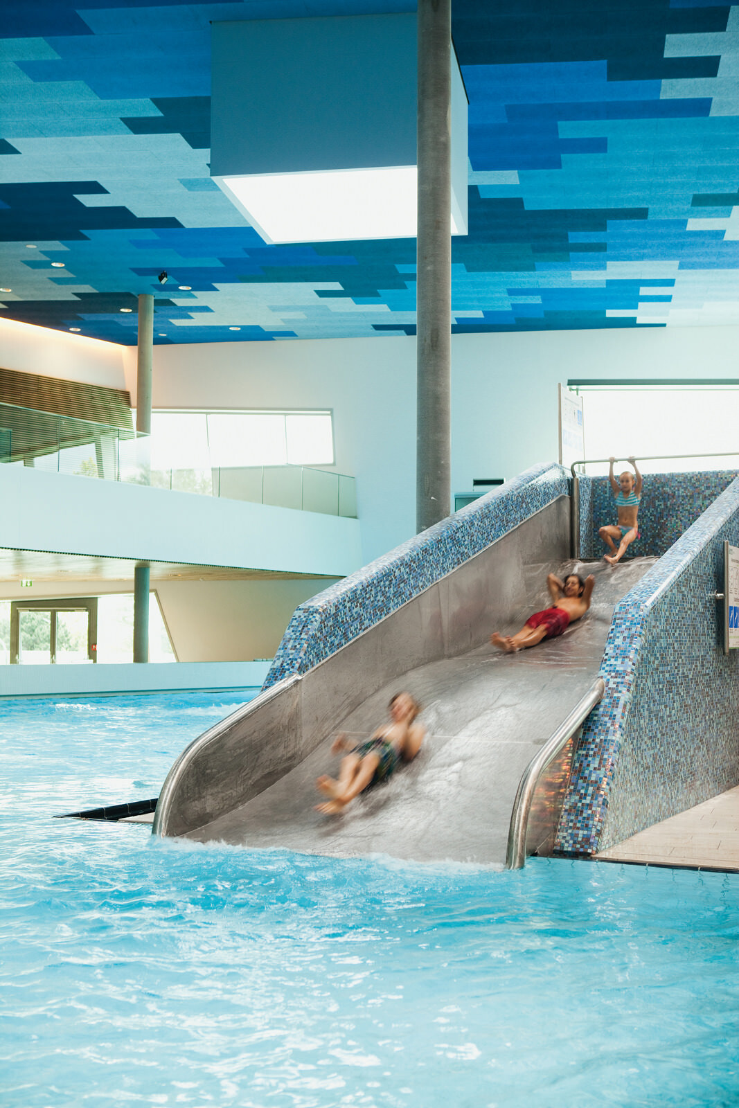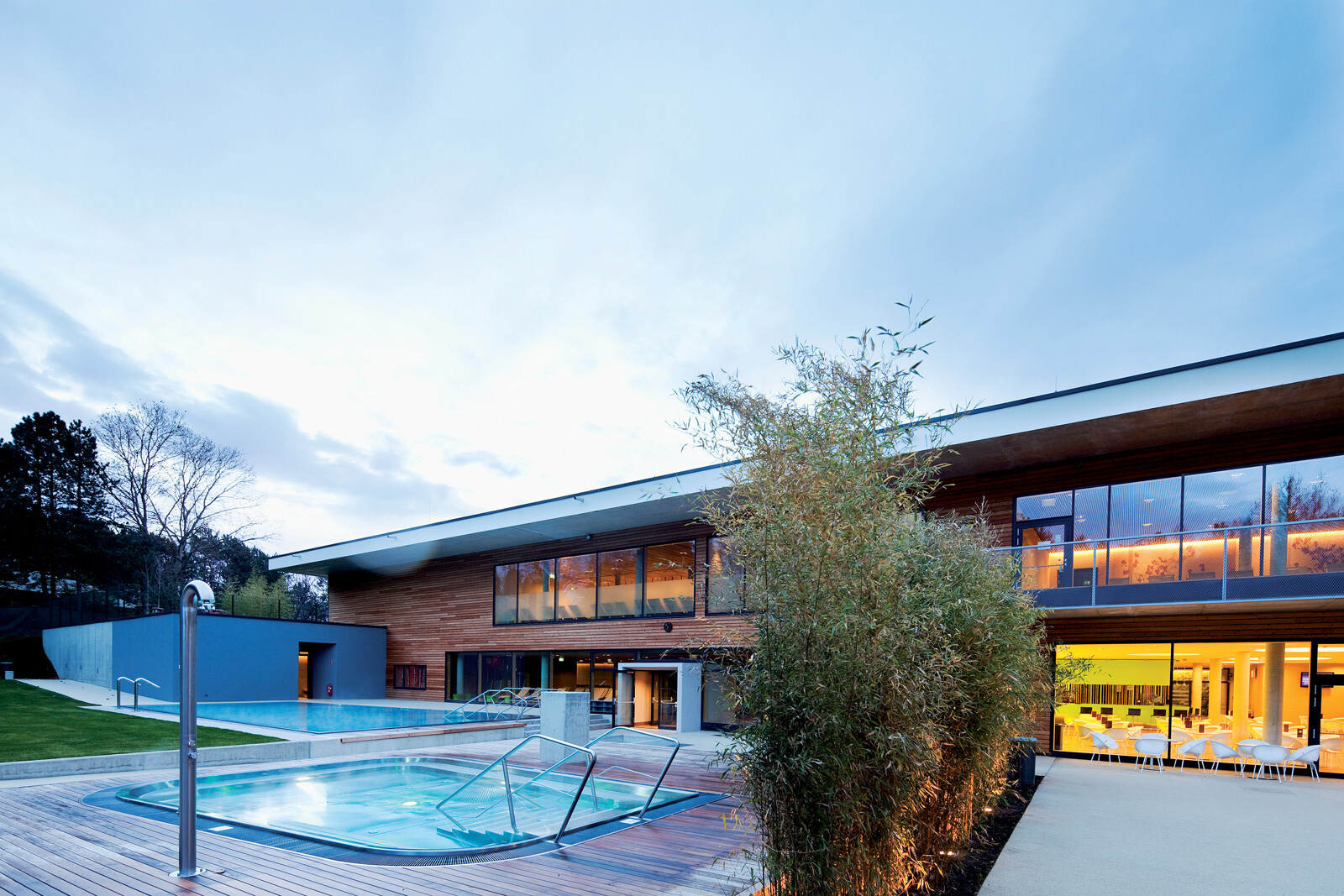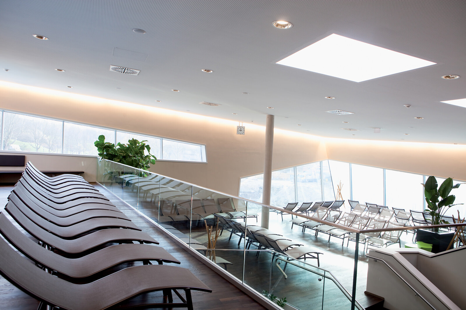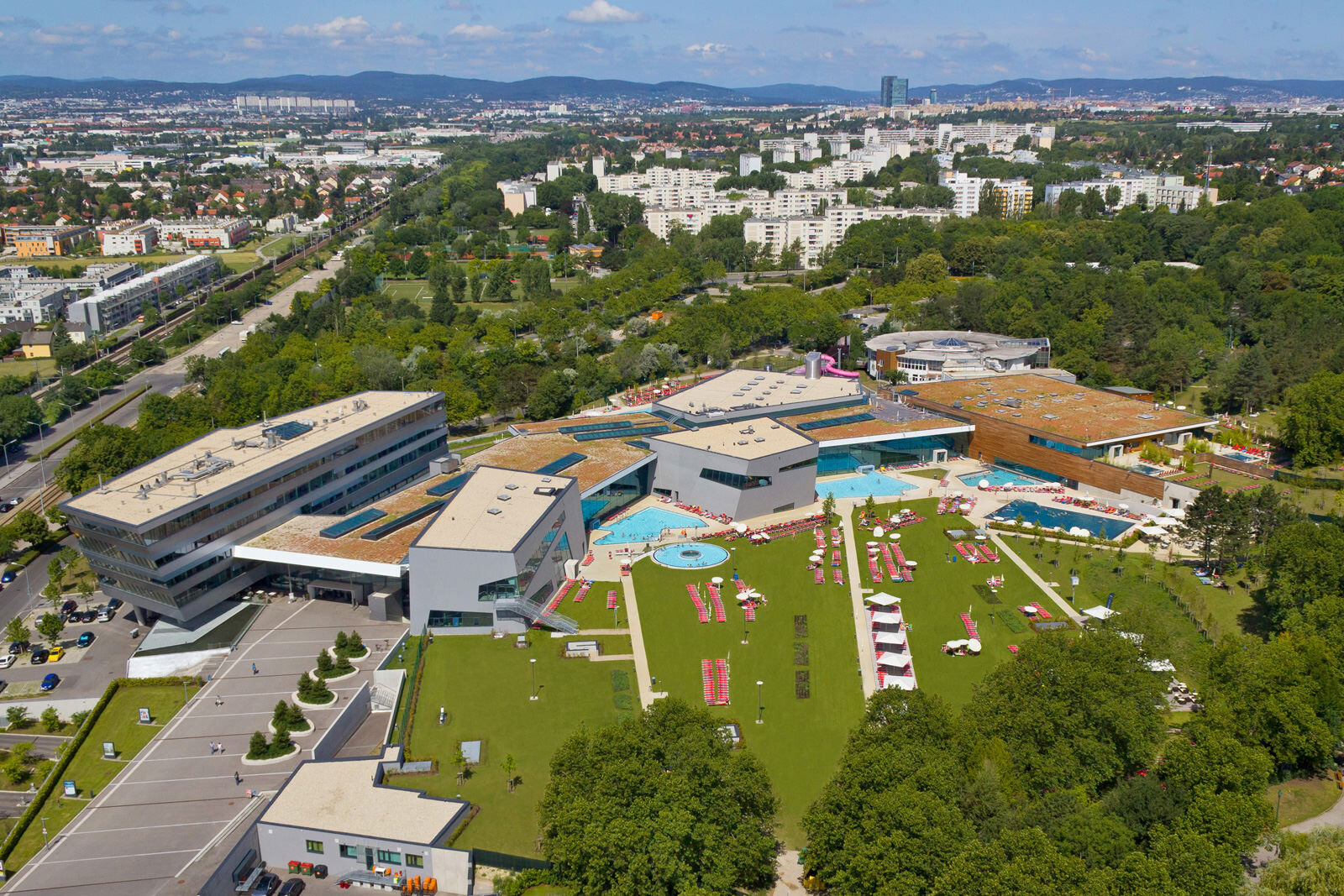 Für das Leitbild der Therme stand die Natur Pate: Eingebettet in die Kurlandschaft Wien Oberlaa diente ein Bachlauf als Grundmotiv, welcher sich zwischen Steinen hindurchwindet, sie umspült und mal enger, mal breiter wird. Ausgangspunkt ist eine der beiden Thermalquellen. Das Gebäude folgt ihrem Verlauf ähnlich einem gewundenen Fluss der Topografie abwärts Richtung Süden und umspült dabei einzelne Themensteine, die wie große Bachkiesel aus der Dachlandschaft herausragen. Das maximal dreigeschossige Thermenensemble passt sich dezent an die Umgebung an, seine Ruhewiesen bilden einen sanften Übergang zwischen der Beckenvielfalt im Außenbereich und dem umgebenden Park. Der Bezug zum Wasser und zur Landschaft ist für den Besucher stets spürbar. Das Thema Natur wurde bei der Gestaltung der Therme jedoch nicht nur räumlich, sondern auch im Hinblick auf die Wahl der Materialien und Farben aufgegriffen. Für unterschiedliche Deckenbereiche dienten die vier Jahreszeiten als Leitbild. Dafür wurden atmosphärische Fotos von Frühling, Sommer, Herbst und Winter grafisch vereinfacht, in ein abstraktes Farbmuster überführt und anschließend auf die Akustikplatten übertragen. Die damit erzeugte Farb- und Lichtstimmung lässt immer wieder neue und spannende Raumeindrücke entstehen.