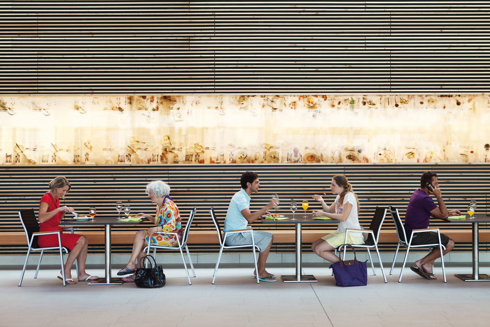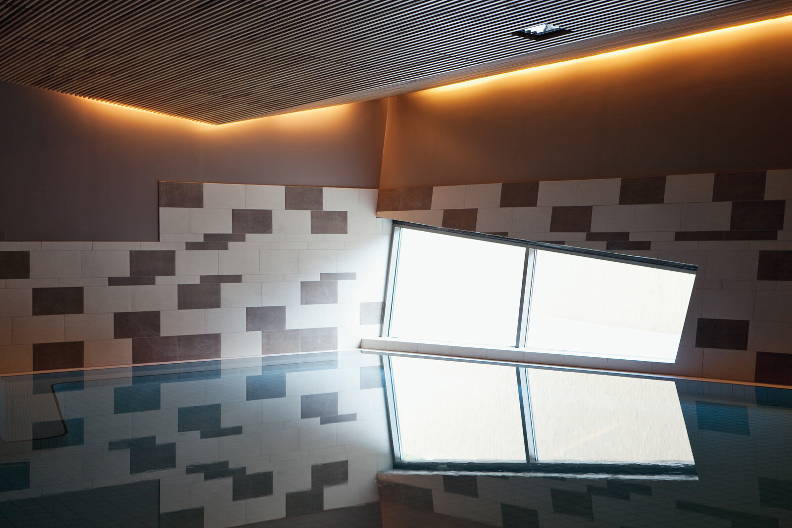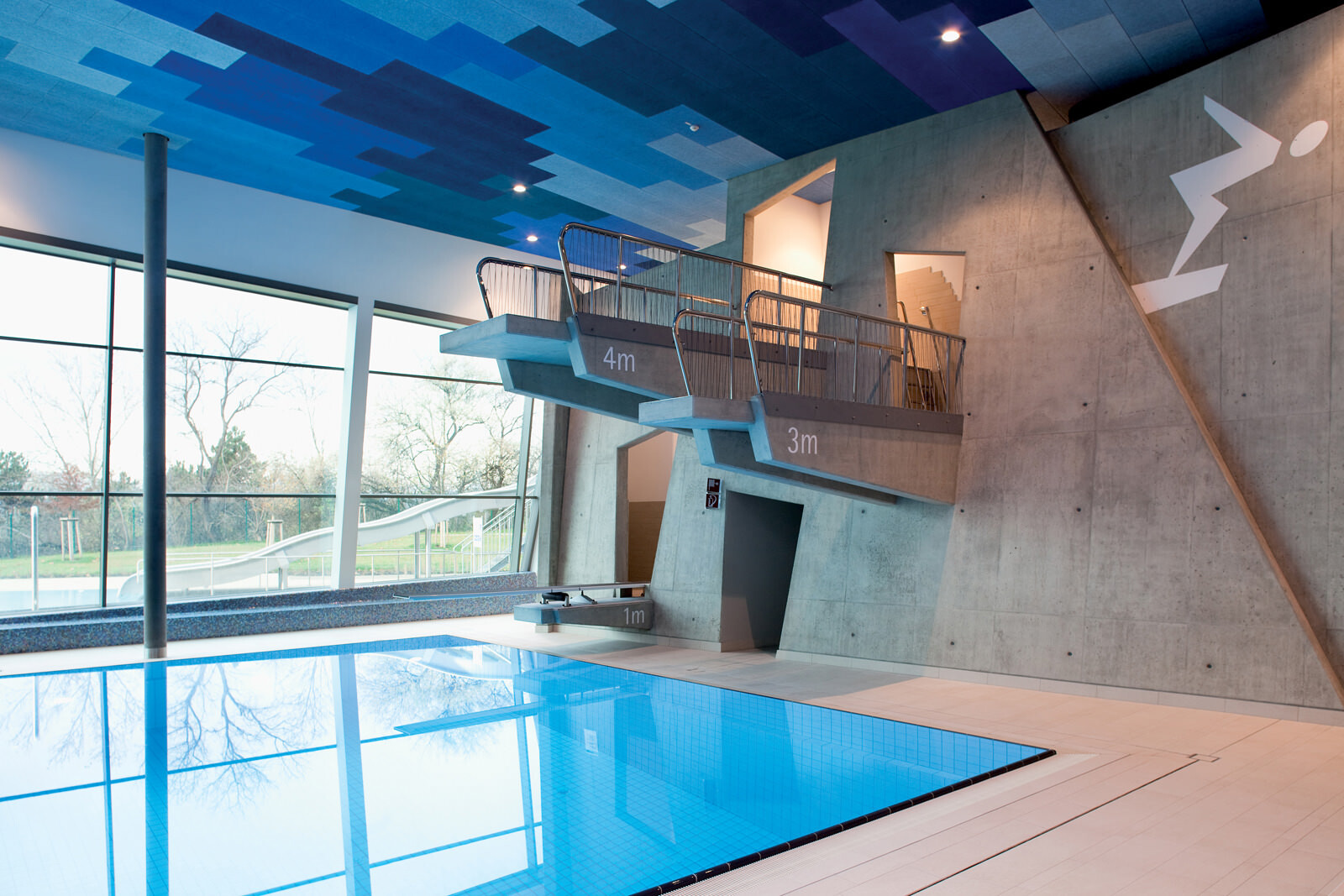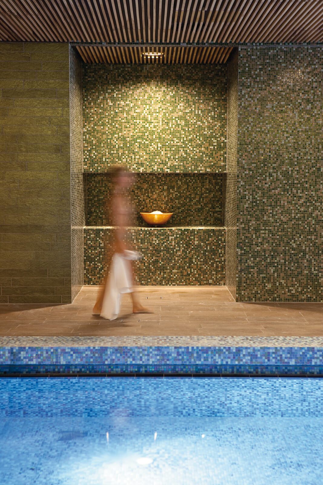 Für das Leitbild der Therme stand die Natur Pate: Eingebettet in die Kurlandschaft Wien Oberlaa diente ein Bachlauf als Grundmotiv, welcher sich zwischen Steinen hindurchwindet, sie umspült und mal enger, mal breiter wird. Ausgangspunkt ist eine der beiden Thermalquellen. Das Gebäude folgt ihrem Verlauf ähnlich einem gewundenen Fluss der Topografie abwärts Richtung Süden und umspült dabei einzelne Themensteine, die wie große Bachkiesel aus der Dachlandschaft herausragen. Das maximal dreigeschossige Thermenensemble passt sich dezent an die Umgebung an, seine Ruhewiesen bilden einen sanften Übergang zwischen der Beckenvielfalt im Außenbereich und dem umgebenden Park. Der Bezug zum Wasser und zur Landschaft ist für den Besucher stets spürbar. Das Thema Natur wurde bei der Gestaltung der Therme jedoch nicht nur räumlich, sondern auch im Hinblick auf die Wahl der Materialien und Farben aufgegriffen. Für unterschiedliche Deckenbereiche dienten die vier Jahreszeiten als Leitbild. Dafür wurden atmosphärische Fotos von Frühling, Sommer, Herbst und Winter grafisch vereinfacht, in ein abstraktes Farbmuster überführt und anschließend auf die Akustikplatten übertragen. Die damit erzeugte Farb- und Lichtstimmung lässt immer wieder neue und spannende Raumeindrücke entstehen.