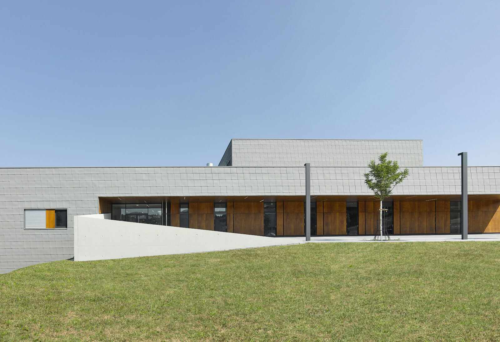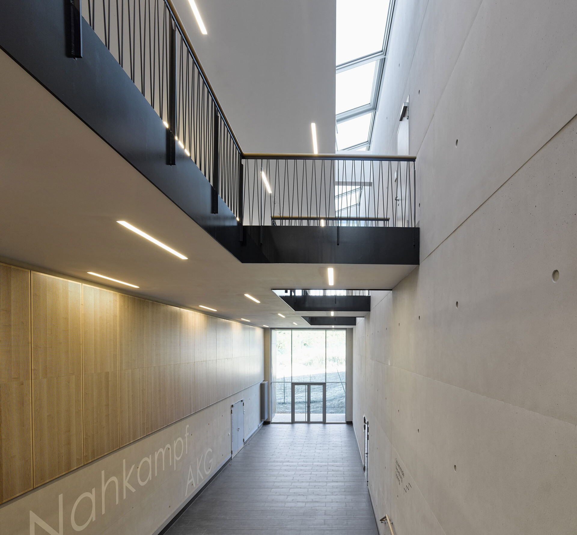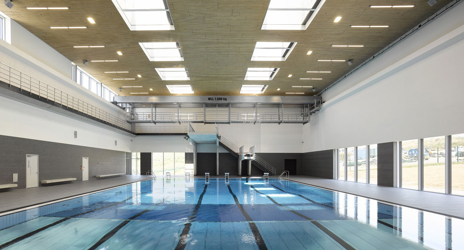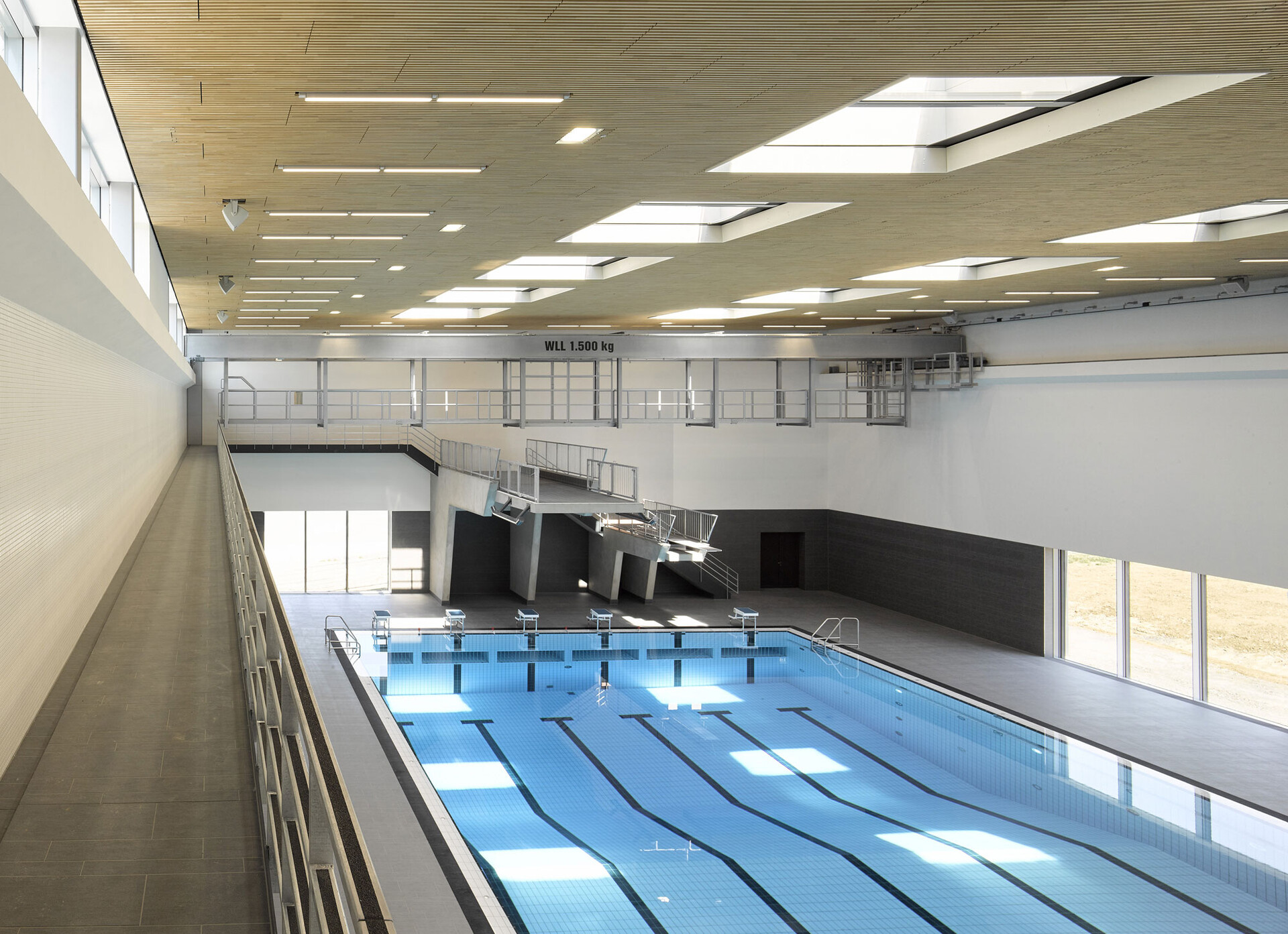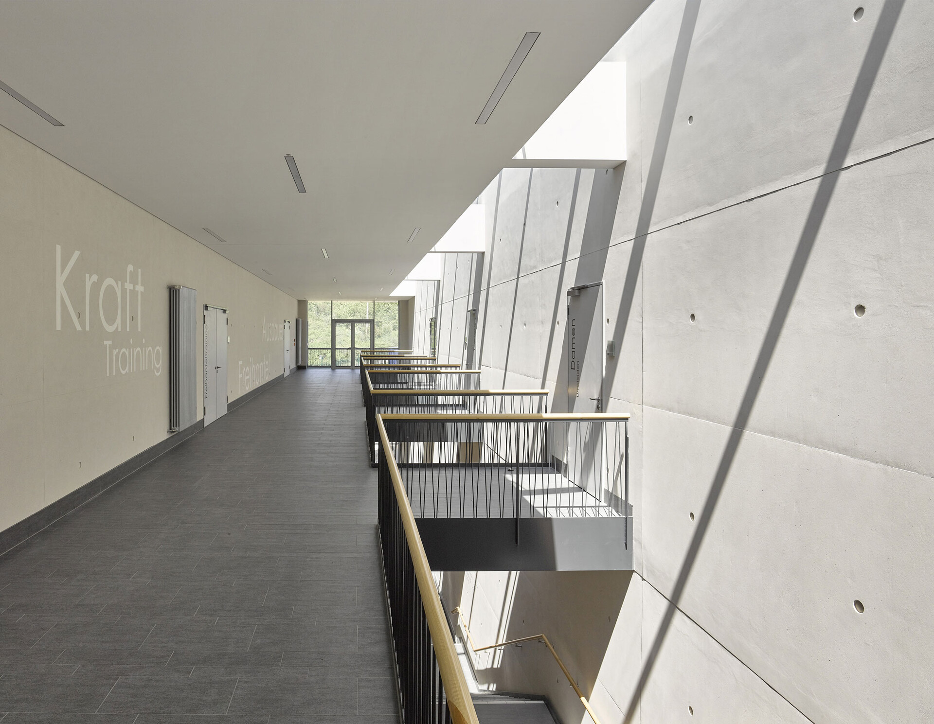 Das Sportzentrum bildet den ersten Bauabschnitt eines Gebäudeensembles für unterschiedliche Trainings- und Ausbildungszwecke im Landkreis Calw. Schlichte Anmutung prägt den Gebäudekomplex in Form und Materialität. Das spiegelt den hohen funktionalen Charakter des Neubaus – Sport, Training und Ausbildung stehen hier im Fokus. Von außen definieren zwei markante Gebäudevolumen das Sportzentrum: Der zur Straßenfront aufragende Kubus umfasst die große Schwimmhalle für das Schwimm- und Tauchtraining. Ein rückwärtig anschließender Baukörper bildet sich durch das abfallende Gelände nach unten ab und umfasst auf zwei Ebenen Trainingshallen für Kraft- und Ausdauertraining. Dazwischen ist ein Verbindungsbau mit Funktions-, Technik- und Nebenräumen integriert, der die unterschiedlichen Bereiche über ein weiträumiges und lichtdurchflutetes Treppenhaus miteinander verbindet. Der leicht zurückversetzte Eingangsbereich zur Straßenseite löst die monolithische Strenge des mit grauen Schindeln verkleideten Baukörpers formal auf. Einen weiteren Akzent setzt hier der Materialwechsel – ein Band aus Holzelementen und verglasten Öffnungen markiert die Eingangssituation. Dieses gestalterische Element wiederholt sich durchgängig bei Gebäudeöffnungen. Sämtliche Bereiche zeichnen sich bei hoher Funktionalität durch eine angenehme Atmosphäre aus: Das mehrgeschossige, offen gestaltete Treppenhaus, die von allen Seiten mit Licht durchflutete Sportbadehalle, der zweigeschossige Saunabereich mit verglastem Ruheraum sowie die Trainingshallen mit ihrer umlaufenden Holzverkleidung wirken einladend und bieten zugleich optimale Trainingsbedingungen. Die Halle im Eingangsgeschoss lässt sich durch ihre hochwertige Ausstattung und der flexiblen Raumaufteilung zudem als Veranstaltungs- und Versammlungsraum nutzen.