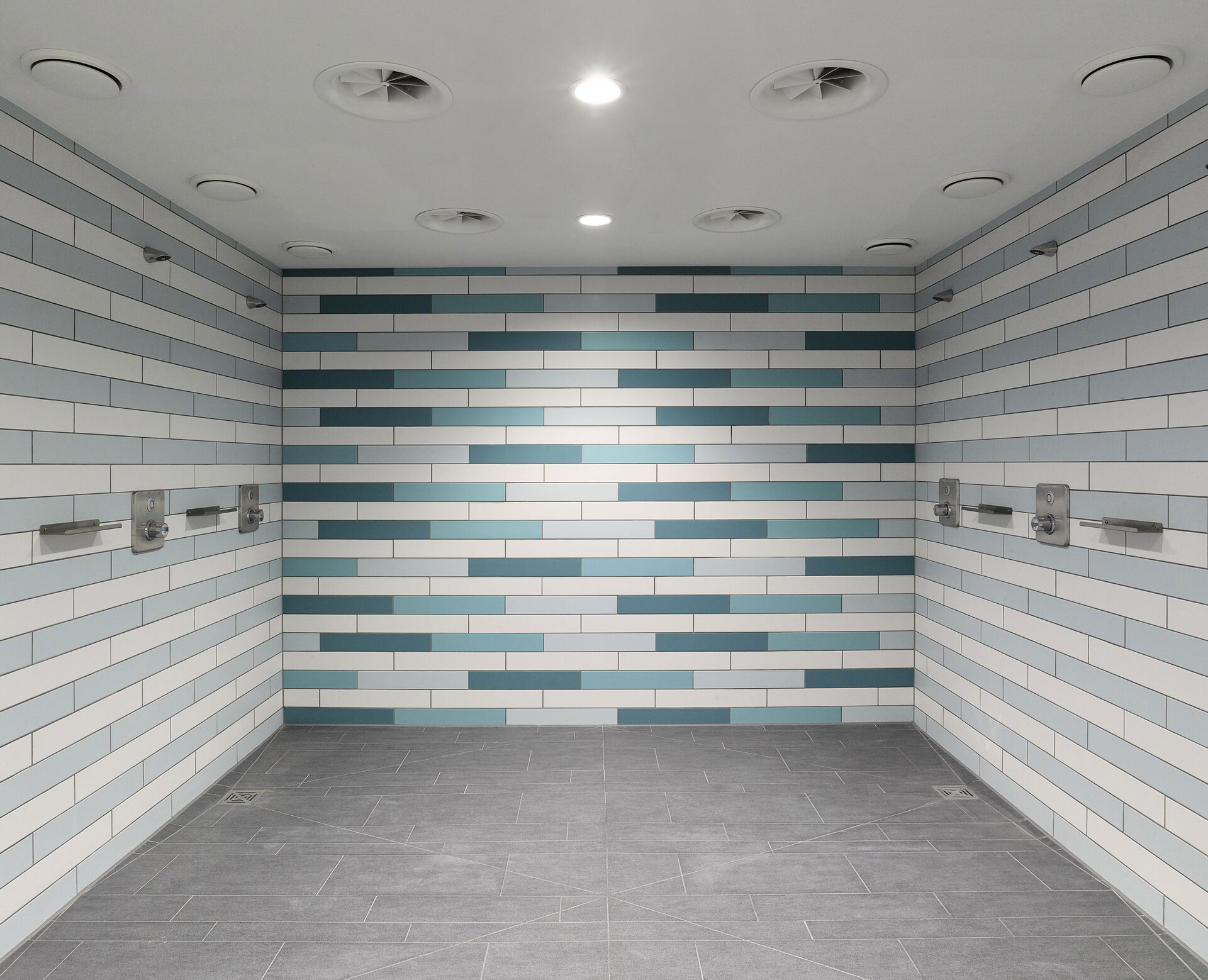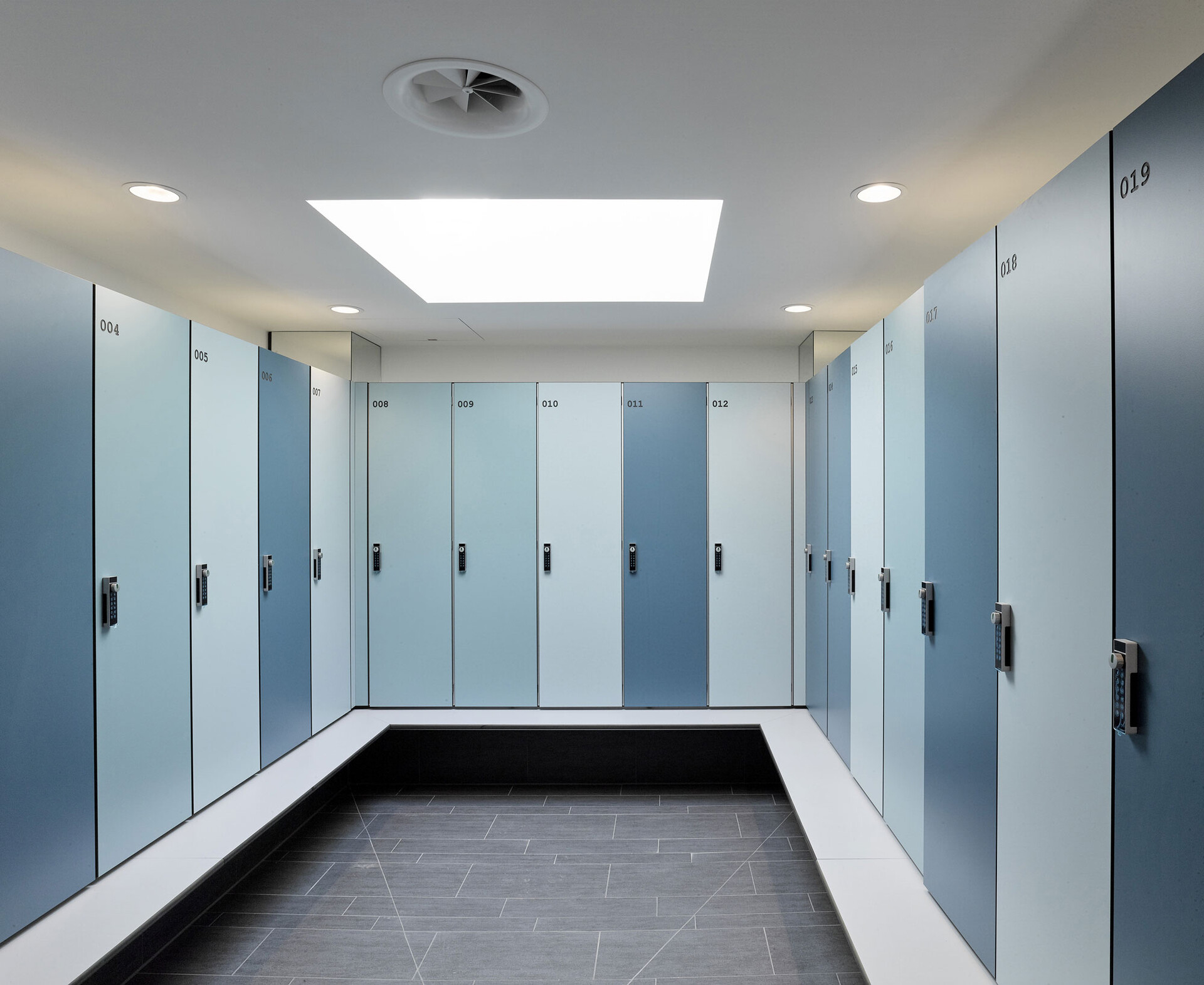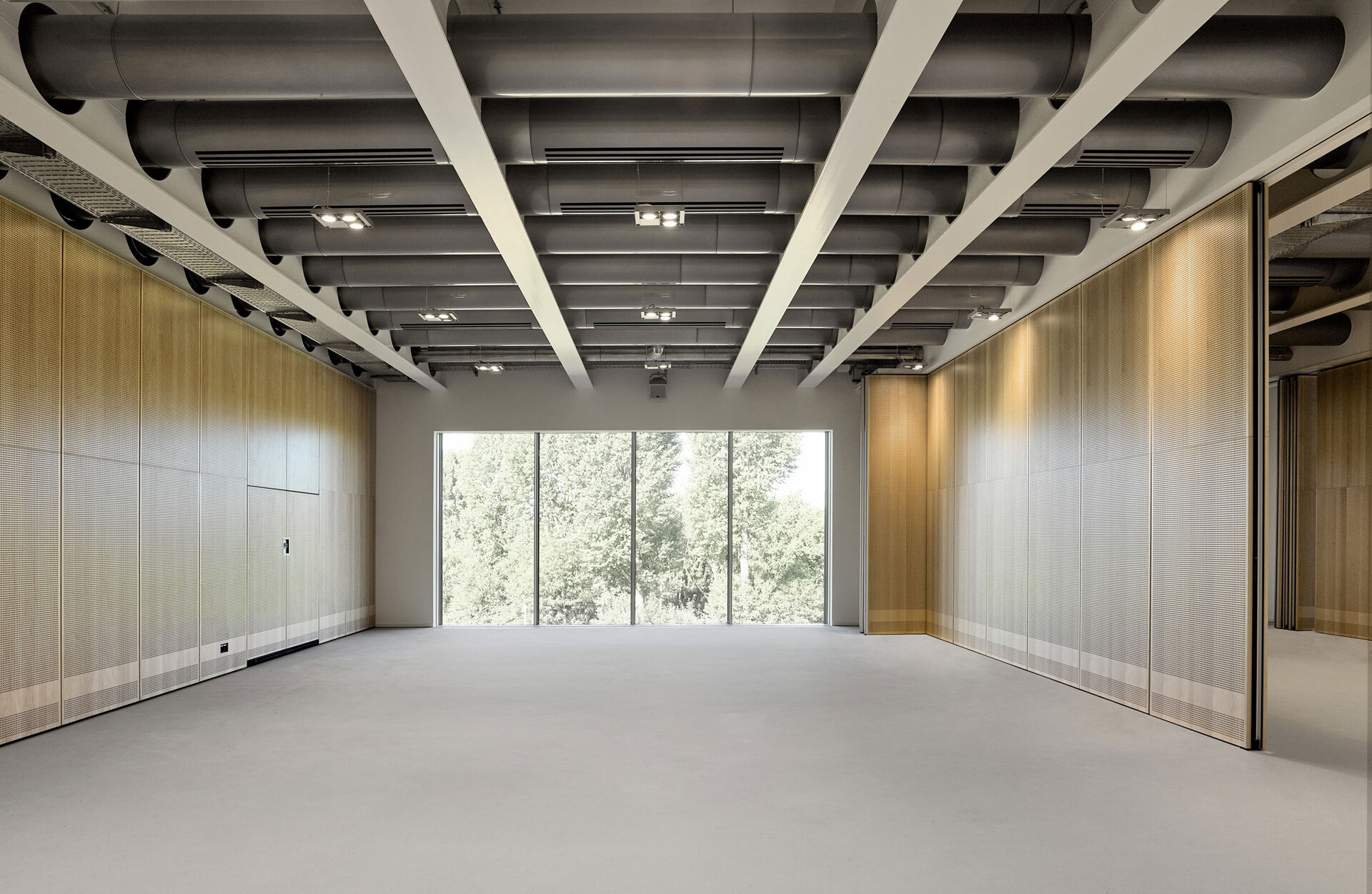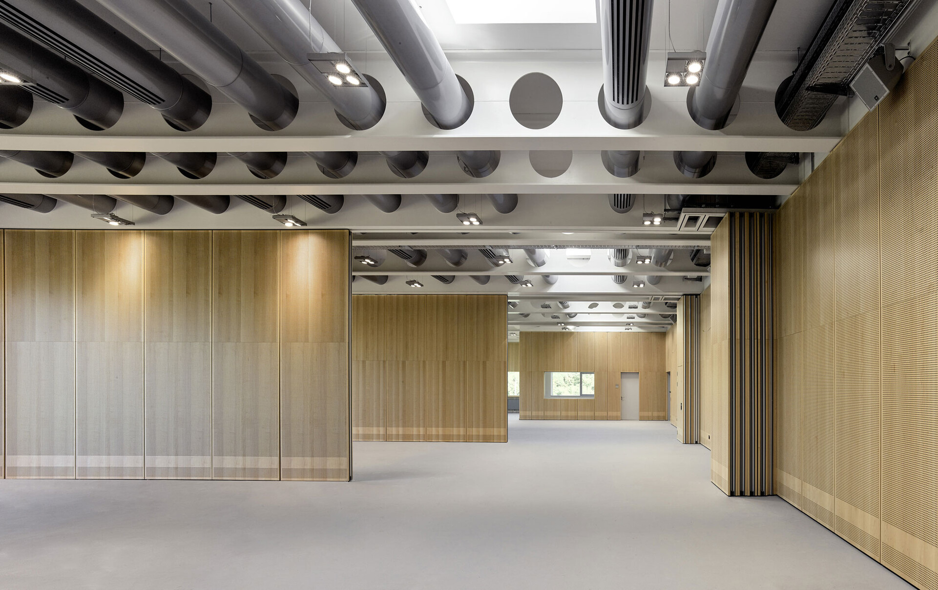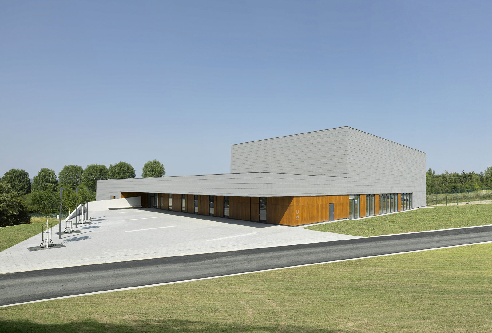 Das Sportzentrum bildet den ersten Bauabschnitt eines Gebäudeensembles für unterschiedliche Trainings- und Ausbildungszwecke im Landkreis Calw. Schlichte Anmutung prägt den Gebäudekomplex in Form und Materialität. Das spiegelt den hohen funktionalen Charakter des Neubaus – Sport, Training und Ausbildung stehen hier im Fokus. Von außen definieren zwei markante Gebäudevolumen das Sportzentrum: Der zur Straßenfront aufragende Kubus umfasst die große Schwimmhalle für das Schwimm- und Tauchtraining. Ein rückwärtig anschließender Baukörper bildet sich durch das abfallende Gelände nach unten ab und umfasst auf zwei Ebenen Trainingshallen für Kraft- und Ausdauertraining. Dazwischen ist ein Verbindungsbau mit Funktions-, Technik- und Nebenräumen integriert, der die unterschiedlichen Bereiche über ein weiträumiges und lichtdurchflutetes Treppenhaus miteinander verbindet. Der leicht zurückversetzte Eingangsbereich zur Straßenseite löst die monolithische Strenge des mit grauen Schindeln verkleideten Baukörpers formal auf. Einen weiteren Akzent setzt hier der Materialwechsel – ein Band aus Holzelementen und verglasten Öffnungen markiert die Eingangssituation. Dieses gestalterische Element wiederholt sich durchgängig bei Gebäudeöffnungen. Sämtliche Bereiche zeichnen sich bei hoher Funktionalität durch eine angenehme Atmosphäre aus: Das mehrgeschossige, offen gestaltete Treppenhaus, die von allen Seiten mit Licht durchflutete Sportbadehalle, der zweigeschossige Saunabereich mit verglastem Ruheraum sowie die Trainingshallen mit ihrer umlaufenden Holzverkleidung wirken einladend und bieten zugleich optimale Trainingsbedingungen. Die Halle im Eingangsgeschoss lässt sich durch ihre hochwertige Ausstattung und der flexiblen Raumaufteilung zudem als Veranstaltungs- und Versammlungsraum nutzen.