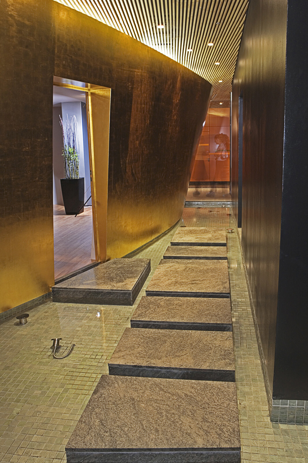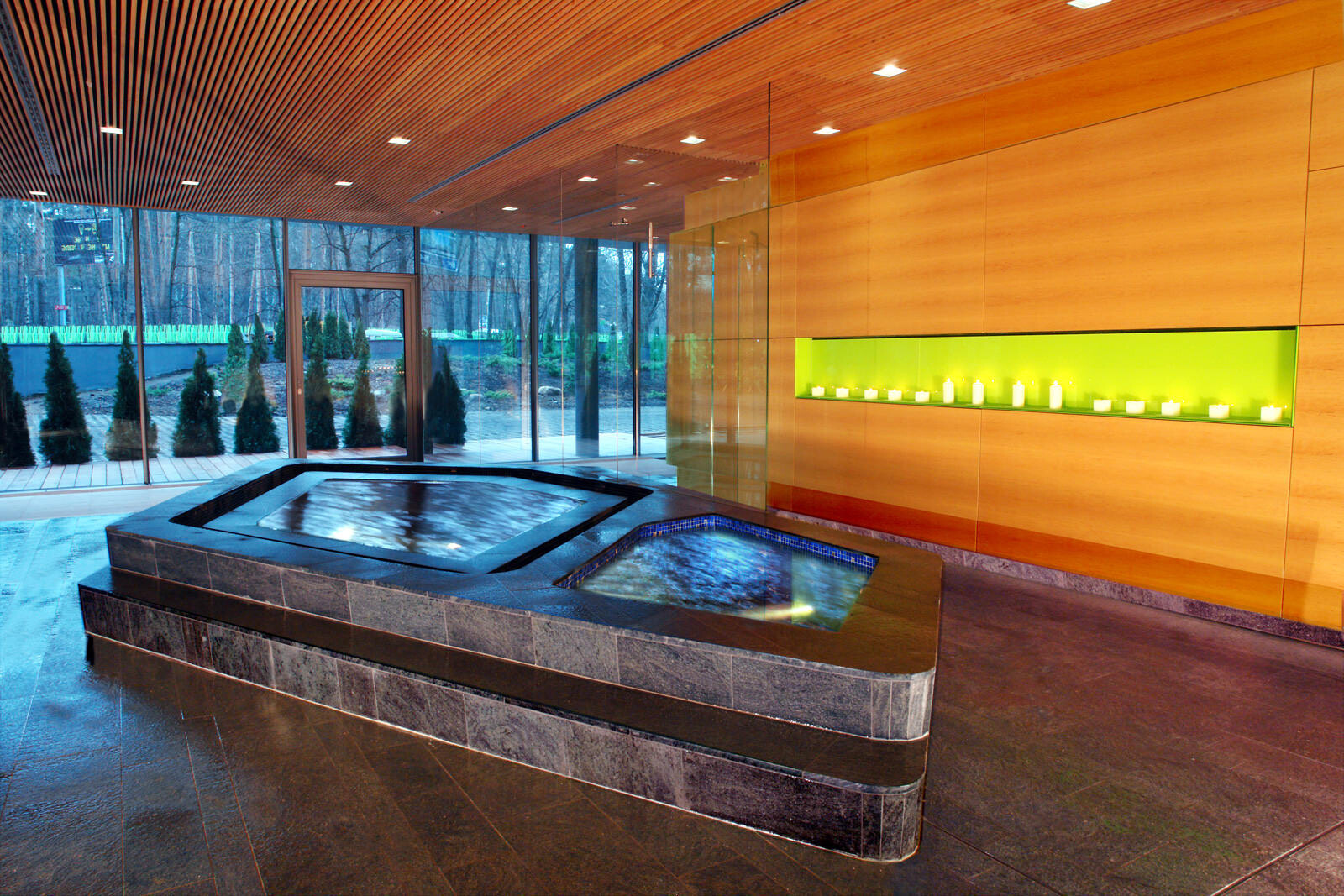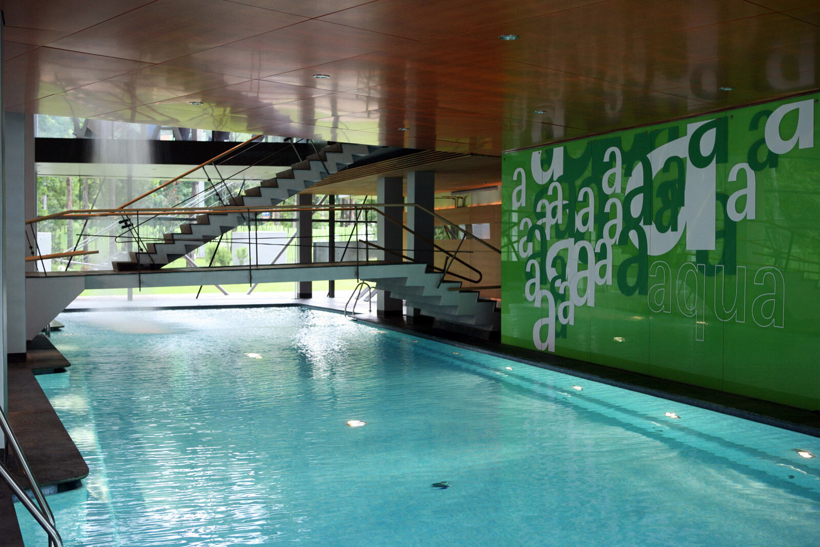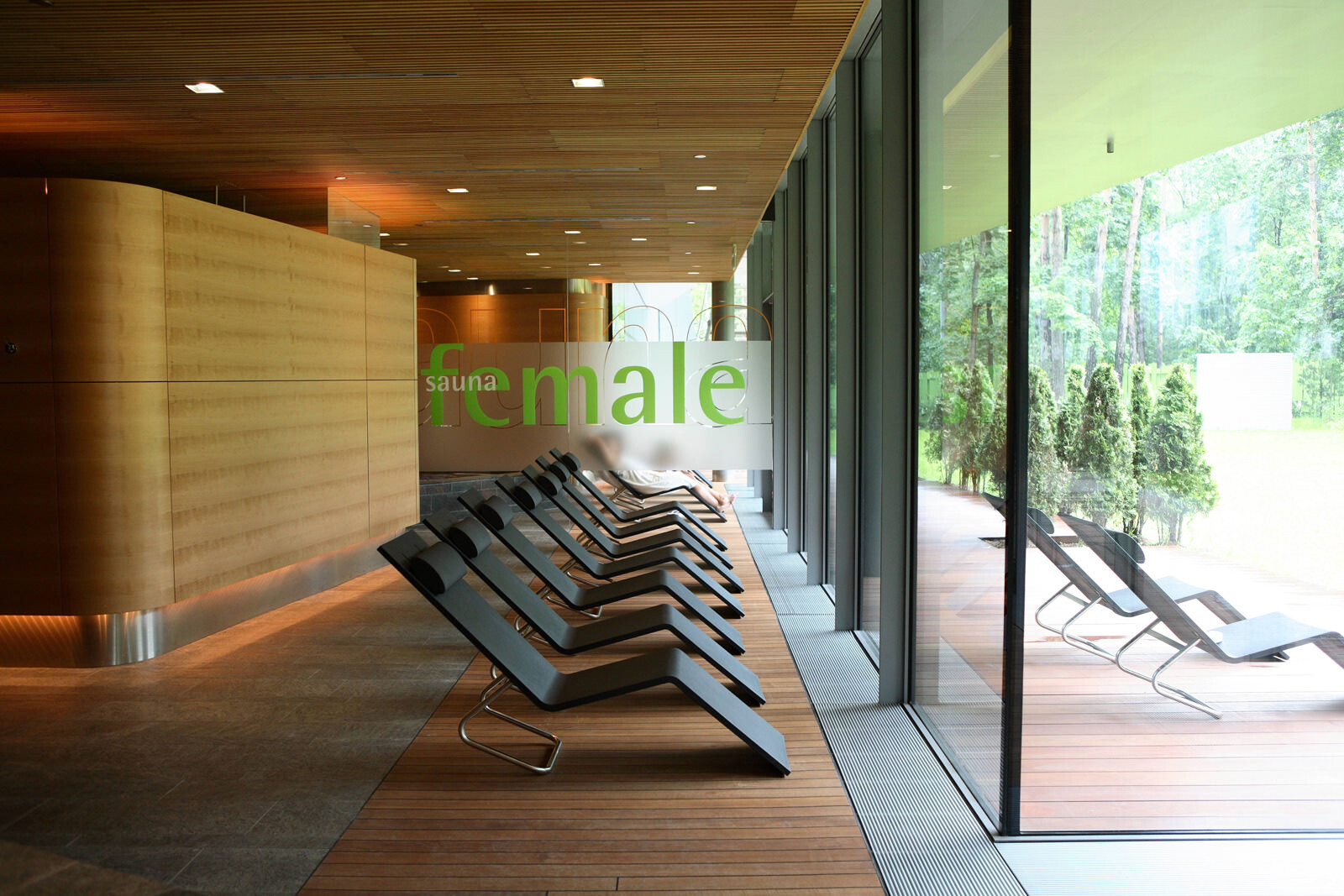 Der Wellnesspark befindet sich in den beiden unteren Ebenen eines 25-geschossigen Wohnhochhauses. Als formaler Ausdruck dieser anderen Nutzung löst sich der Wellnessbereich architektonisch vom darüber liegenden Wohngebäude: Ein Sockel, im Grundriss größer als die Wohngeschosse, wurde unter das Gebäude geschoben. Die weitgehend transparente Fassadengestaltung stellt einen Bezug zum Außenraum mit teilweise schönem Baumbestand her und macht ihn für den Gast erlebbar. Für großzügigen Charakter im Wellnessbereich sorgen Räume, die fließend ineinander übergehen. So entsteht eine begehbare Raumskulptur, bei der die einzelnen Funktionsbereiche "landschaftlich" miteinander verwoben sind.