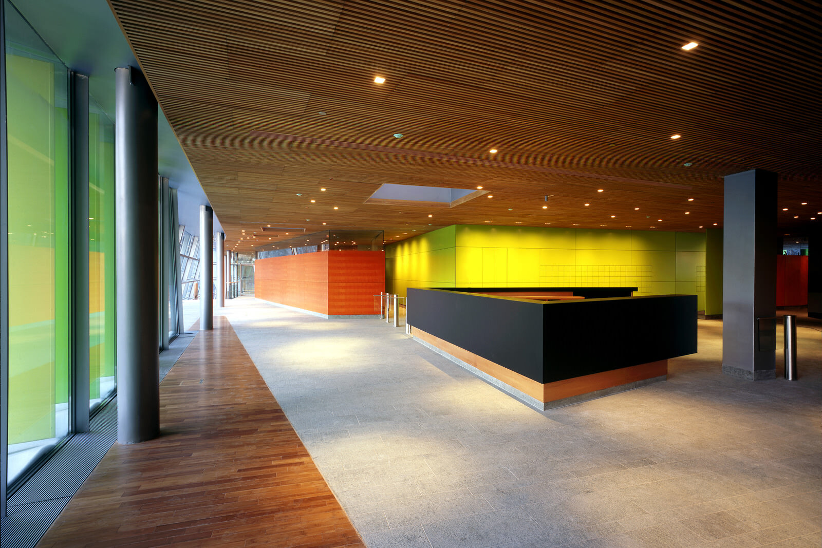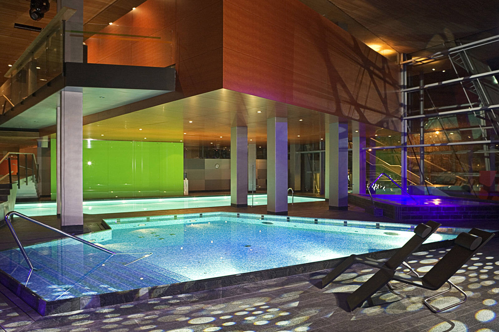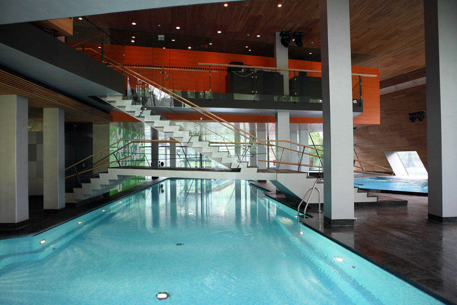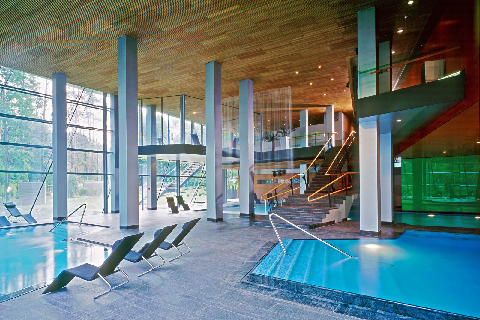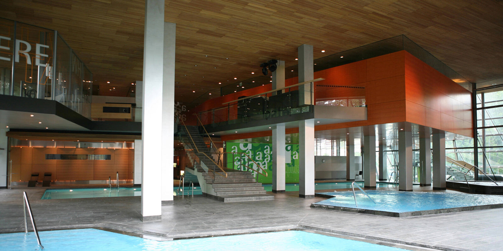 Der Wellnesspark befindet sich in den beiden unteren Ebenen eines 25-geschossigen Wohnhochhauses. Als formaler Ausdruck dieser anderen Nutzung löst sich der Wellnessbereich architektonisch vom darüber liegenden Wohngebäude: Ein Sockel, im Grundriss größer als die Wohngeschosse, wurde unter das Gebäude geschoben. Die weitgehend transparente Fassadengestaltung stellt einen Bezug zum Außenraum mit teilweise schönem Baumbestand her und macht ihn für den Gast erlebbar. Für großzügigen Charakter im Wellnessbereich sorgen Räume, die fließend ineinander übergehen. So entsteht eine begehbare Raumskulptur, bei der die einzelnen Funktionsbereiche "landschaftlich" miteinander verwoben sind.