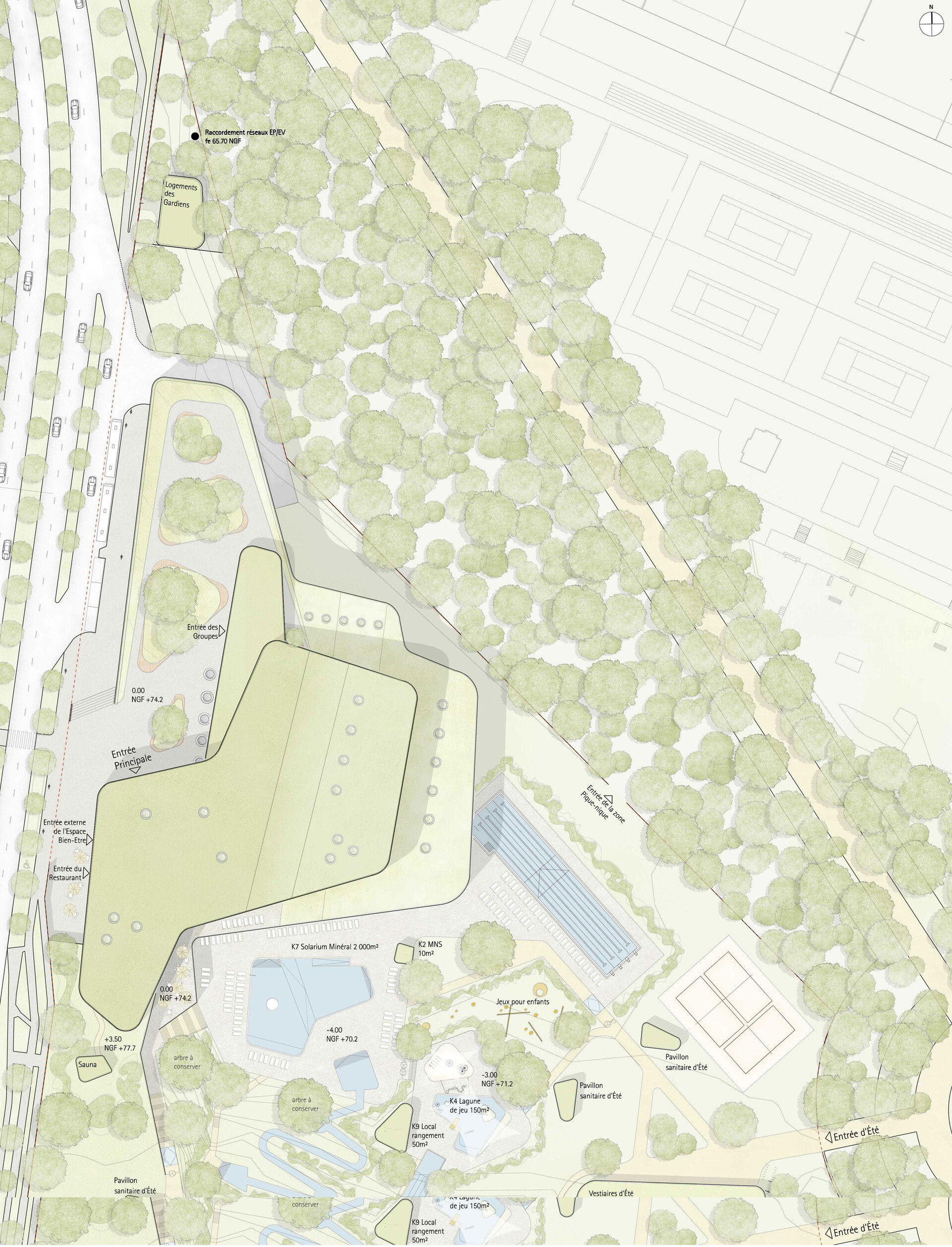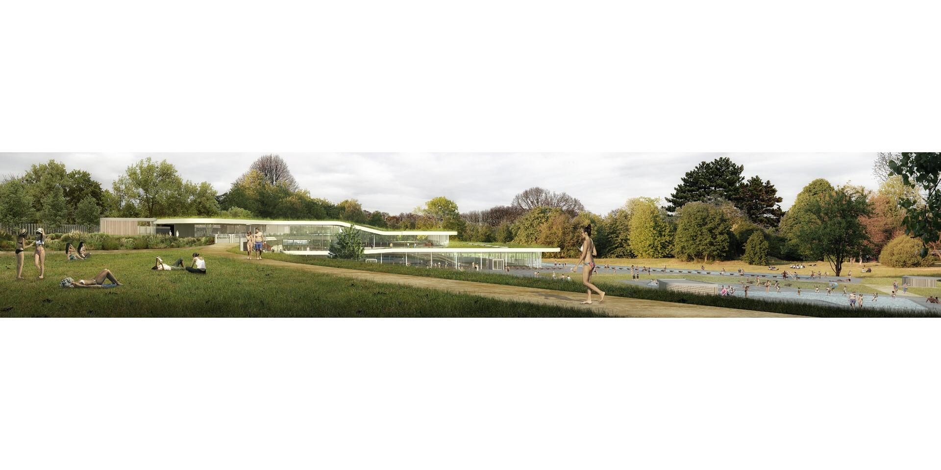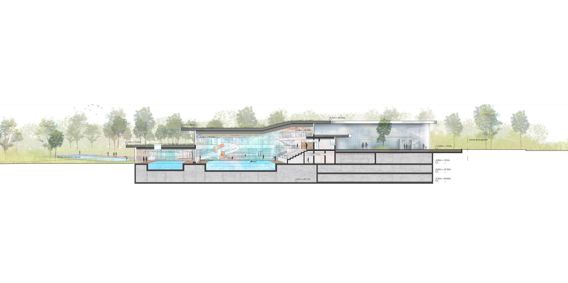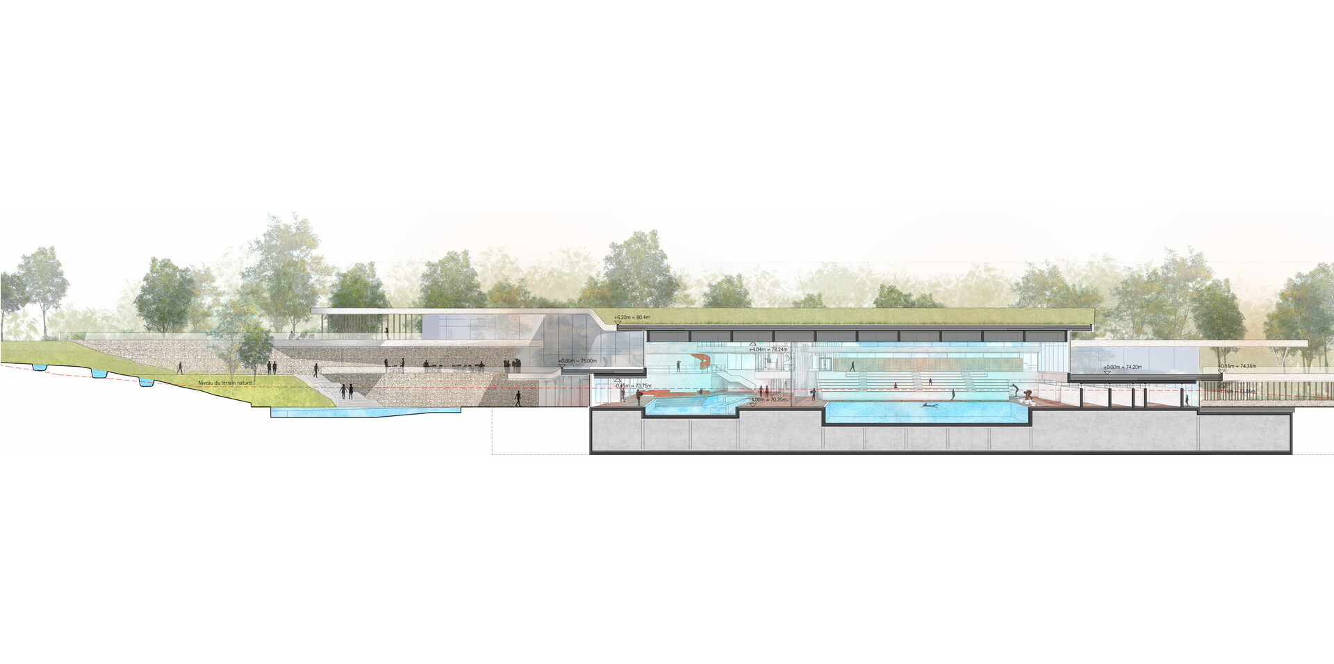 Die behutsame Einbettung des Gebäudes in den Landschaftsraum des Parc de Sceaux war prägendes Entwurfselement bei der Neugestaltung des Schwimmbadkomplexes La Grenouillère im französischen Antony. Das Wasserzentrum umfasst eine Fläche von rund 9.600 m², die im Westen des weitläufigen Geländes sichelförmig entlang der Grundstücksgrenze verläuft. So entsteht ein schützender Rücken zur angrenzenden Sully Prudhomme Avenue. Die restliche Grundstücksfläche bleibt so baulich unberührt und kann als attraktives Außengelände für die Besucher gestaltet werden.