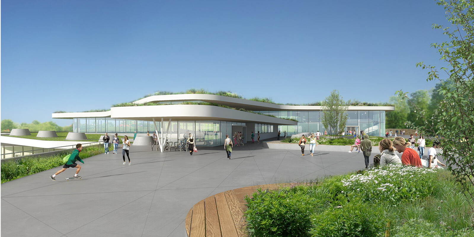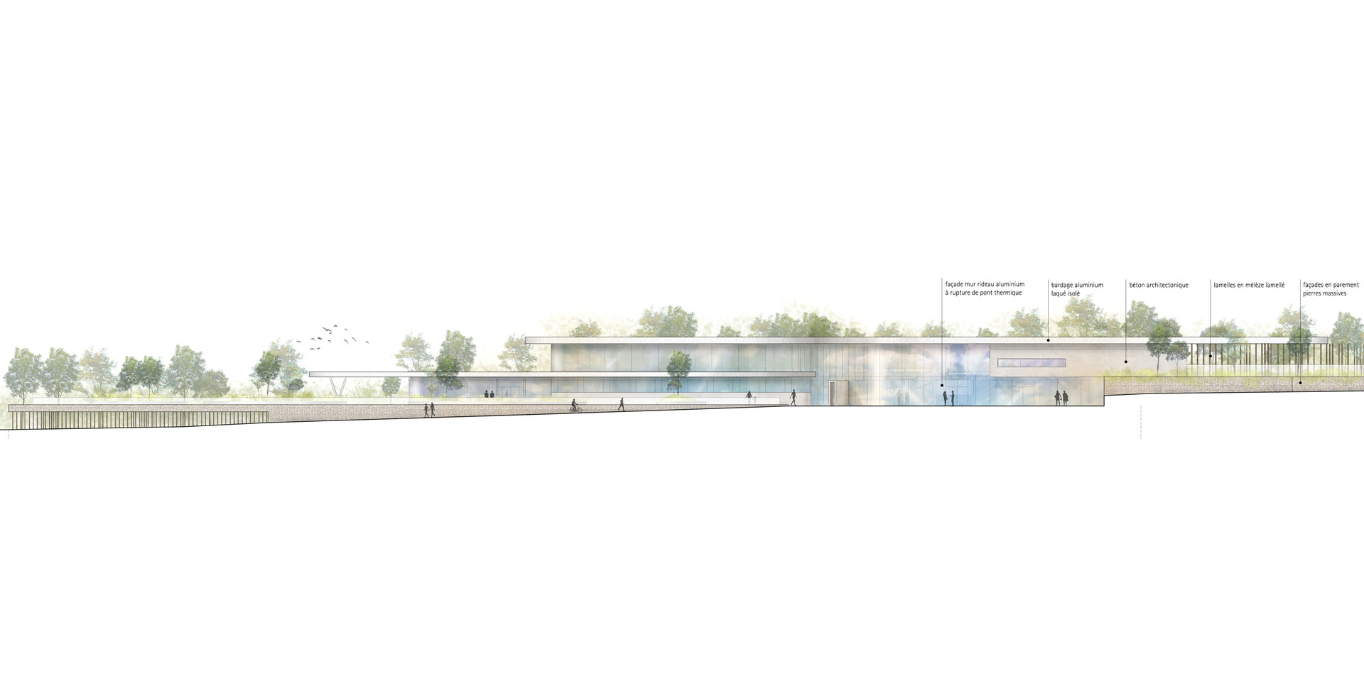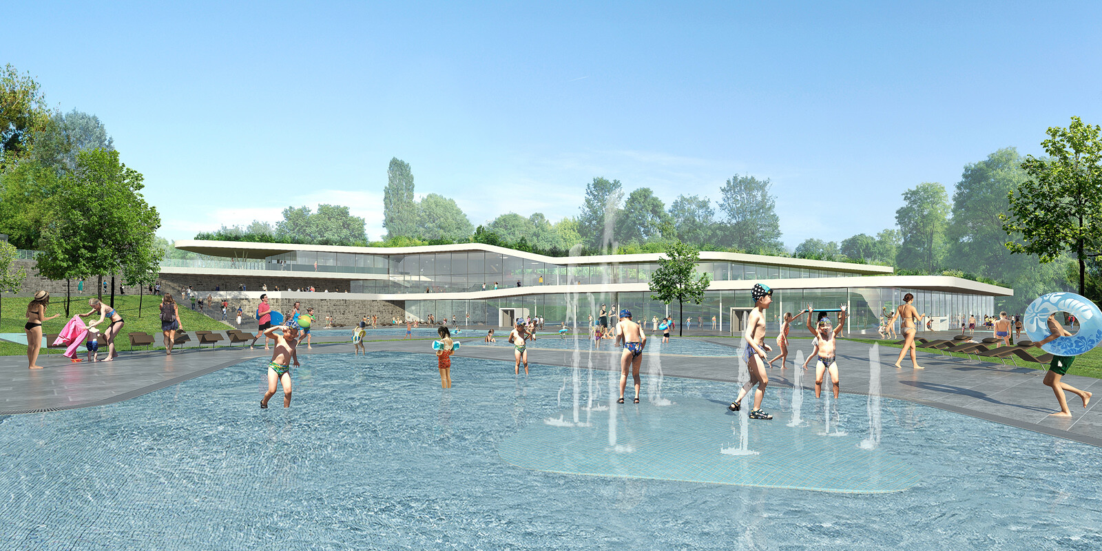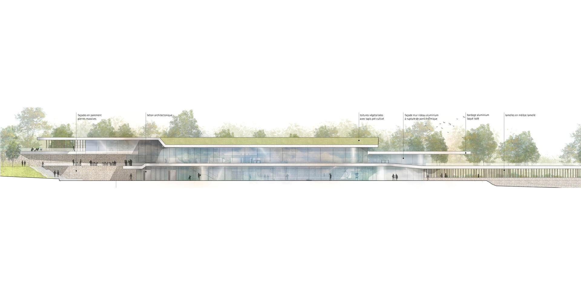 Die behutsame Einbettung des Gebäudes in den Landschaftsraum des Parc de Sceaux war prägendes Entwurfselement bei der Neugestaltung des Schwimmbadkomplexes La Grenouillère im französischen Antony. Das Wasserzentrum umfasst eine Fläche von rund 9.600 m², die im Westen des weitläufigen Geländes sichelförmig entlang der Grundstücksgrenze verläuft. So entsteht ein schützender Rücken zur angrenzenden Sully Prudhomme Avenue. Die restliche Grundstücksfläche bleibt so baulich unberührt und kann als attraktives Außengelände für die Besucher gestaltet werden.