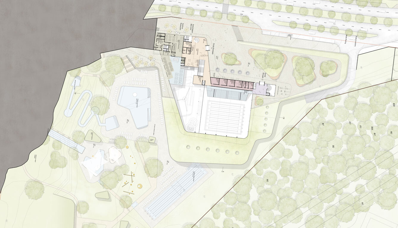 Formal besteht der Komplex aus zwei weit gespannten Gebäudeachsen, die behutsam die Topografie des Geländes aufgreifen und sich schrittweise auflösen. Die weitgehend transparente Gestaltung nach Süden sorgt für lichtdurchflutete Räume und öffnet das Gebäude großflächig hin zum Landschaftspark. Die Badehallen gehen scheinbar fließend in den Außenraum über. Dabei greifen die abgerundeten Ecken der Fassadenflächen die Wellenbewegungen des Wassers auf.