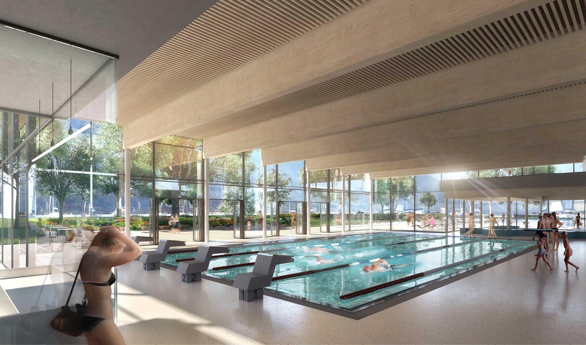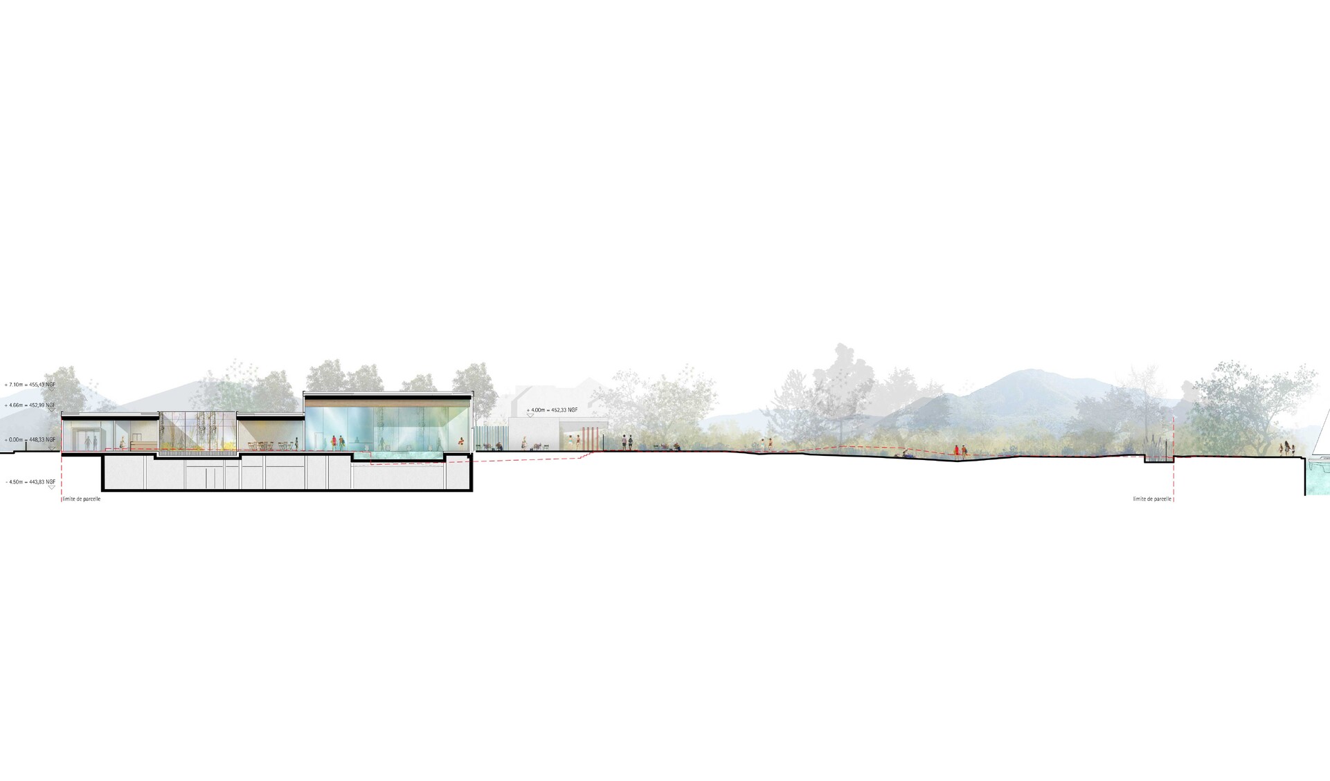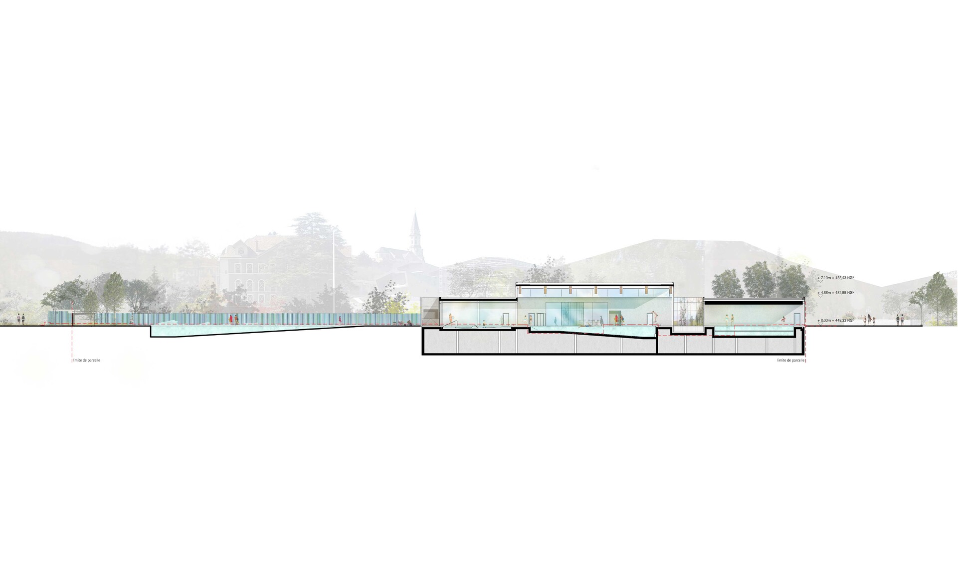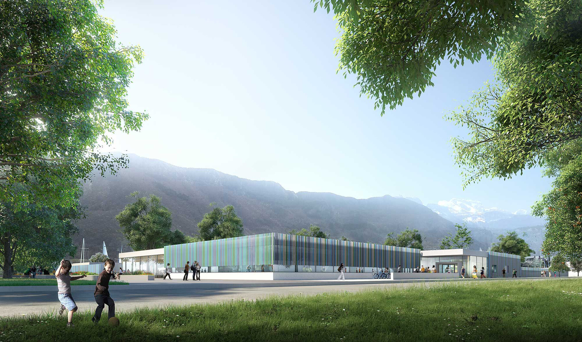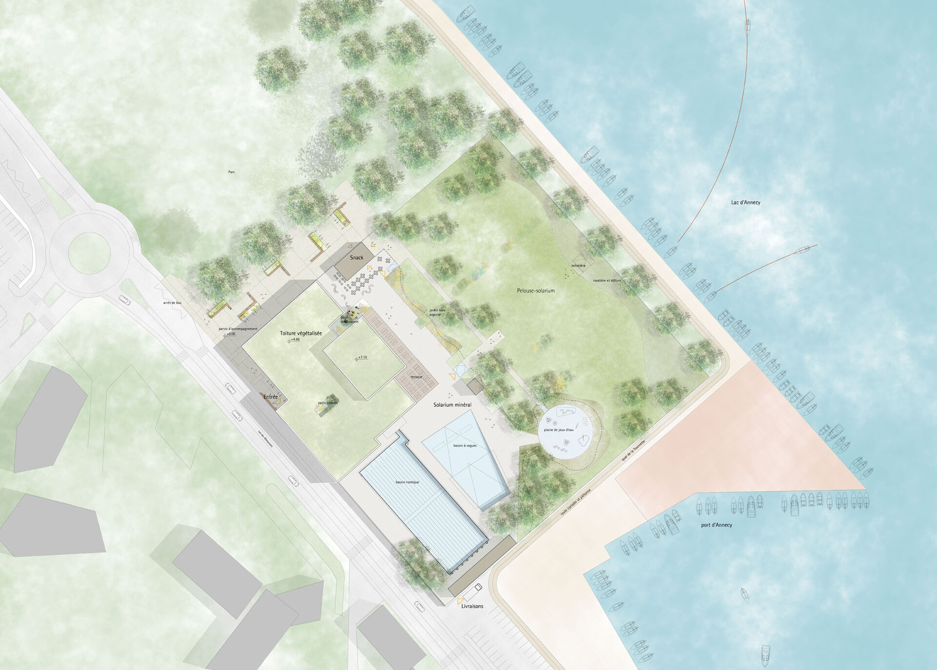 Das Grundstück für das neue Freizeitbad in Annecy besticht durch seine außergewöhnliche Lage: Auf der einen Seite der Rue des Marquisats befindet sich das historische Stadtzentrum, gegenüber schließt unmittelbar der Uferbereich des Lac d'Annecy an. Um diesen einzigartigen Landschaftsraum mit freiem Blick auf die Bergwelt zu wahren, wurde die Architektur schlicht und zurückhaltend gestaltet. Transparenz, Licht und Natur sind die zentralen Gestaltungelemente für den Wettbewerbsentwurf des Erlebnisbades. Die einfachen Volumen mit klaren Linien, transparenten Fassaden und begrünten Dachflächen fügen sich behutsam und maßvoll in die besondere Umgebung ein.
