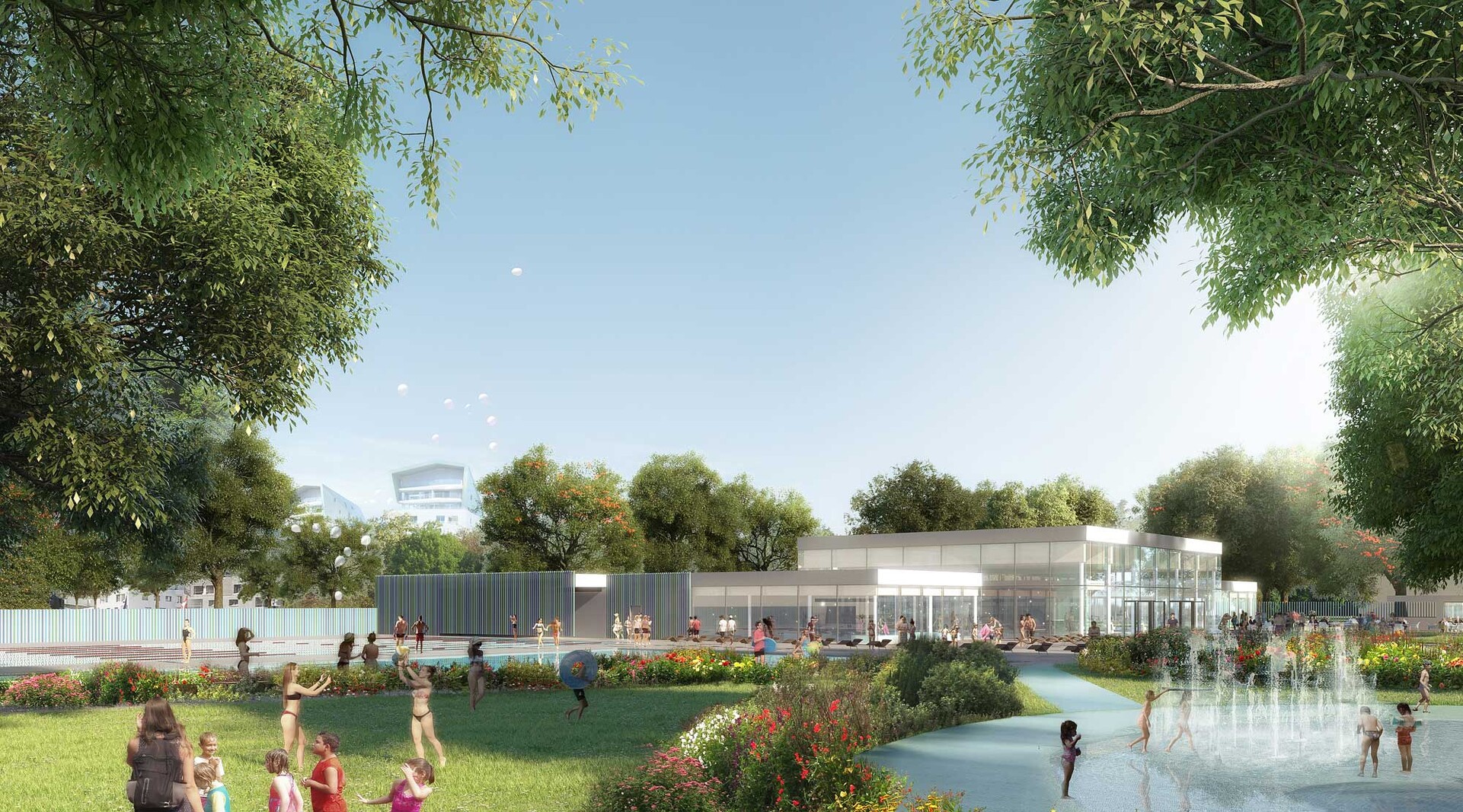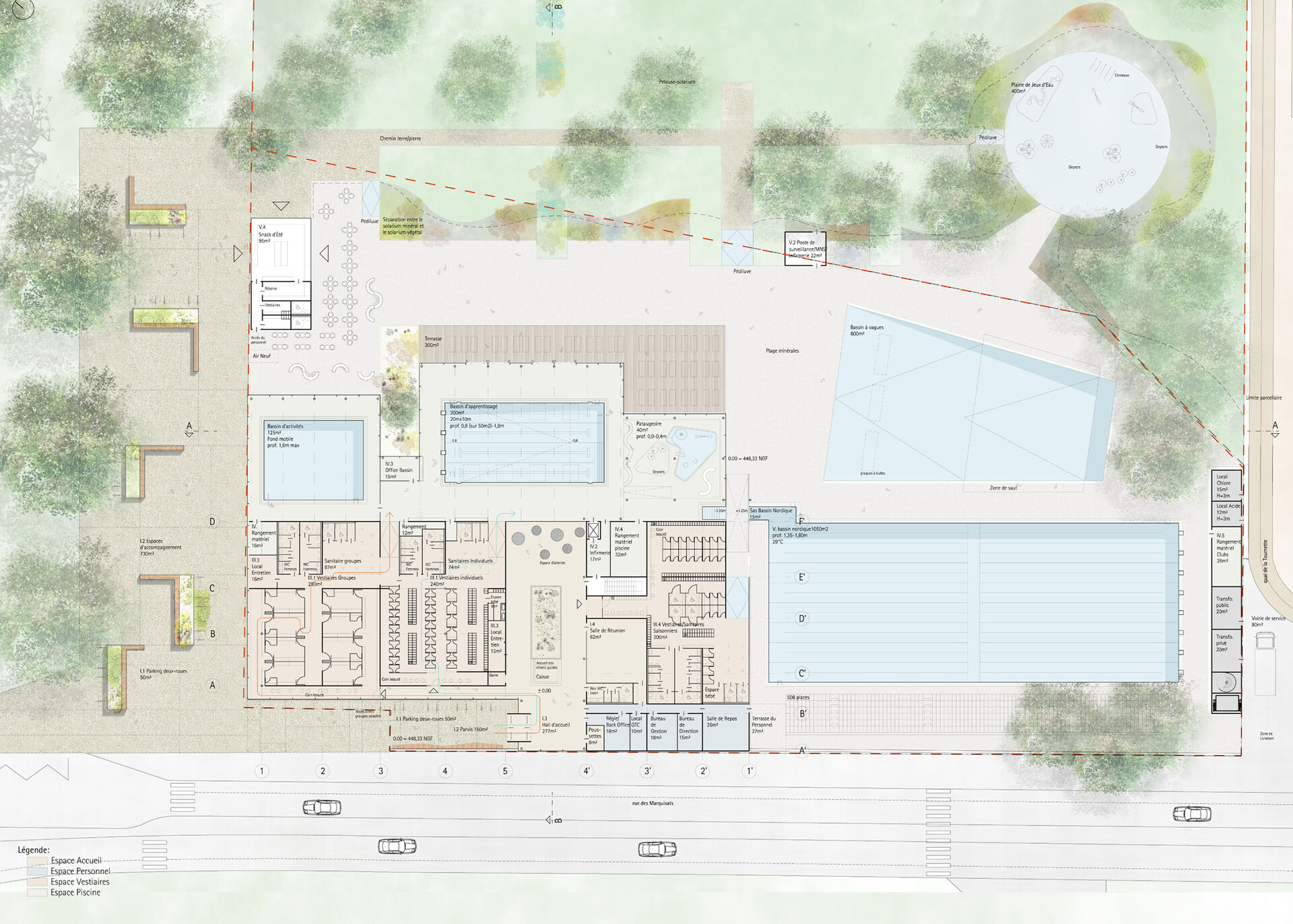 Durch die Platzierung im Westen des Grundstücks ist das Bad gut erreichbar, ganz gleich ob man zu Fuß vom Stadtzentrum oder der zukünftigen Tiefgarage, mit dem Bus oder dem Fahrrad kommt. Zugleich bildet das neue Gebäude einen attraktiven Blickpunkt an der Rue des Marquisats, schützt Parkraum und Uferbereich vor Einblicken und schirmt den Straßenlärm ab. Dieser Effekt wird durch den teilweisen Erhalt der bestehenden Steinmauer und der Bäume im Süden des Grundstücks verstärkt. Vom Vorplatz aus kann der Besucher durch das gesamte Gebäude blicken - vom Eingangsbereich mit verglastem Atrium über die Badehalle durch den Park bis hin zum See.